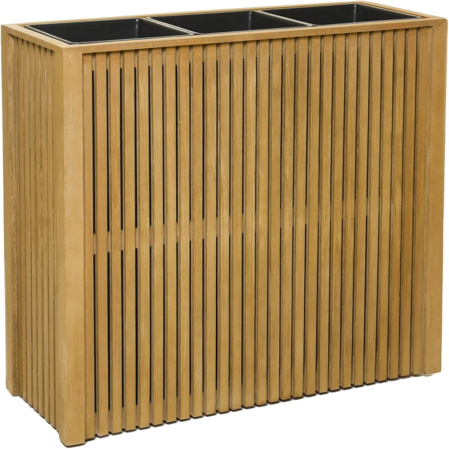Die braunen Streben aus Echtholz verleihen dem Pflanzentopf eine natürliche Wärme, die ein angenehmes Wohngefühl erzeugt. Das Echtholz sorgt nicht nur für eine ästhetische Optik, sondern bringt auch die Schönheit der Natur in Ihr Zuhause. Der Raumteiler ist besonders praktisch und flexibel dank der vier Rollen am Boden des Kübels. Diese Rollen ermöglichen es, den Pflanzkübel mühelos zu bewegen und ihn genau dort zu platzieren, wo er benötigt wird. So können Sie Ihre Raumgestaltung jederzeit anpassen. Ein passender Pflanzkübel-Einsatz wird direkt mitgeliefert und dezent in den Pflanzentopf eingelassen. Dies ermöglicht ein sofortiges Bepflanzen, ohne dass zusätzliche Einsätze oder Vorbereitungen notwendig sind. Der Einsatz fügt sich nahtlos in das Design des Pflanzkübels ein und sorgt für eine harmonische Optik. Der natürliche Pflanzkübel ist ideal für den Innenbereich geeignet. Er kann jedoch auch in vor Witterungen geschützten Außenbereichen, wie einer überdachten Terrasse, genutzt werden. Dies macht ihn zu einem vielseitigen Element, das sowohl drinnen als auch draußen für eine grüne Atmosphäre sorgt. Mit einer Размер von 83 x 32 x 75 cm (Breite x Tiefe x Höhe) bietet der Pflanzkübel ausreichend Platz für verschiedene Pflanzen. Die Einsätze mit den Maßen 26 x 26 x 24 cm (jeweils Breite x Tiefe x Höhe) ermöglichen eine vielfältige Bepflanzung und tragen zur flexiblen Gestaltung Ihrer grünen Oase bei.