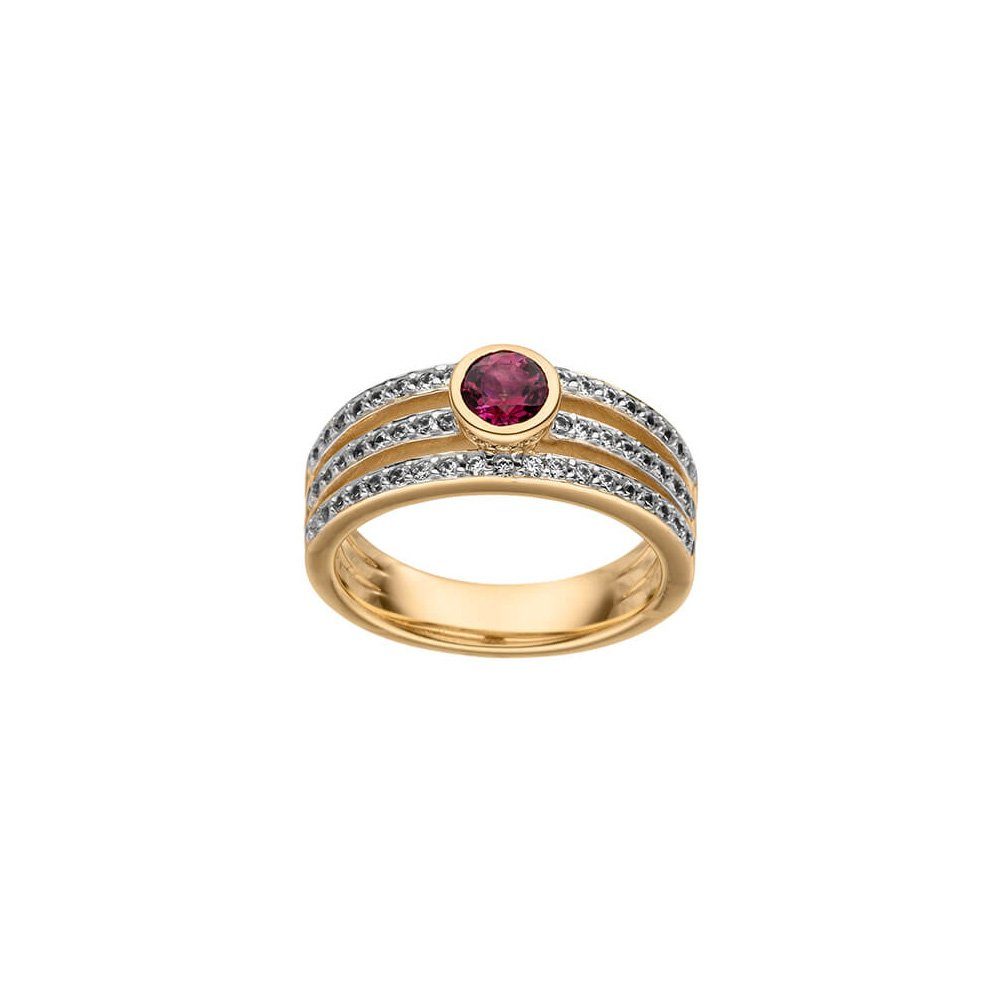 Insgesamt 54 Swarovski Zirkonias, gefasst in drei Reihen und in der Mitte roter Topaz machen den Ring zum funkelnden Hingucker.