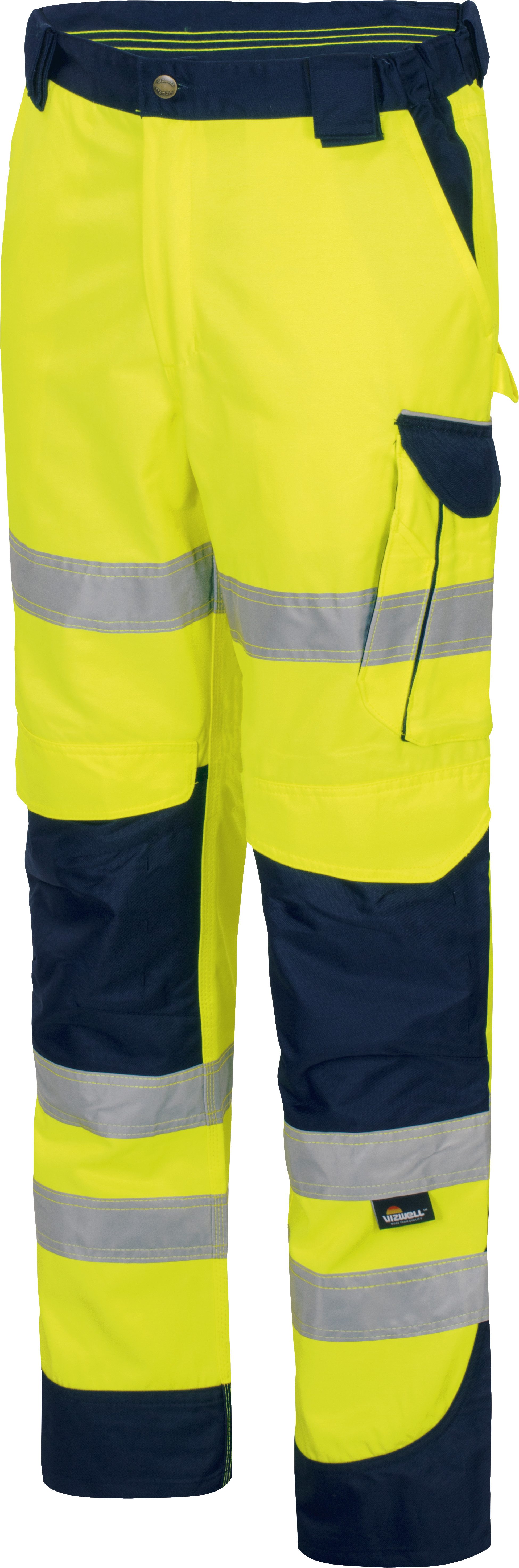 DIN EN ISO 20471:2013 Klasse 2, DIN EN ISO 13688, Reflexpaspel an den Patten, je 3 x 5 cm breite Reflektorstreifen umlaufend an den Hosenbeinen, Reflexpaspel an den Patten, Bund seitlich mit Gummizug, innen mit Antirutschstepp, 5 breite Gürtelschlaufen, Hosenschlitz mit Qualitätsreißverschluss, Patten mit Klettverschluss, Kontrasteinsätze in marineblau, Taschen: 2 Eingriffstaschen, 2 verstärkte Gesäßtaschen mit Zierstepp, Cargotasche mit 4 Fächern am linken Bein, Hammerschlaufe am linken Bein, doppelte Maßstabtasche am rechten Bein, praktische, Knietasche aus 600D/PU Oxford-Material mit Patte für separate Kniepolster, Material: 60 % Baumwolle, 40 % Polyester, 270 g/m²