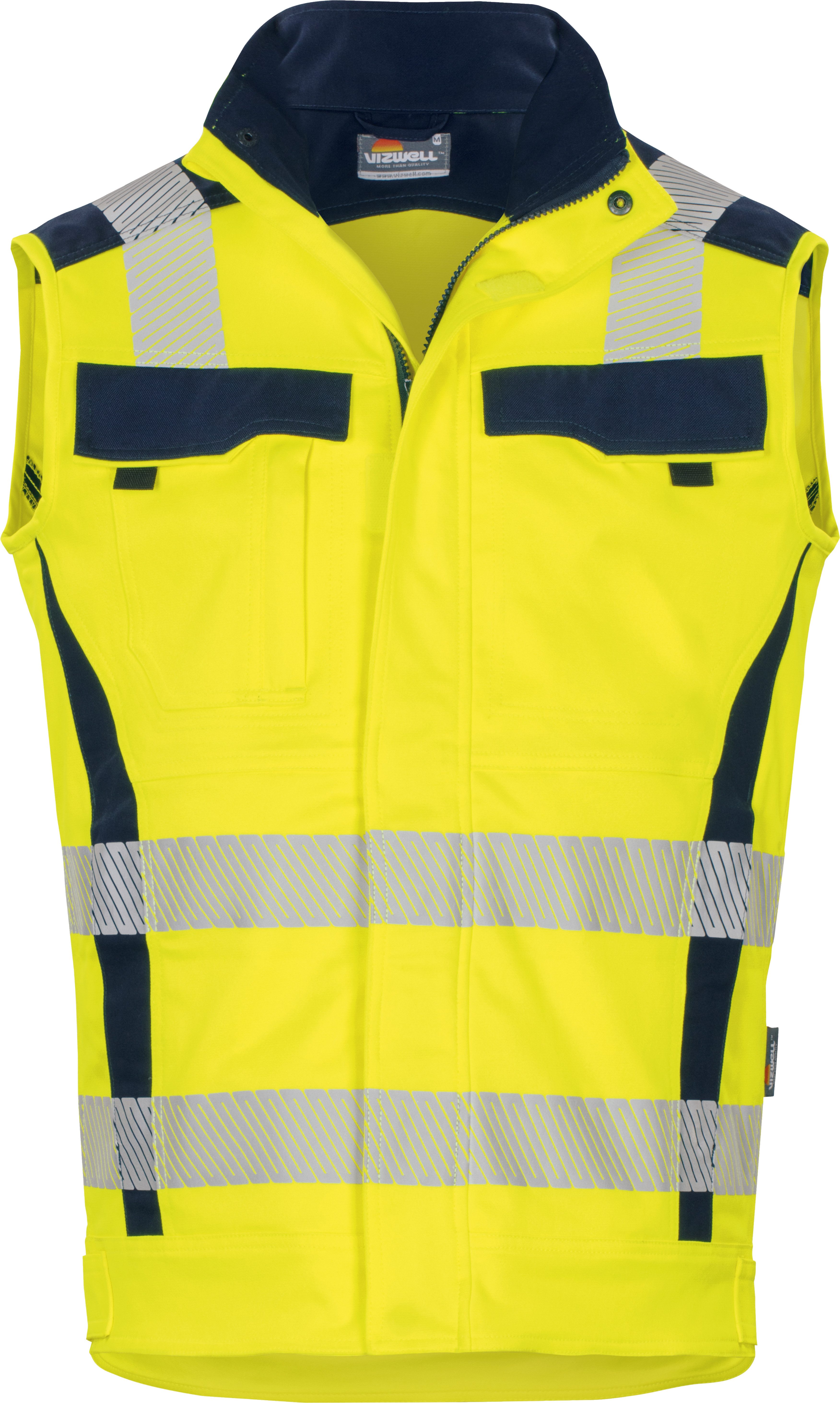 DIN EN ISO 20471:2013 + A1:2016 Klasse 2 (Размер XS + S: Klasse 1), DIN EN ISO 13688:2013, mit elastischer Faser EME400 - für beste Formstabilität bei höchster Bewegungsfreiheit, Patten aus 600D/PU Oxford-Material, 2 x 5 cm breite Reflektorstreifen umlaufend am Rumpf sowie je 1 x 5 cm an den Schultern, segmentiert für höhere Dehnbarkeit, Frontreißverschluss und Blende mit Klett, verstellbarer Jackensaum mit verlängertem Rückenteil, Patten mit Klettverschluss, Kontrasteinsätze in marineblau, Taschen: 2 Brusttaschen, eine davon mit verdeckter Reißverschluss-Tasche, 2 Eingriffstaschen mit Reißverschluss und großzügigem Taschenbeutel, linke Innenbrusttasche mit Reißverschluss und Namensschild, Innendokumententaschen Material: 60 % Polyester (recycelt), 20 % Elastomultiester, 20 % Baumwolle, 245 g/m²