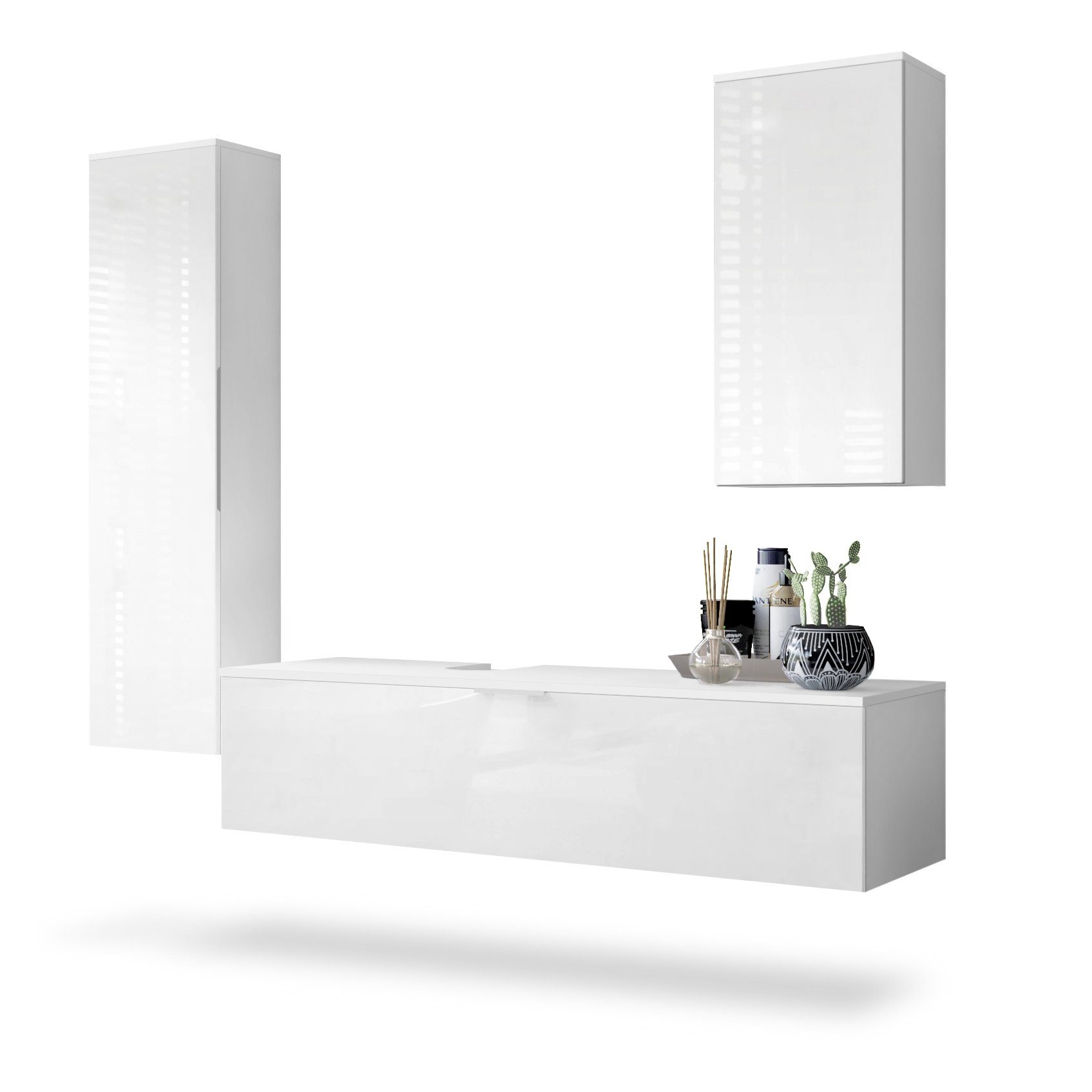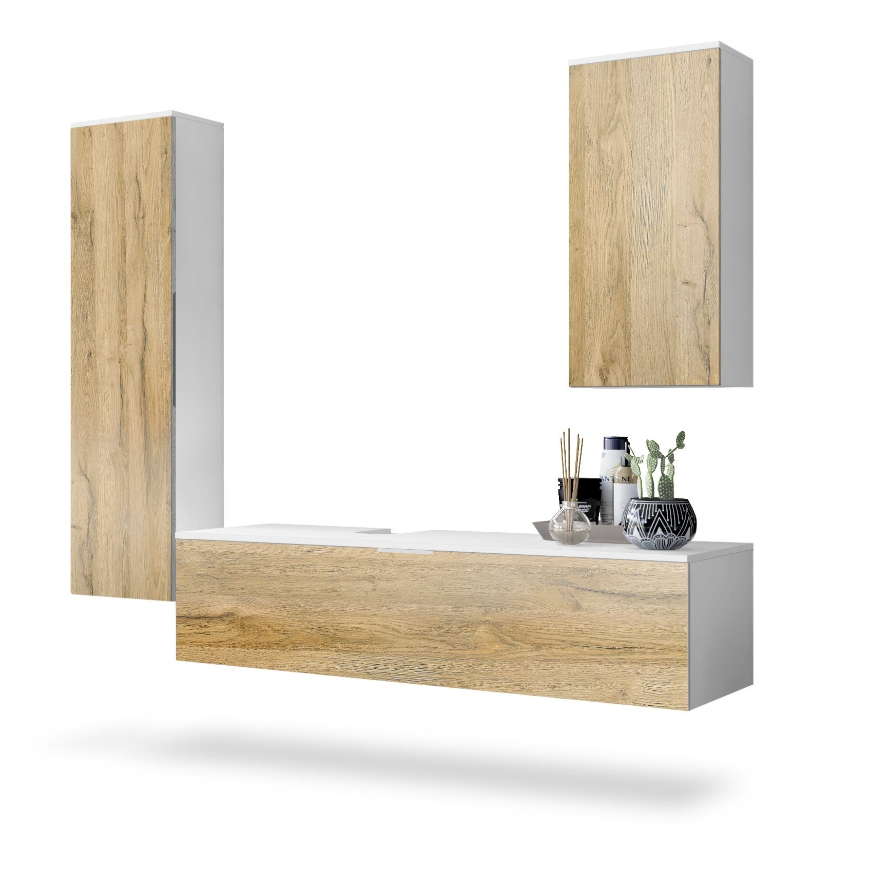 Das Komplettset besteht aus einem hängenden Waschbeckenunterschrank und zwei Hängeschränken. Die grifflose Oberfläche der zwei Hängeschränke verleiht dem Badmöbelset einen glatten, sauberen Look.