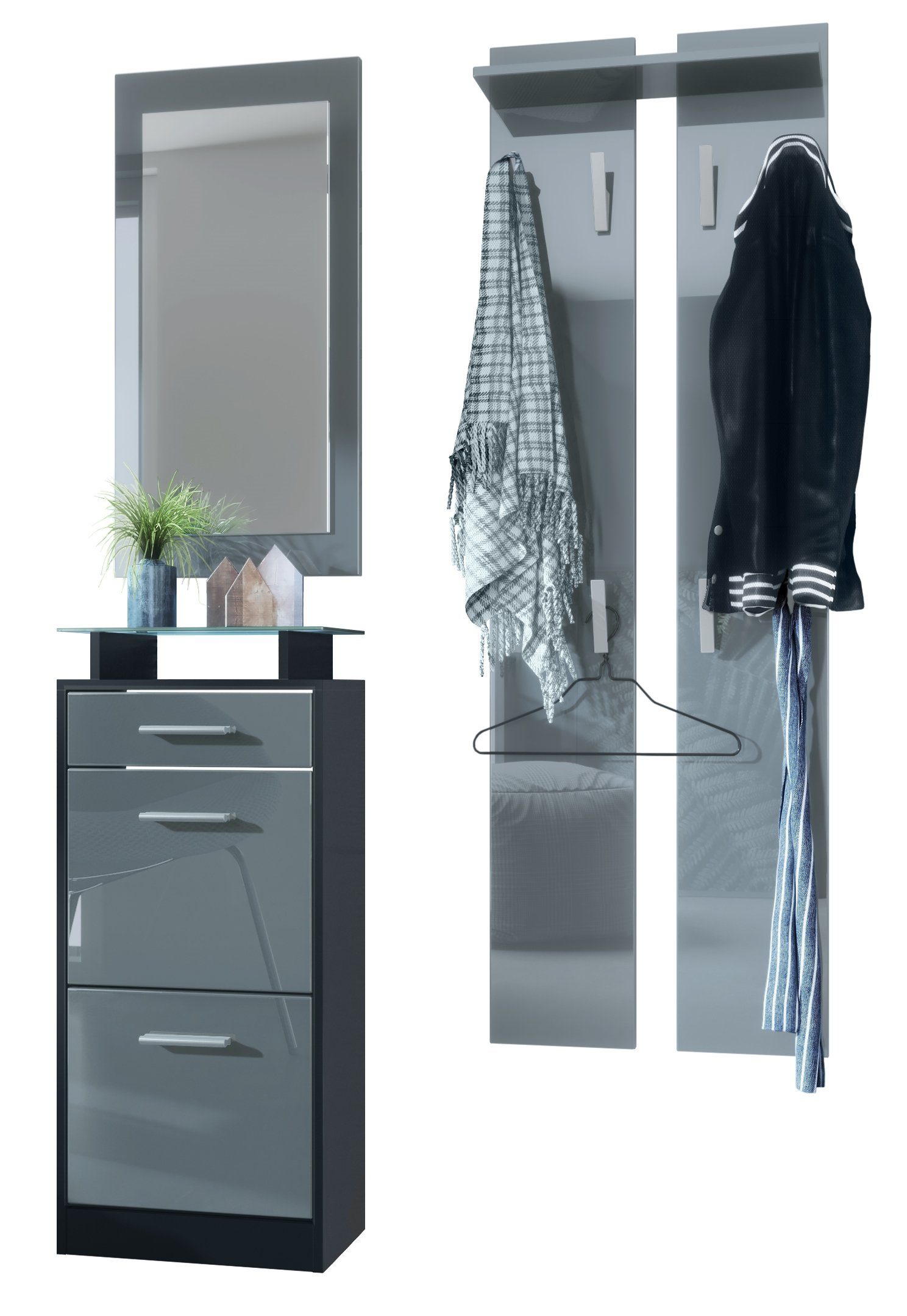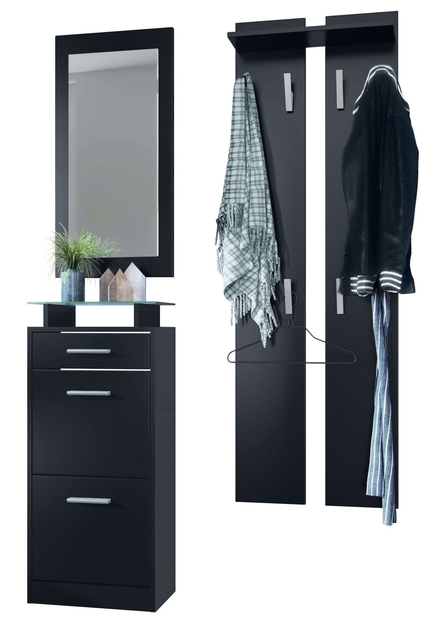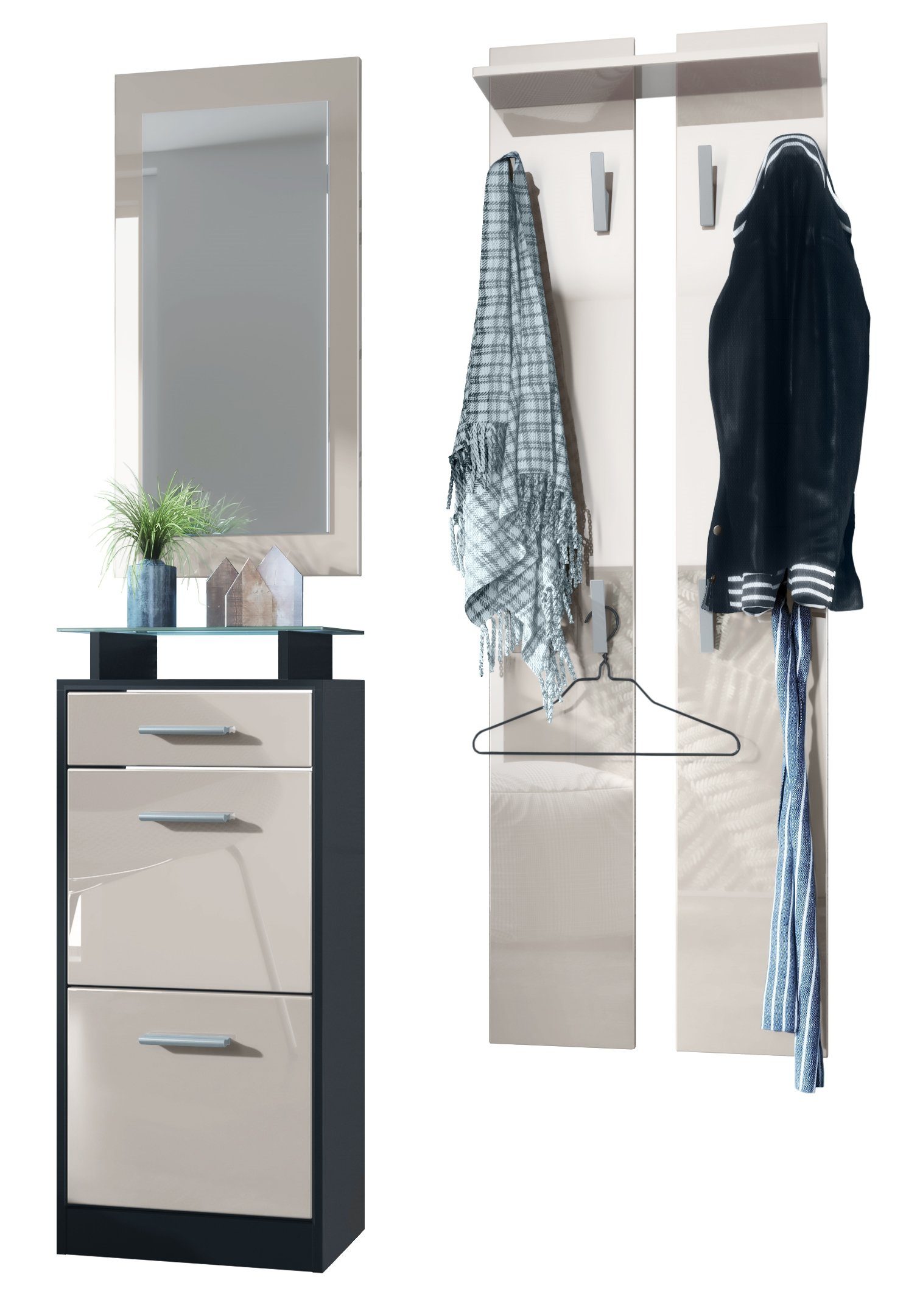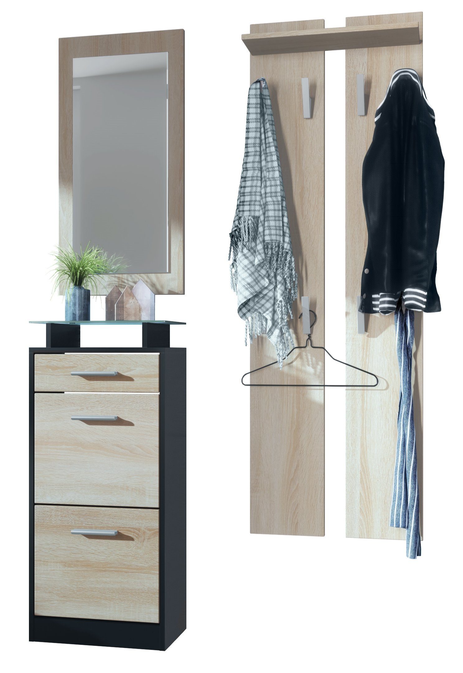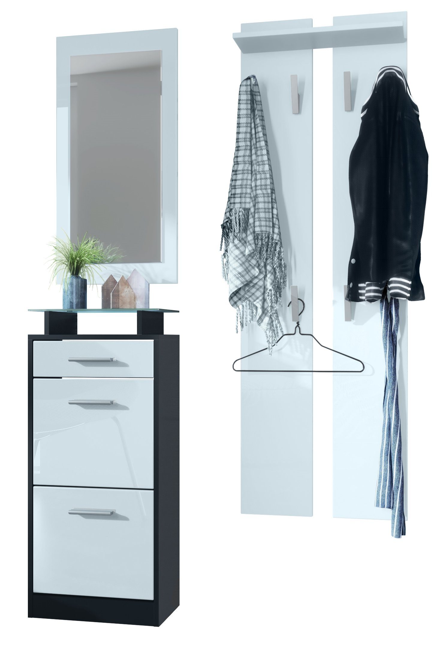 Die moderne Garderobe Loret V2 Mini besteht aus einem Schuhschrank und einem Garderobenpaneel mit stilvollen Haken, perfekt für Ihren Flur oder die Diele. Der Schuhschrank bietet Platz für bis zu 8 Paar Schuhe dank 2 doppelreihiger Kippvorrichtungen. Accessoires finden im leichtgängigen Schubkasten perfekte Aufbewahrung. Jacken und Mäntel lassen sich bequem am Garderobenpaneel abnehmen. Sperrige Accessoires finden auf der praktischen Hutablage Platz. Ein vielseitig montierbarer Spiegel in schicker Rahmenoptik rundet das Garderobenset ab.