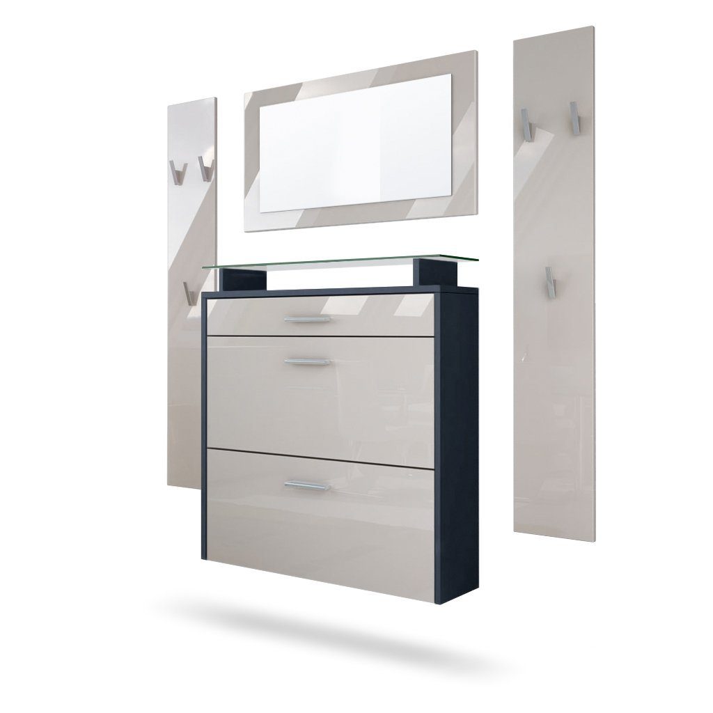 Die moderne Wandgarderobe Malea besteht aus einem Schuhschrank, zwei Garderobenpaneelen mit insgesamt sechs Garderobenhaken und einem zusätzlichen dekorativen Wandspiegel, hergestellt in Deutschland. Все vier Flurmöbel lassen sich individuell zusammenstellen und bieten grenzenlose Gestaltungsmöglichkeiten für Ihren Flur oder die Diele. Der Schuhschrank bietet mit zwei Schuhkippern, einer Schublade und einer Glasablage genug Platz für bis zu 16 Paar Schuhe. Die beiden Wandpaneele bieten für bis zu sechs Jacken und Mäntel ausreichend Platz. Das Garderobenset kann nur hängend platziert werden, Material für die Wandaufhängung ist im Lieferumfang enthalten. Der Schuhschrank enthält keine Rückwand.