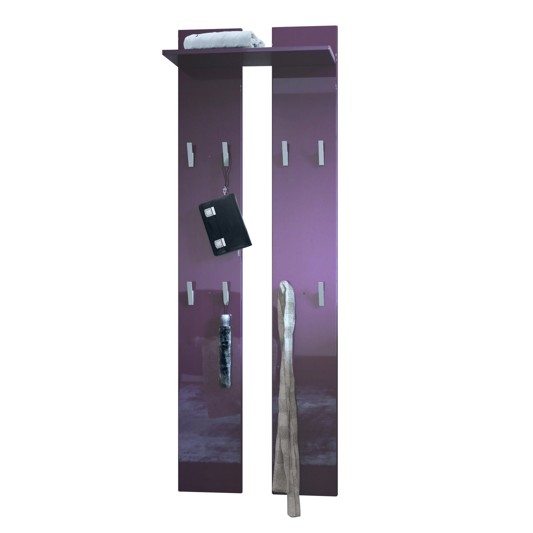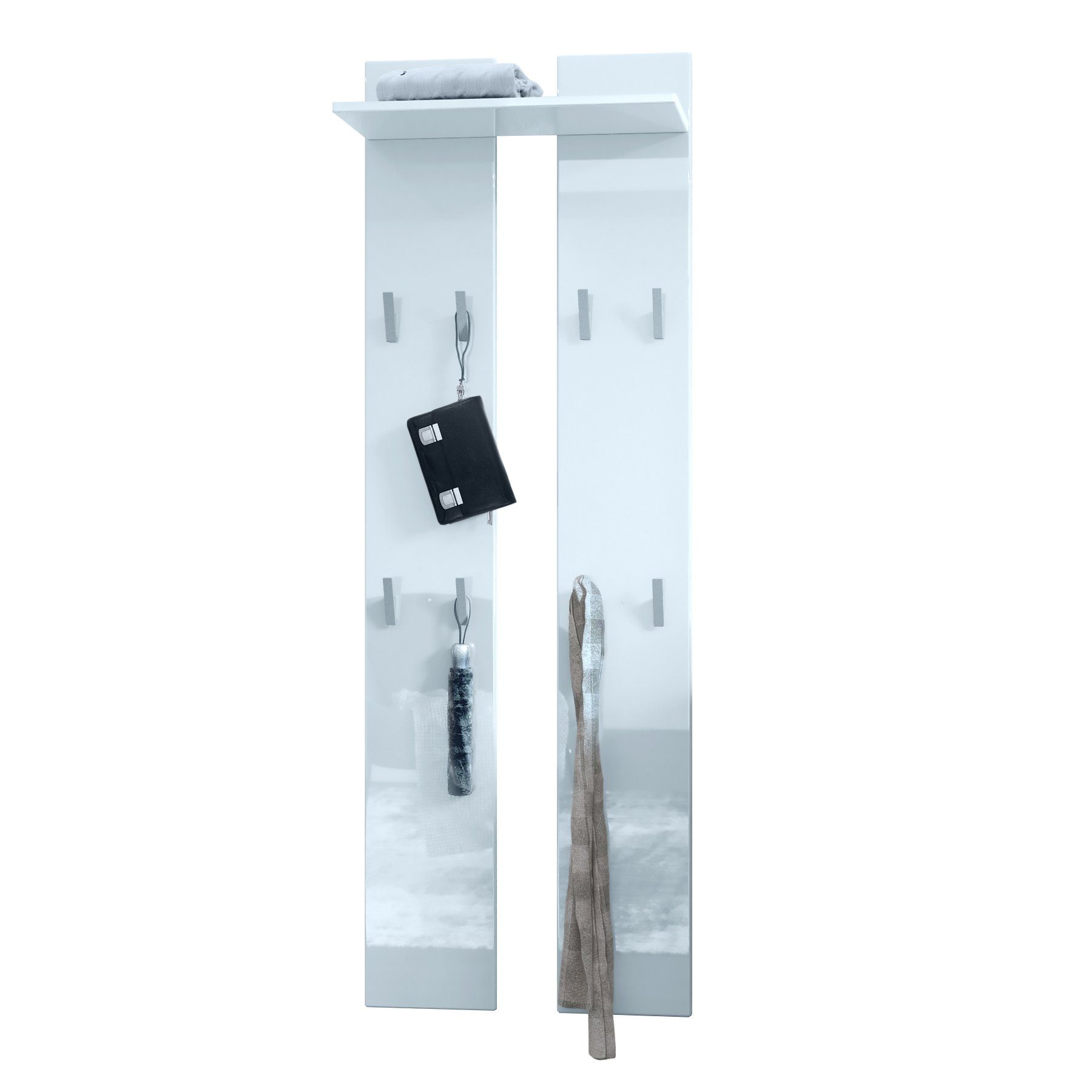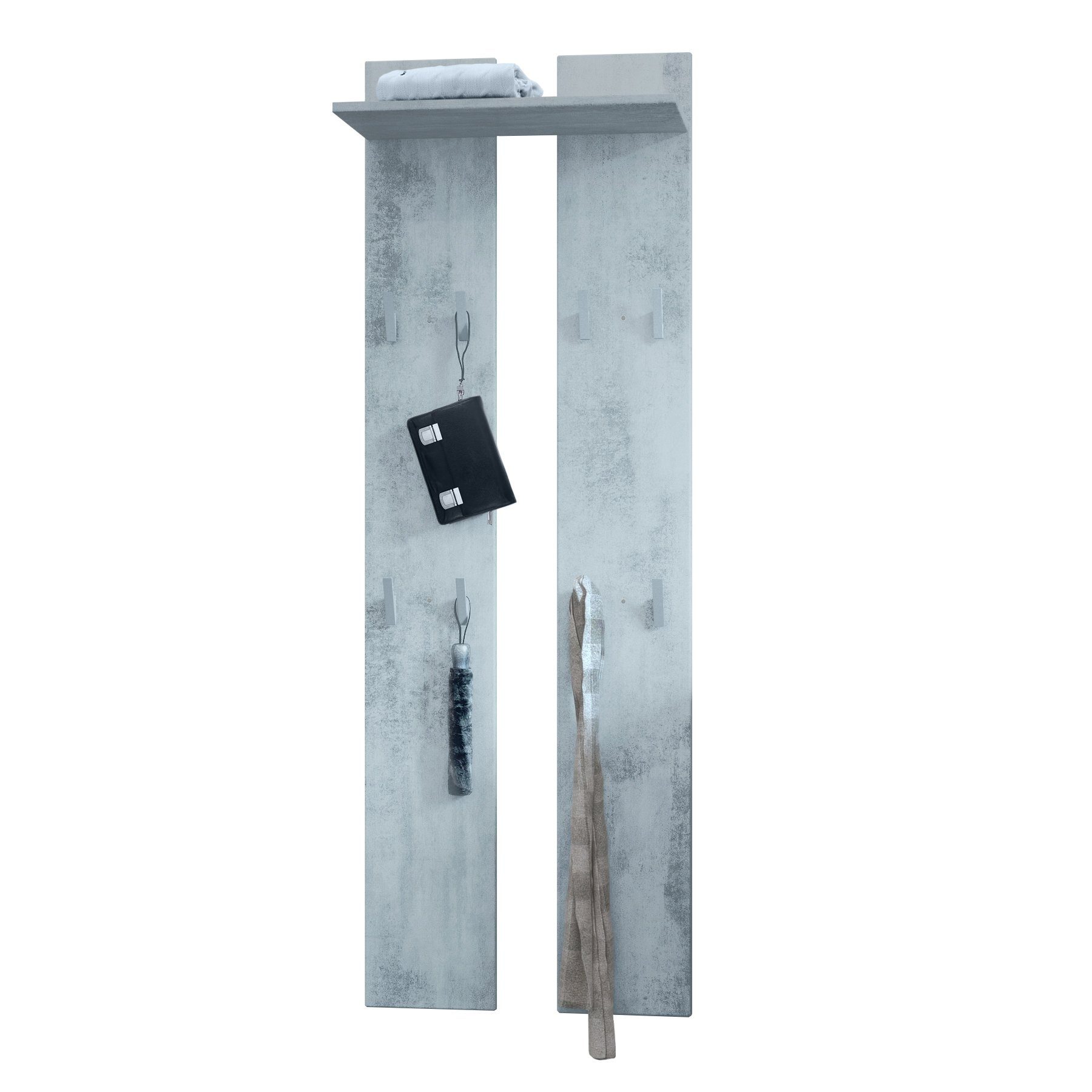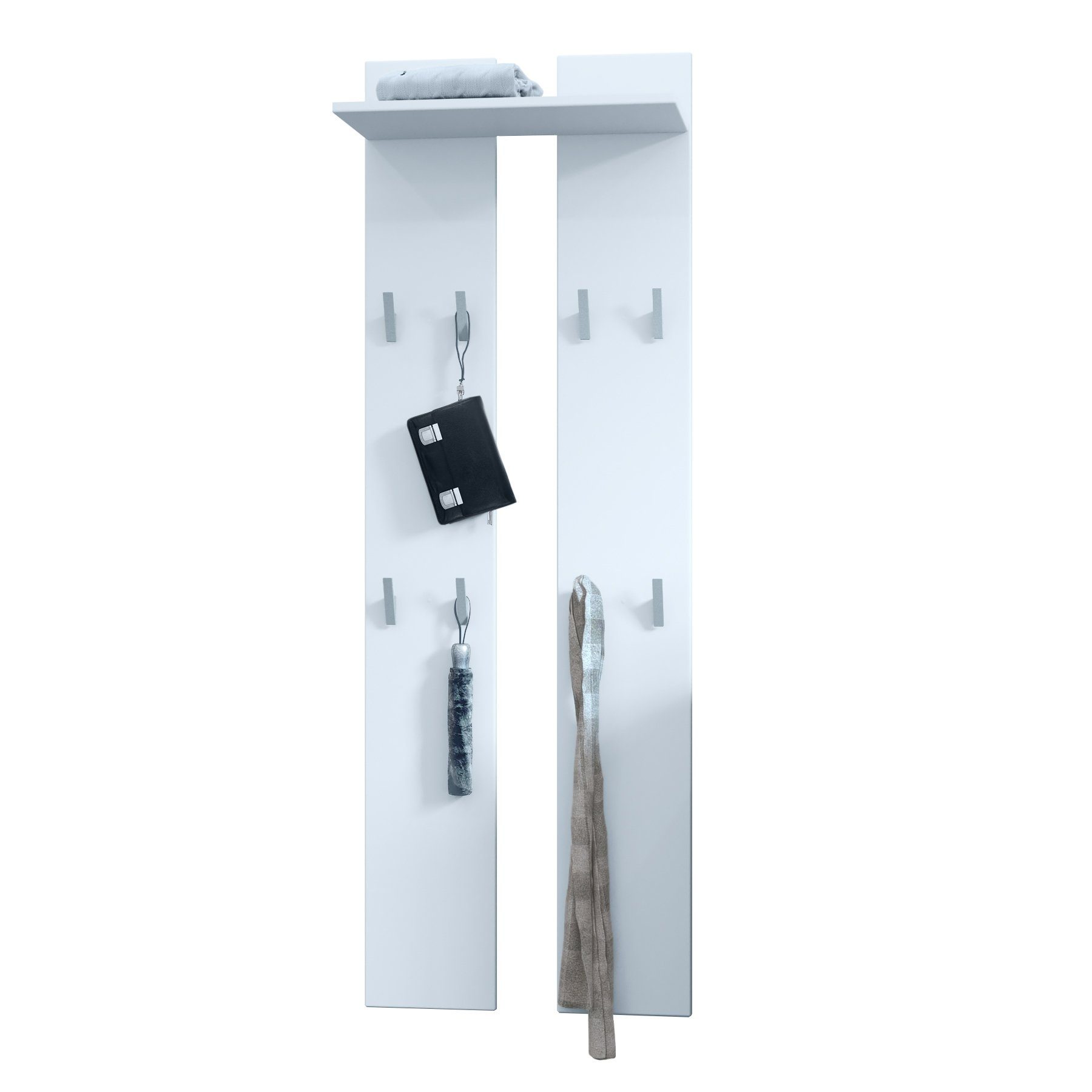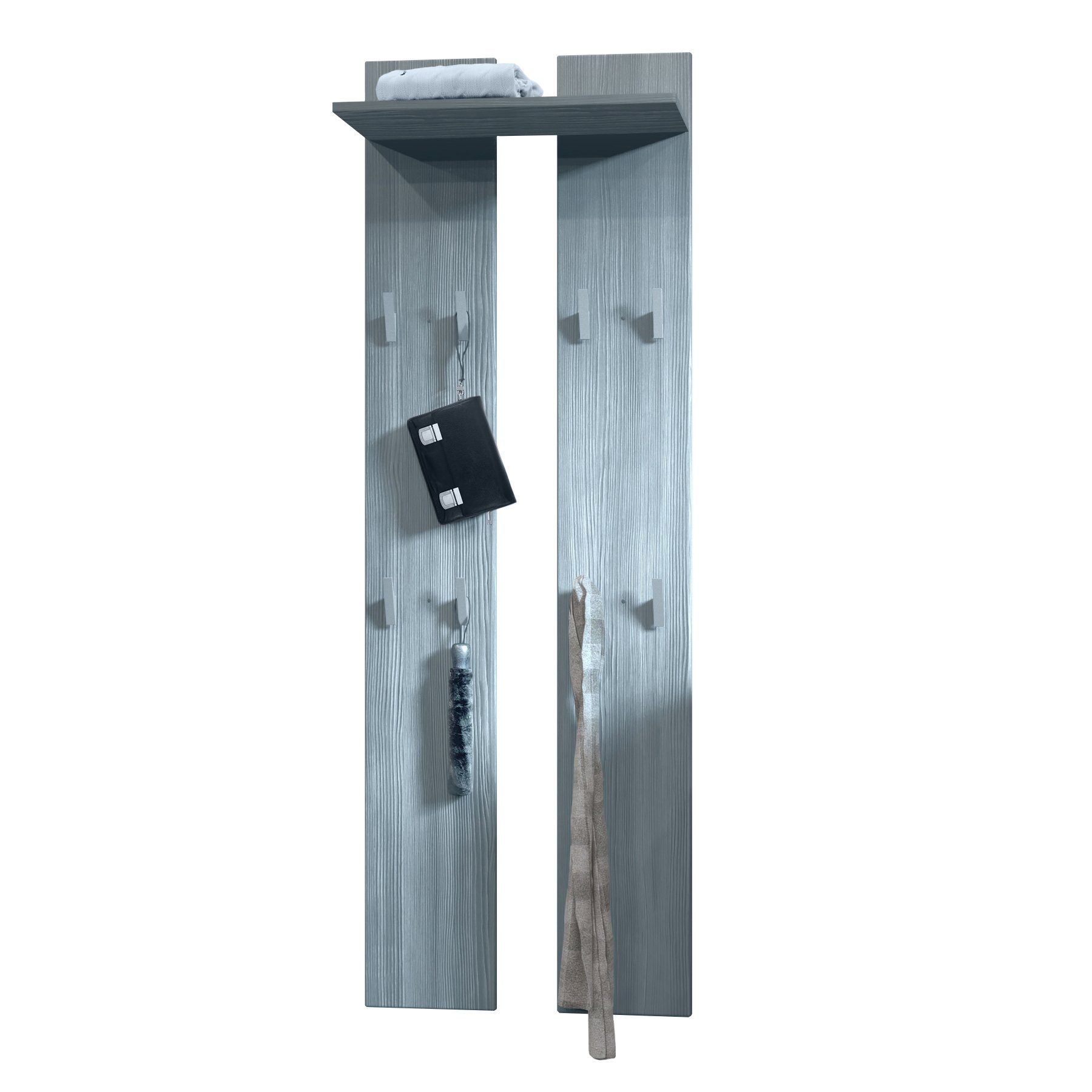 Die moderne Garderobe besteht aus zwei Wandpaneelen mit insgesamt acht Garderobenhaken und einem Ablagefach, hergestellt in Deutschland. Das Wandpaneel ist elegant und schlicht und eignet sich perfekt für die Diele. Dank dezenter Garderobenhaken aus silbernem Kunststoff fügt sich das Garderobenpaneel schlicht in Ihren Flur oder Ihre Diele ein. Die Kanten der Garderobenpaneele sind abgerundet und die oberen Kleiderhaken bieten Platz zum Aufhängen von Jacken und Mänteln. Für Taschen eignen sich die unteren Haken. Auf dem Ablagefach darüber kann weiteres Zubehör, wie beispielsweise Handschuhe und Stirnbänder untergebracht werden. Kombinieren Sie die Wandpaneele mit weiteren Flurmöbeln oder nutzen Sie sie als Einzelstück. Material für die Wandaufhängung ist im Lieferumfang enthalten.