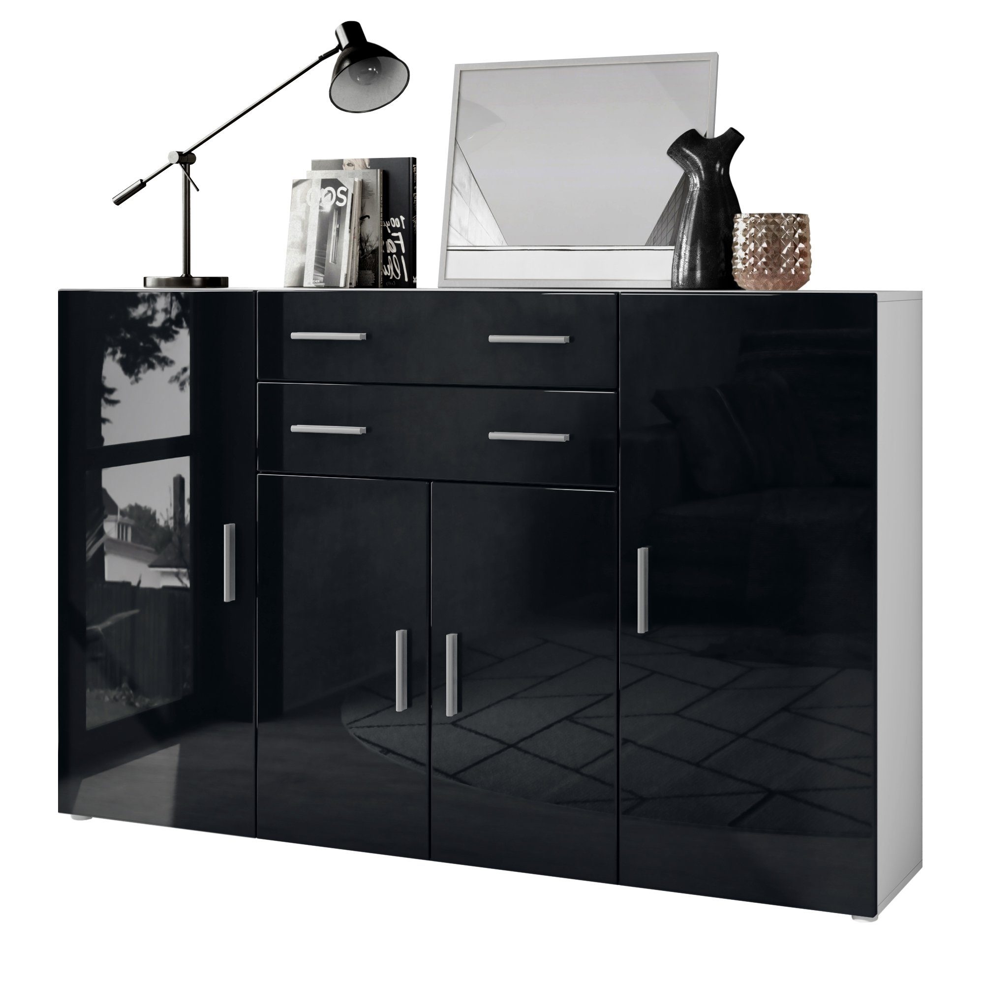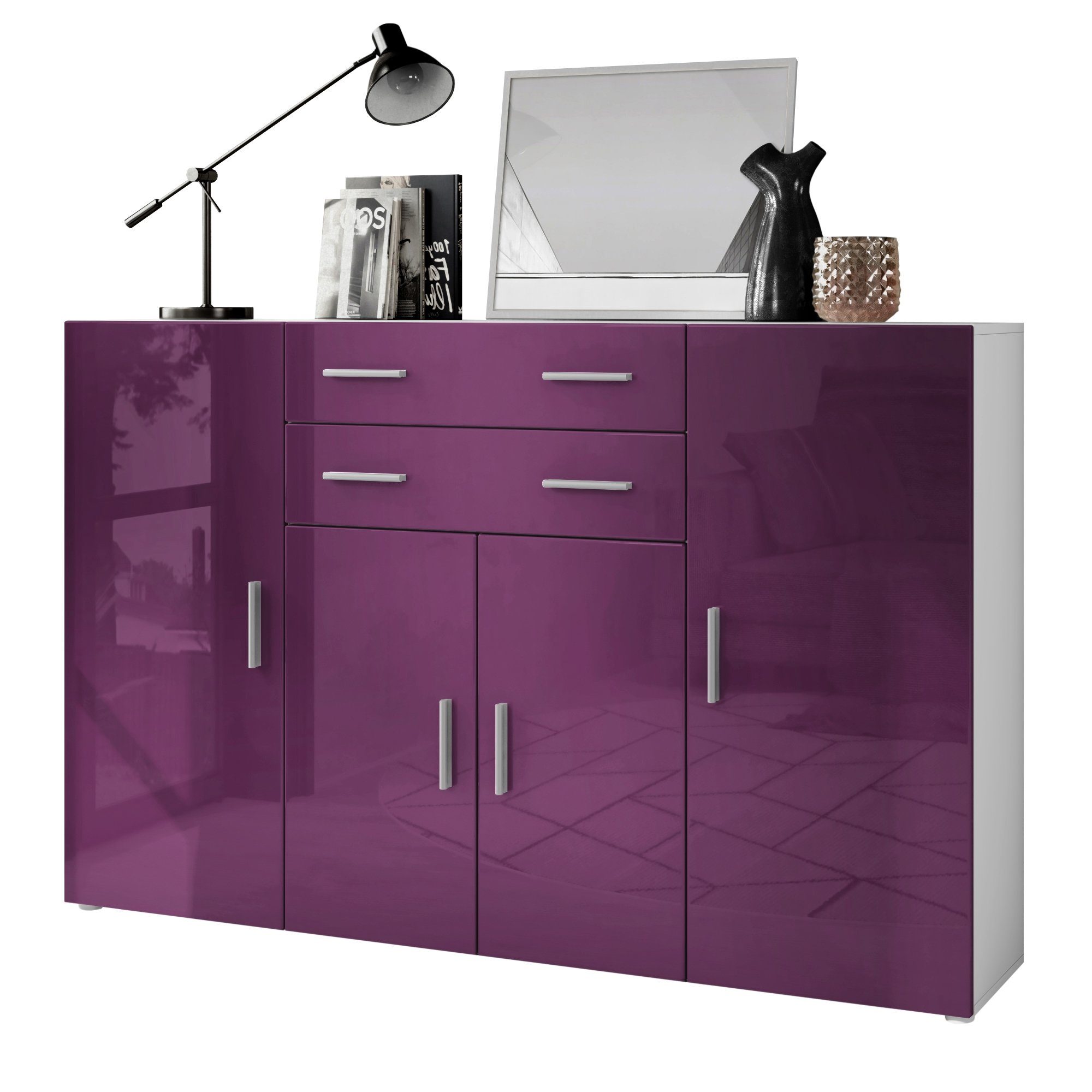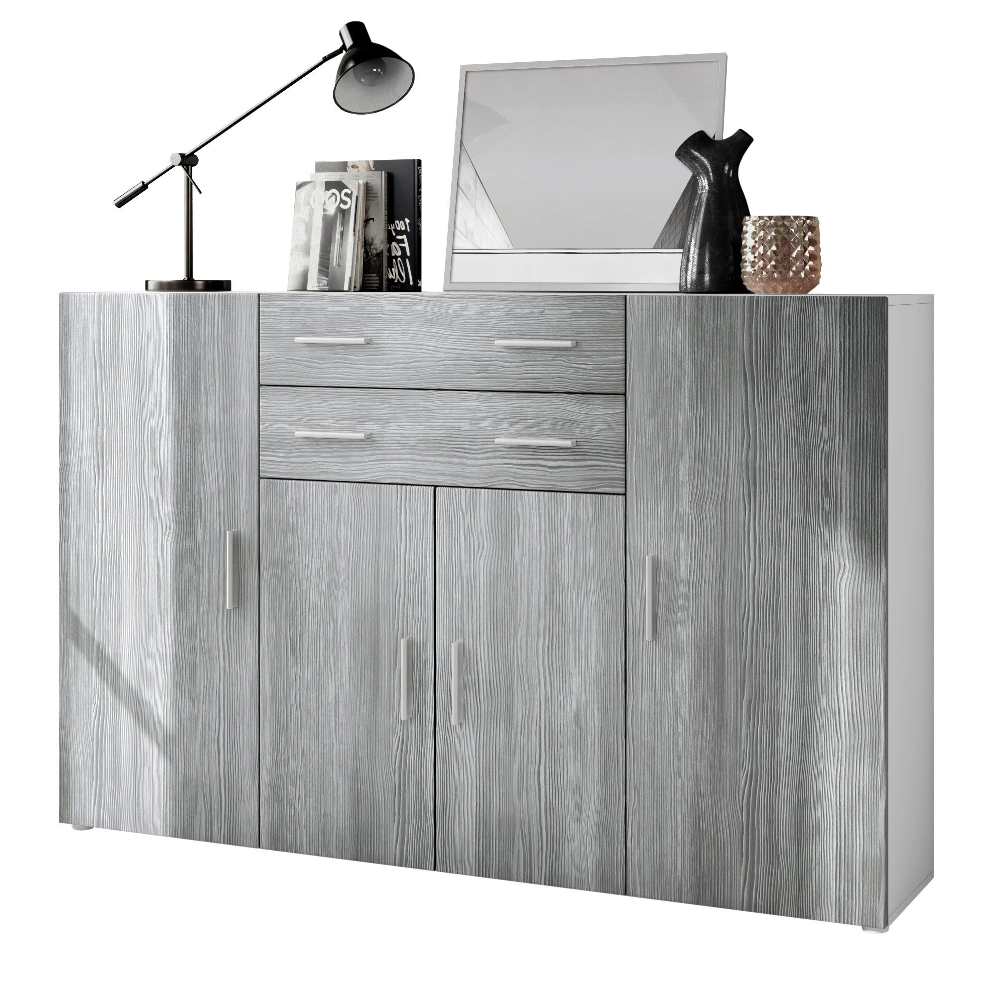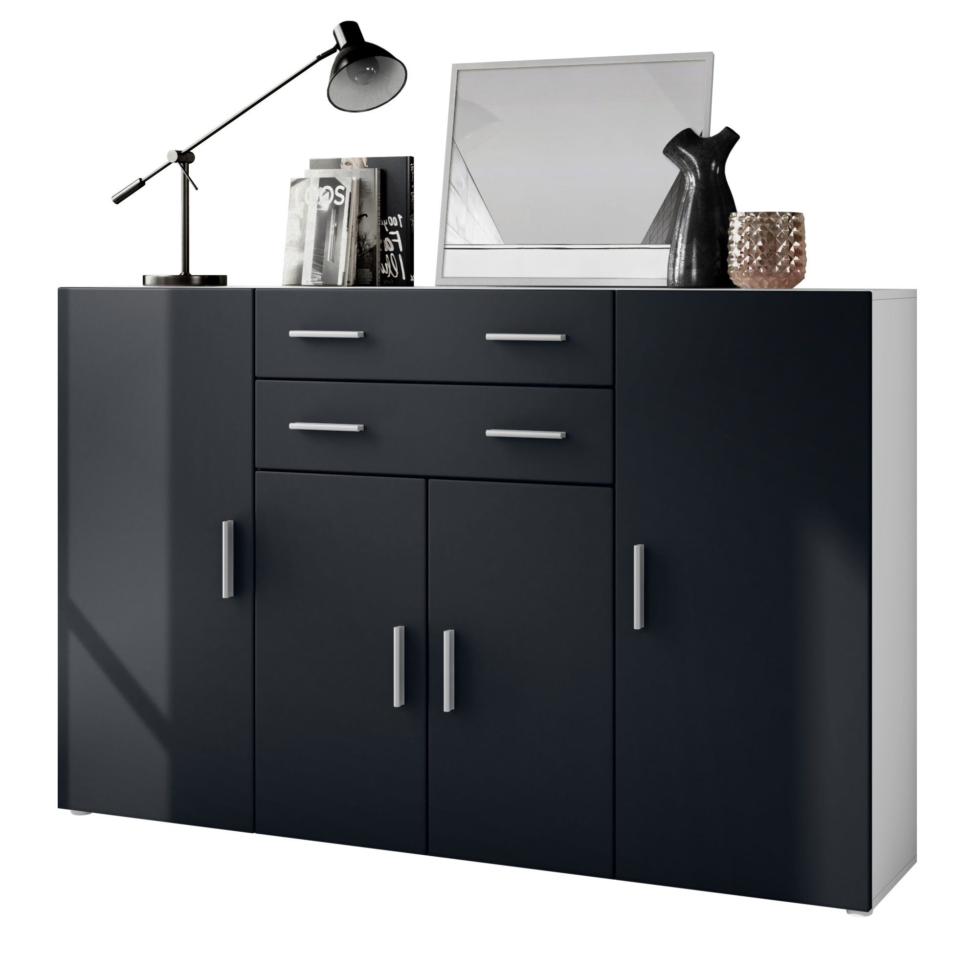 Das Highboard Aron wurde genau in diesem Sinne konzipiert. In seinen insgesamt acht geschlossenen Fächern verschiedener Größen und zwei länglichen Schubladen können zahlreiche Gegenstände sicher und abseits neugieriger Augen aufbewahrt werden. Dabei sind die 4 Türen und 2 Schubladen harmonisch aufeinander abgestimmt. Auch die abgerundeten, silberfarbenen Kunststoffgriffe tragen zum modernen Look des hohen Sideboards bei.
