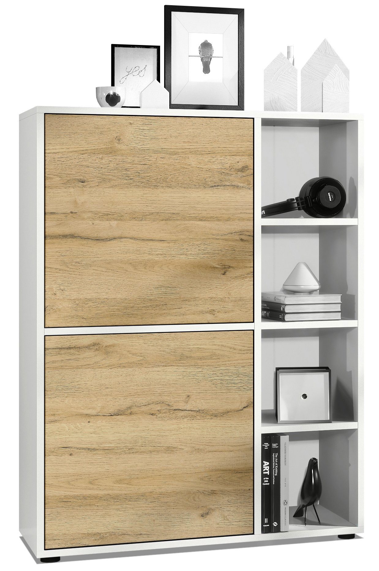 Eine weitere Besonderheit an dem Highboard ist die seitlich angebrachte Regaleinheit mit ihren vier offenen Fächern, die sich perfekt zum Präsentieren von Dekorationen, Büchern oder Fotos anbieten.