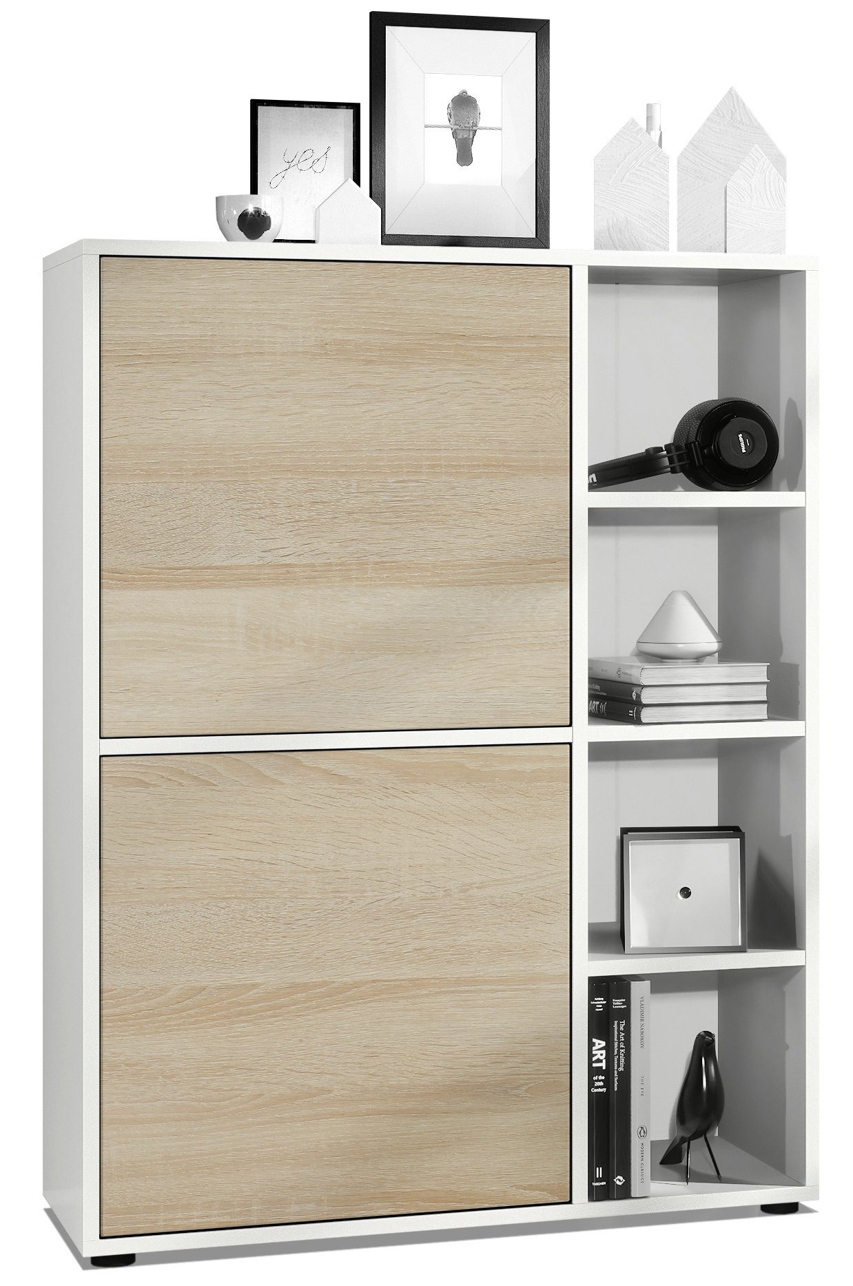 Hinter den zwei Schranktüren befinden sich je zwei große Fächer. Die Fächer sind durch einen höhenverstellbaren Einlegeboden voneinander getrennt.