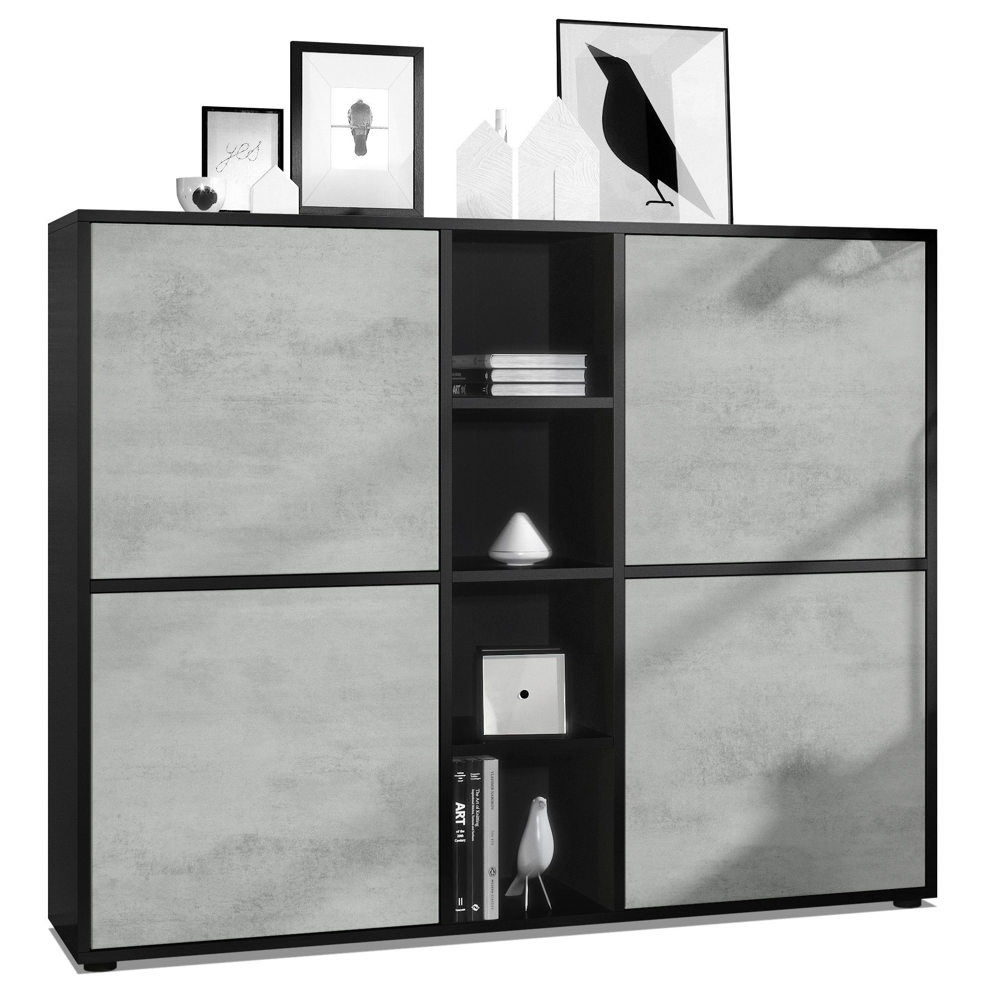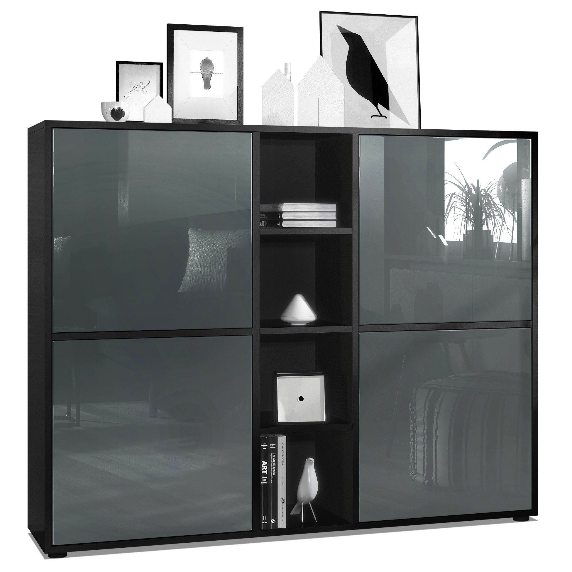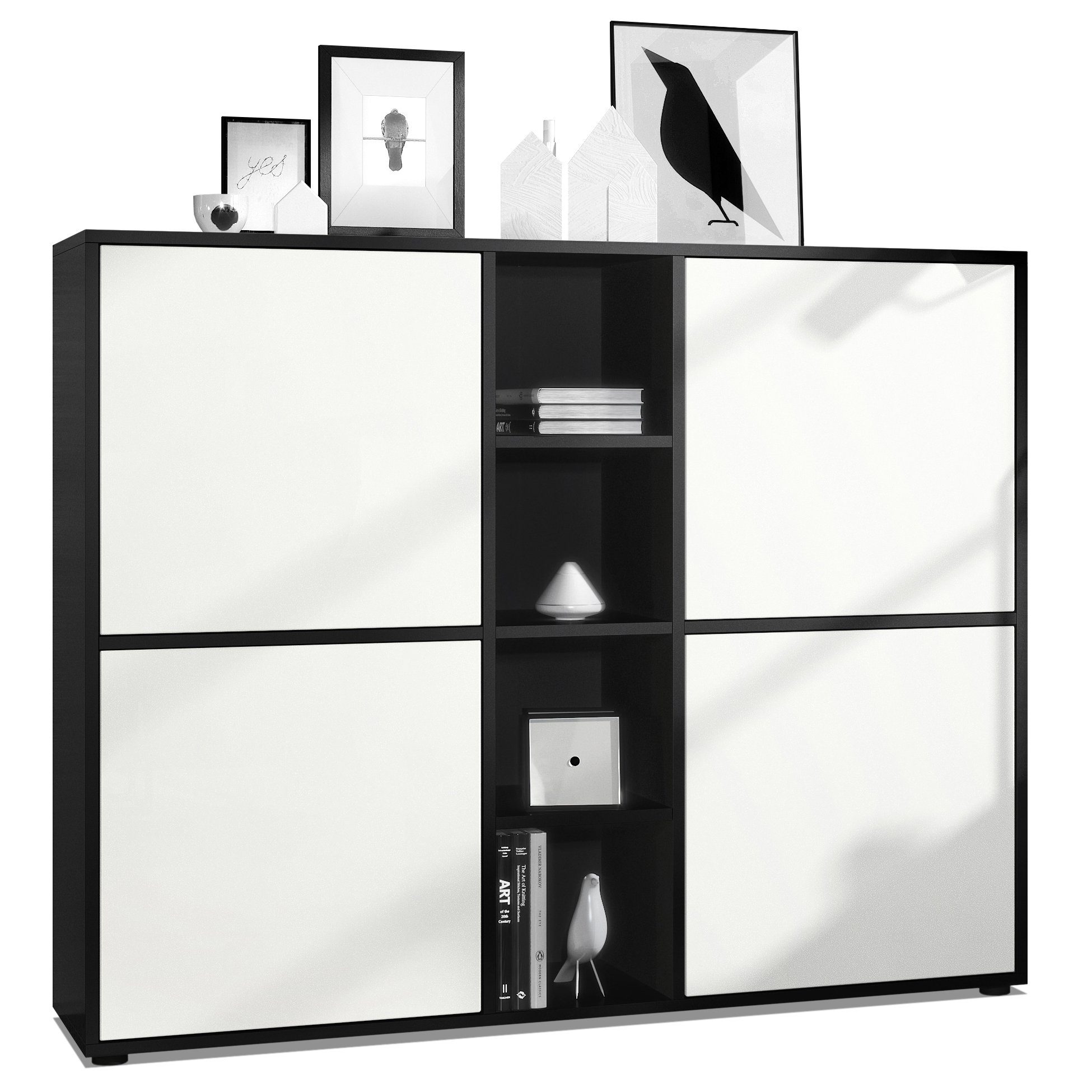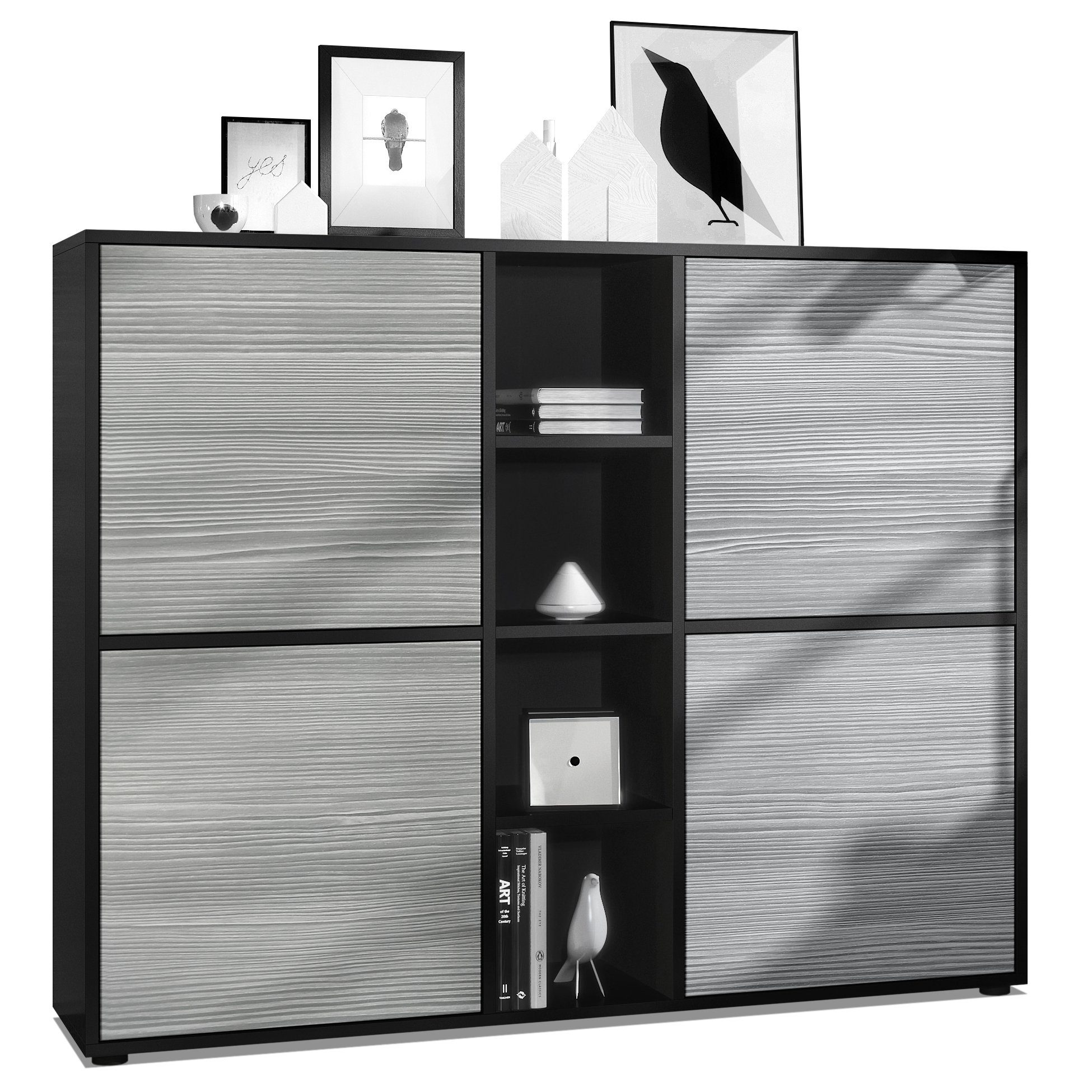 Die Besonderheit an dem Highboard ist die mittige Regaleinheit mit ihren vier offenen Fächern, die sich perfekt zum Präsentieren von Dekorationen, Büchern oder Fotos anbieten. Diese einsehbaren Fächer sind nicht nur praktisch, sondern haben auch einen ästhetischen Effekt: Durch das Hinzufügen eines neutralen Zwischenraums, welcher die vier großflächigen Schranktüren voneinander trennt, wird das Design des Highboards aufgelockert.