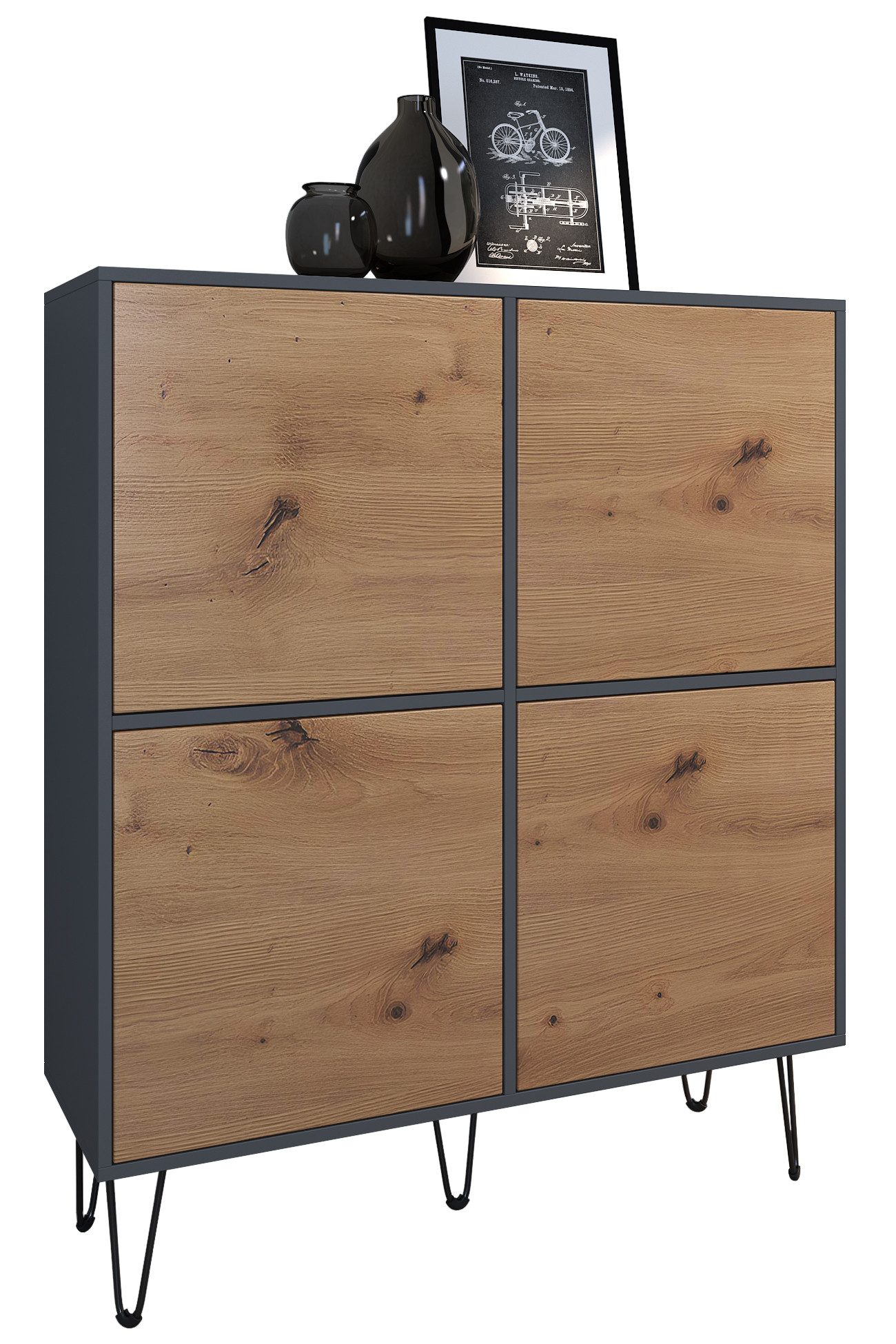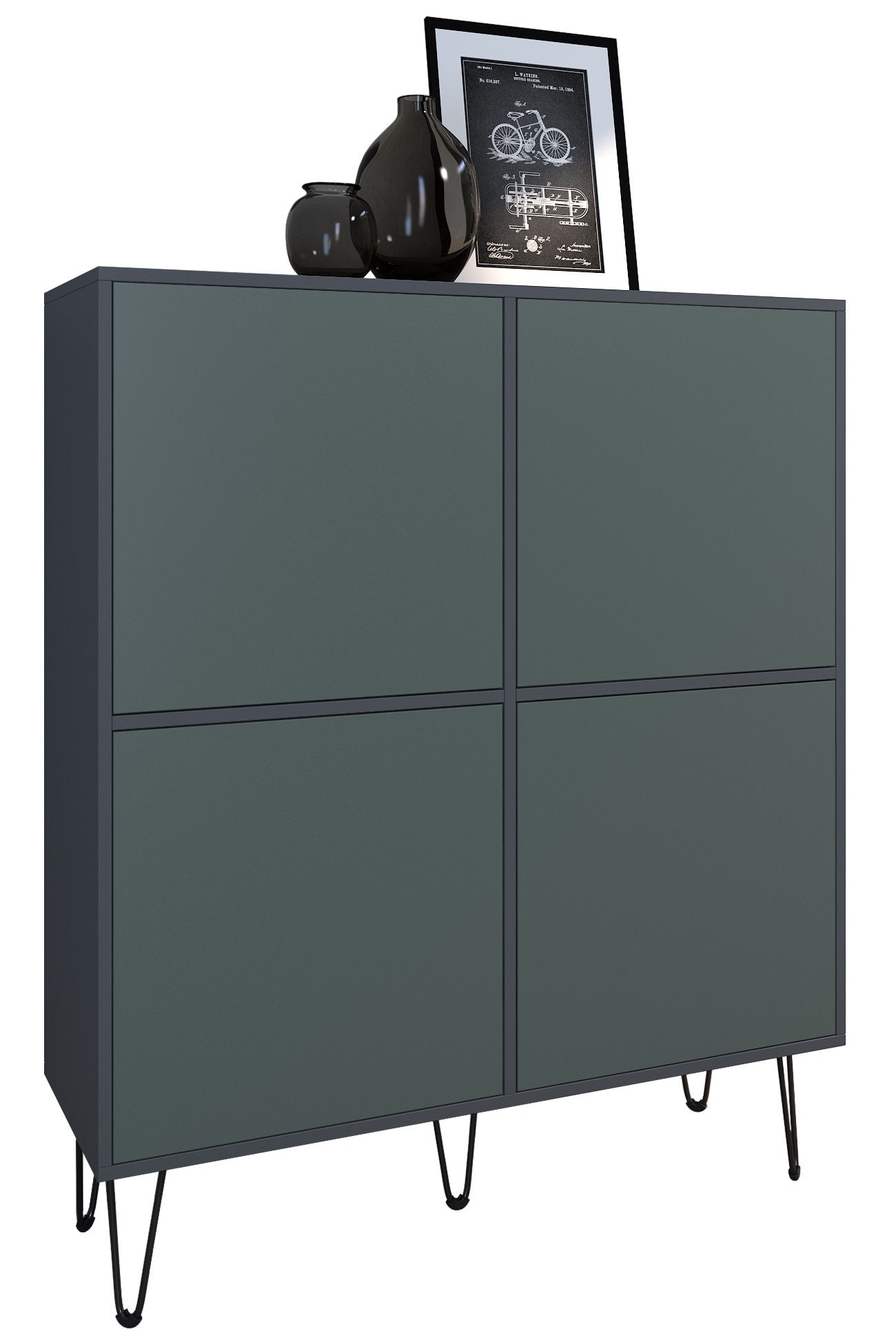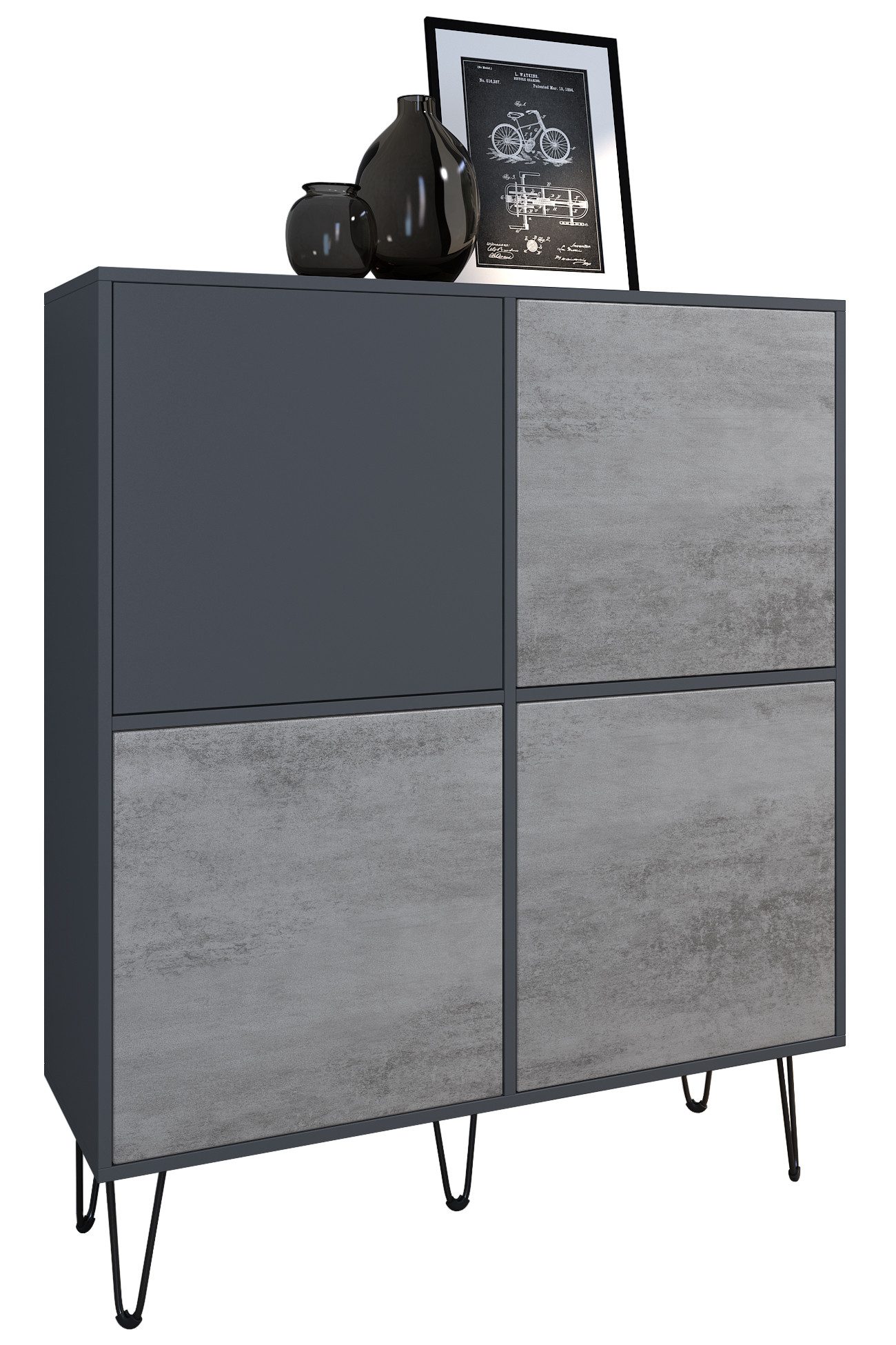 Das Havana Highboard V2 vereint minimalistisches Design mit cleverem Stauraum. Der Korpus in Anthrazit matt sorgt für eine zeitlose Optik und elegante Ausstrahlung. Schwarze Füße setzen stilvolle Akzente und geben Stabilität. Die Fronten sind wählbar in verschiedenen Вариантыn – ideal für Wohnzimmer, Esszimmer, Schlafzimmer oder Flur.