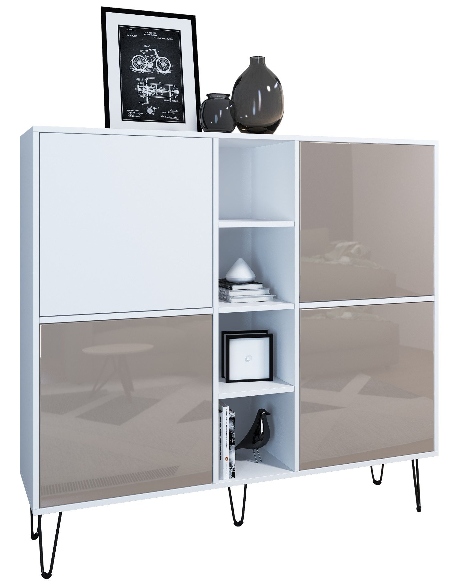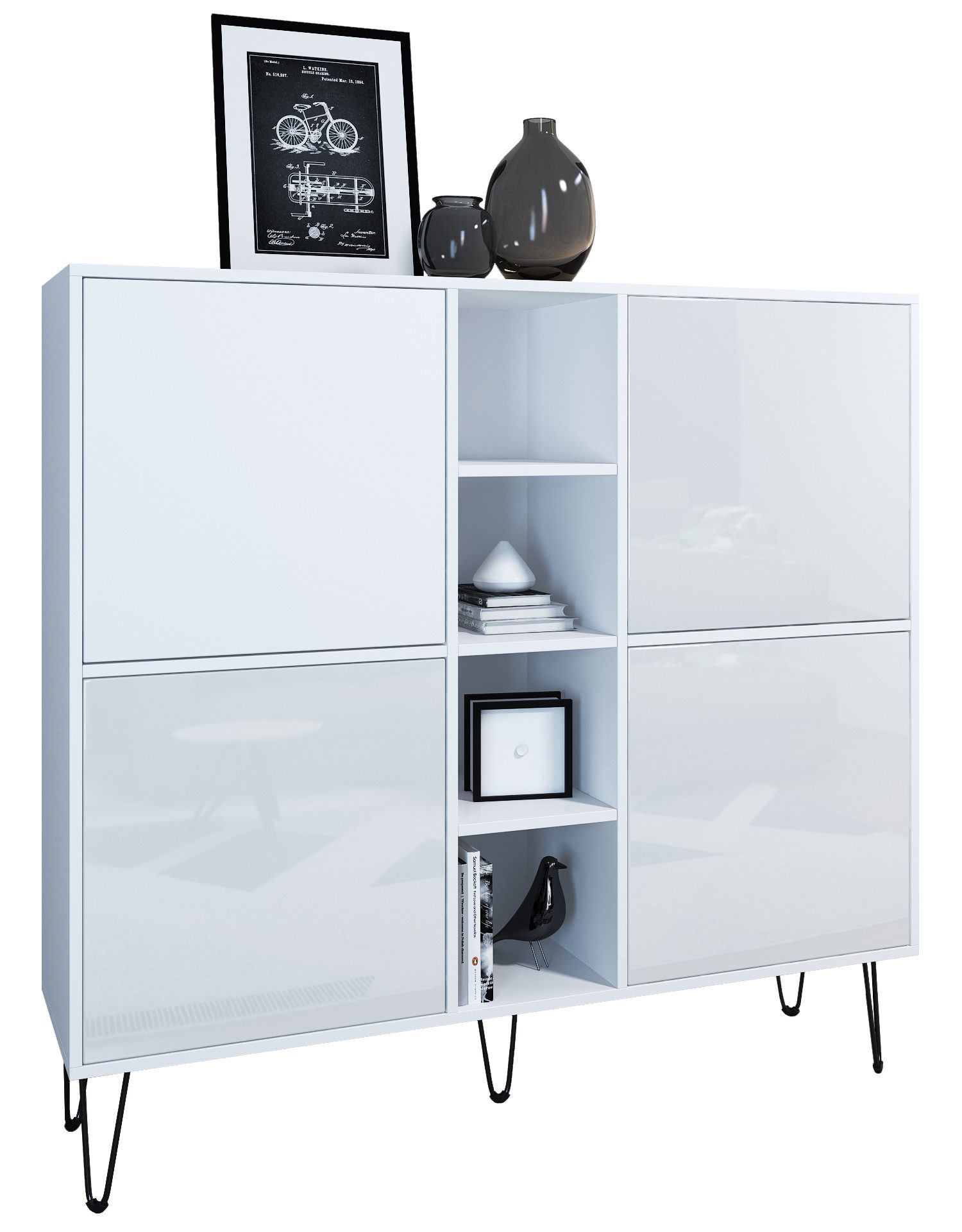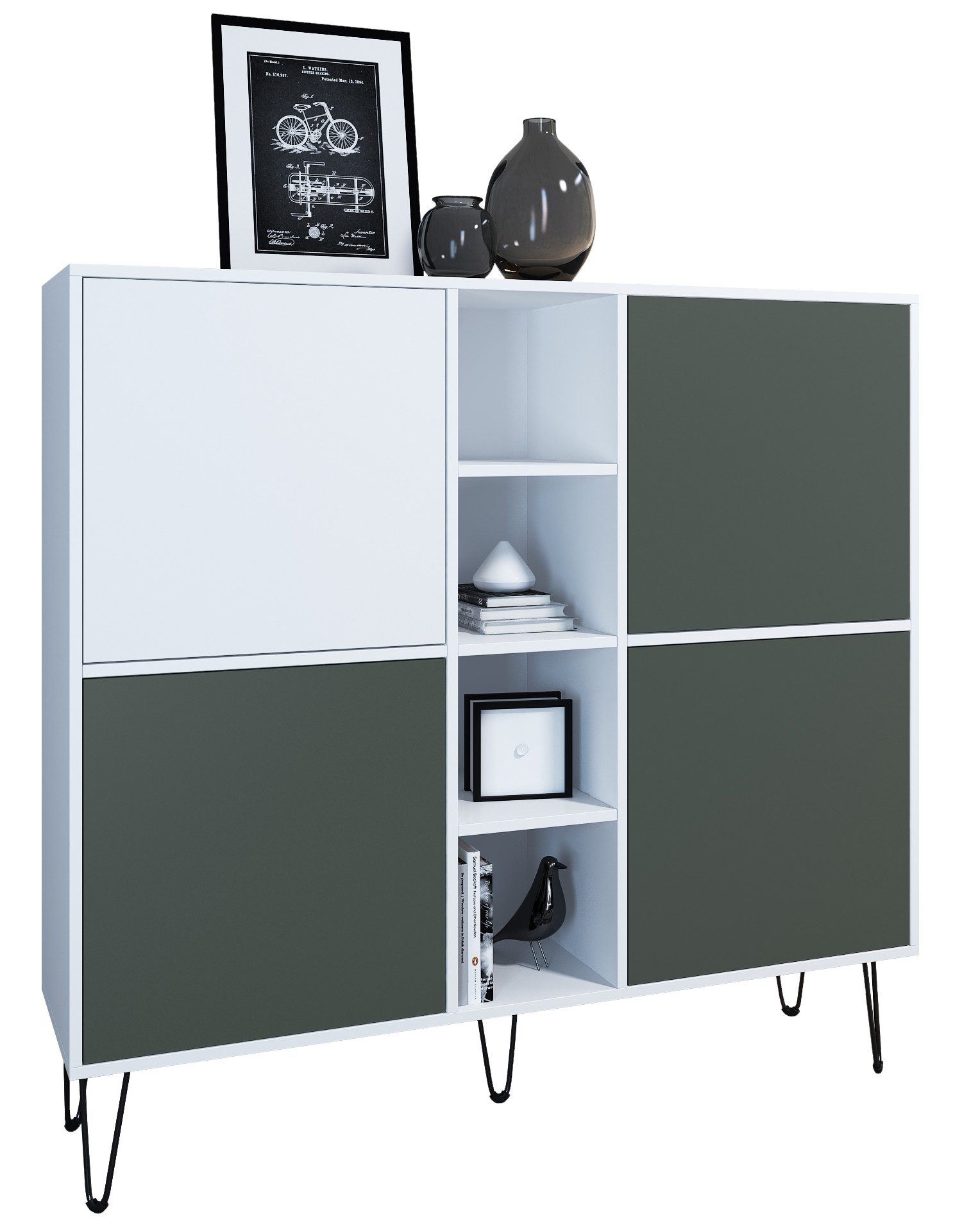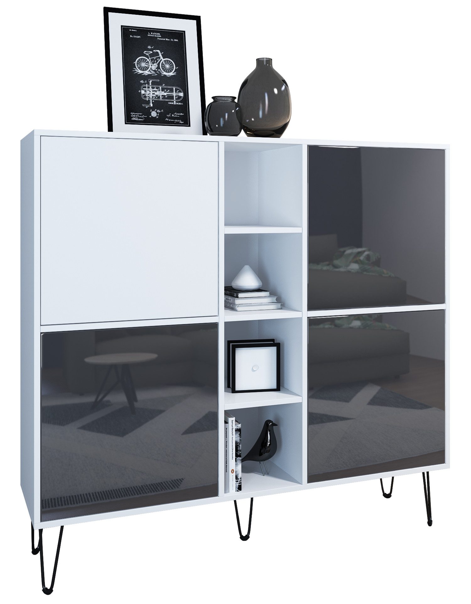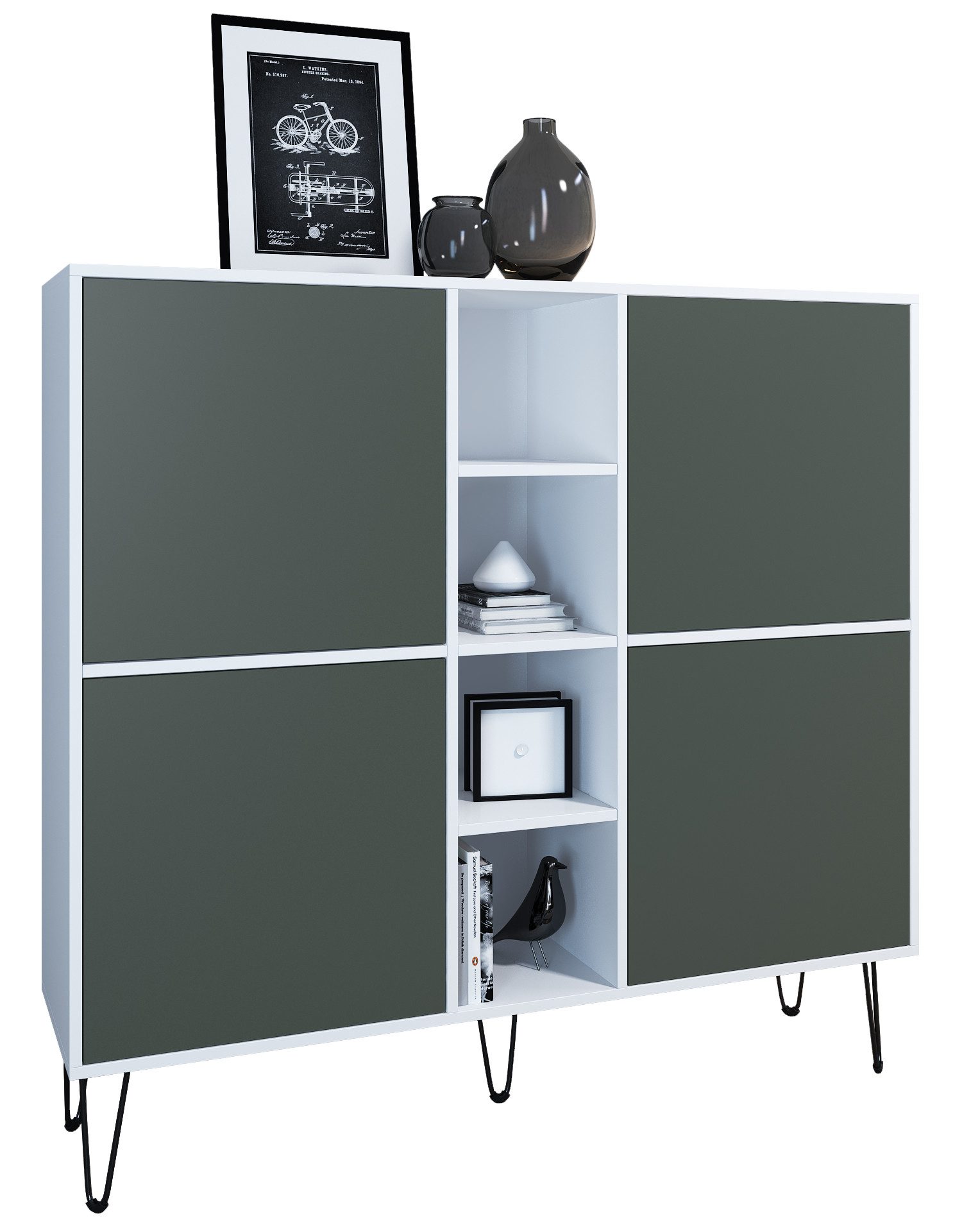 Das Havana Highboard V3 vereint minimalistisches Design mit cleverem Stauraum. Der Korpus in Weiß matt sorgt für eine zeitlose Optik und elegante Ausstrahlung. Schwarze Füße setzen stilvolle Akzente und geben Stabilität. Die Fronten sind wählbar in verschiedenen Вариантыn – ideal für Wohnzimmer, Esszimmer, Schlafzimmer oder Flur.