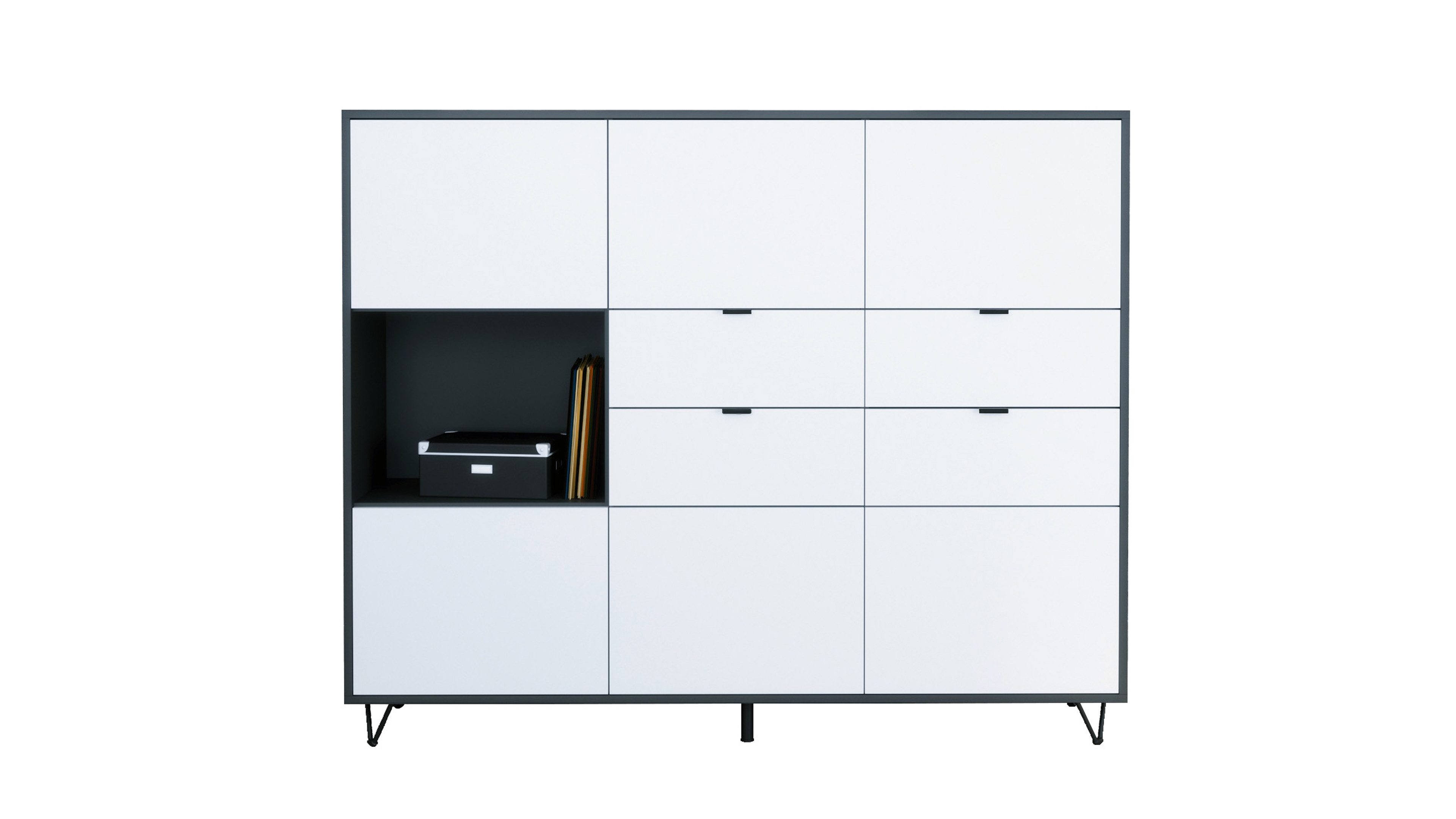 In der oberen und unteren Reihe befinden sich jeweils drei Türen mit Push-to-Open-Funktion, die sechs geschlossene Fächer verbergen – ideal als Kommode, Schrank oder Aufbewahrungsschrank. Auf der linken Seite befindet sich ein offenes Fach für Bücher, Deko oder Technik. Daneben bieten vier praktische Schubladen mit schwarzen Metallgriffen zusätzlichen Stauraum – perfekt für Alltagsutensilien, Dokumente oder Besteck.