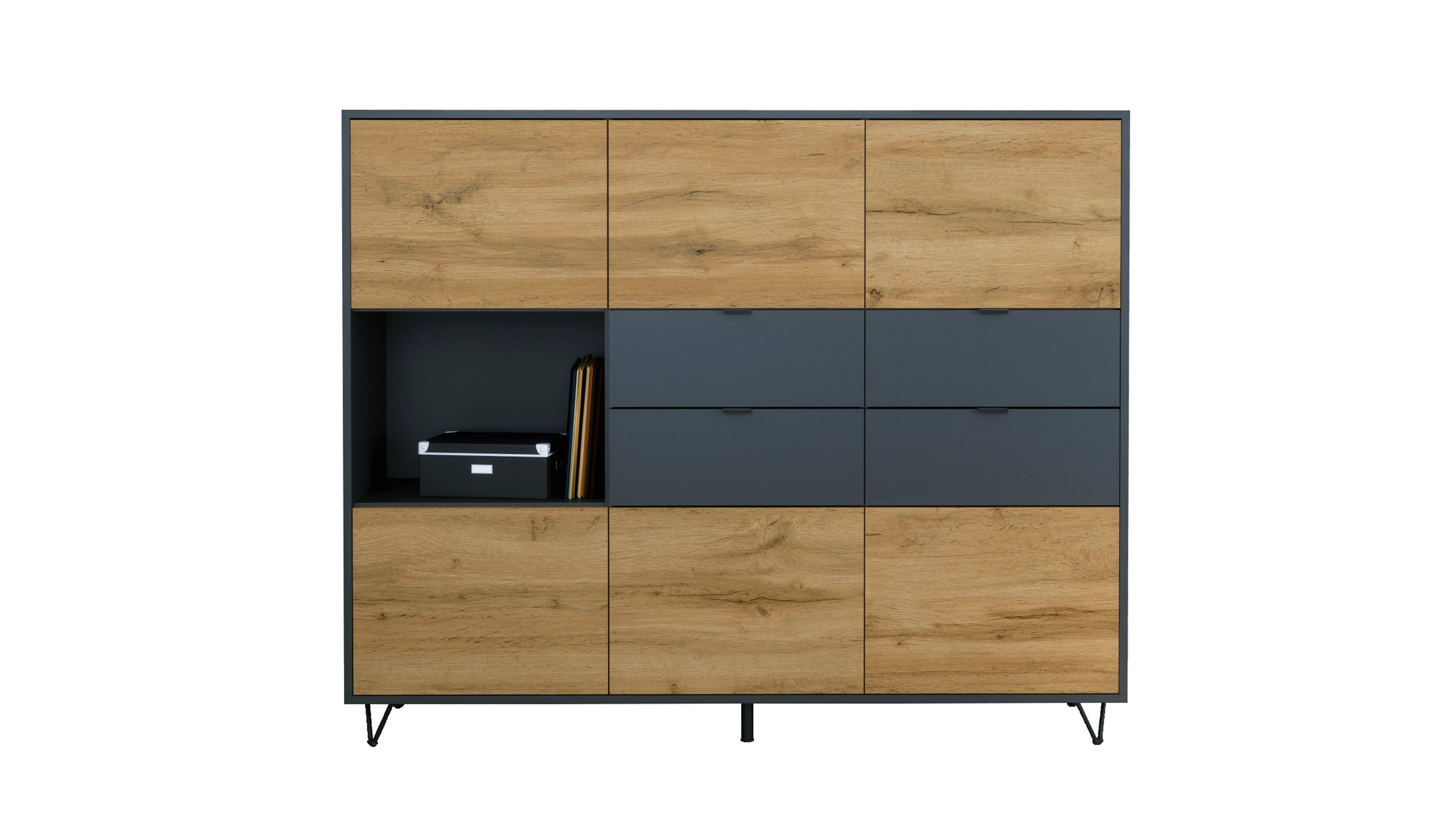 Gefertigt aus melaminbeschichteter Spanplatte überzeugt das Highboard mit Stabilität, Langlebigkeit und Pflegeleichtigkeit – Qualität Made in Germany. Ob als Highboard, Sideboard oder Bücherregal – Marino passt in jedes Zuhause.