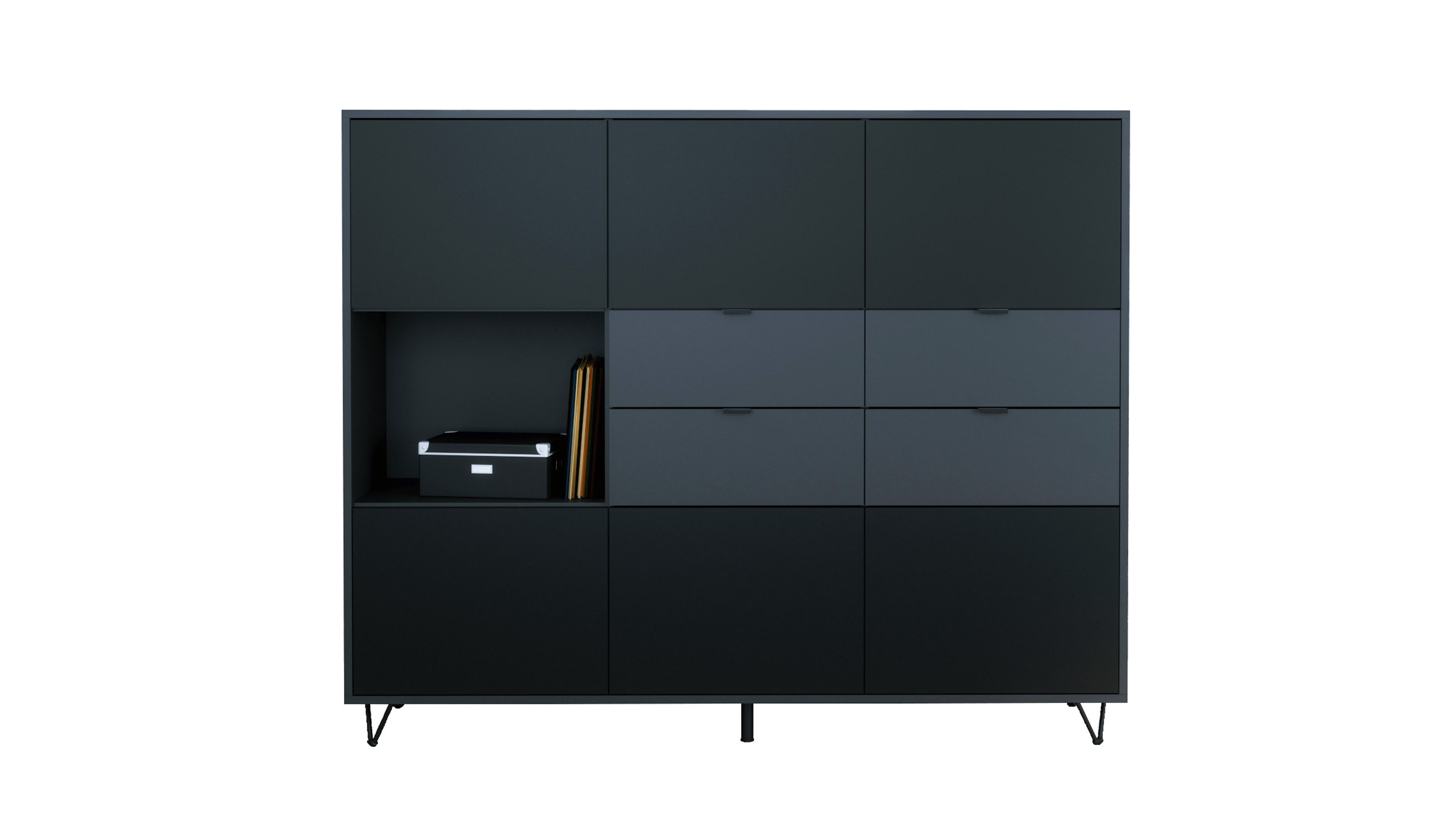Das Marino Highboard V2 vereint durchdachtes Design mit großzügigem Stauraum. Der Korpus in Anthrazit verleiht dem Möbelstück eine zeitlose Eleganz. Schwarze Füße sorgen für Stabilität und moderne Akzente. Die Frontfarbe ist individuell wählbar – passend für Wohnzimmer, Esszimmer, Schlafzimmer oder Flur.