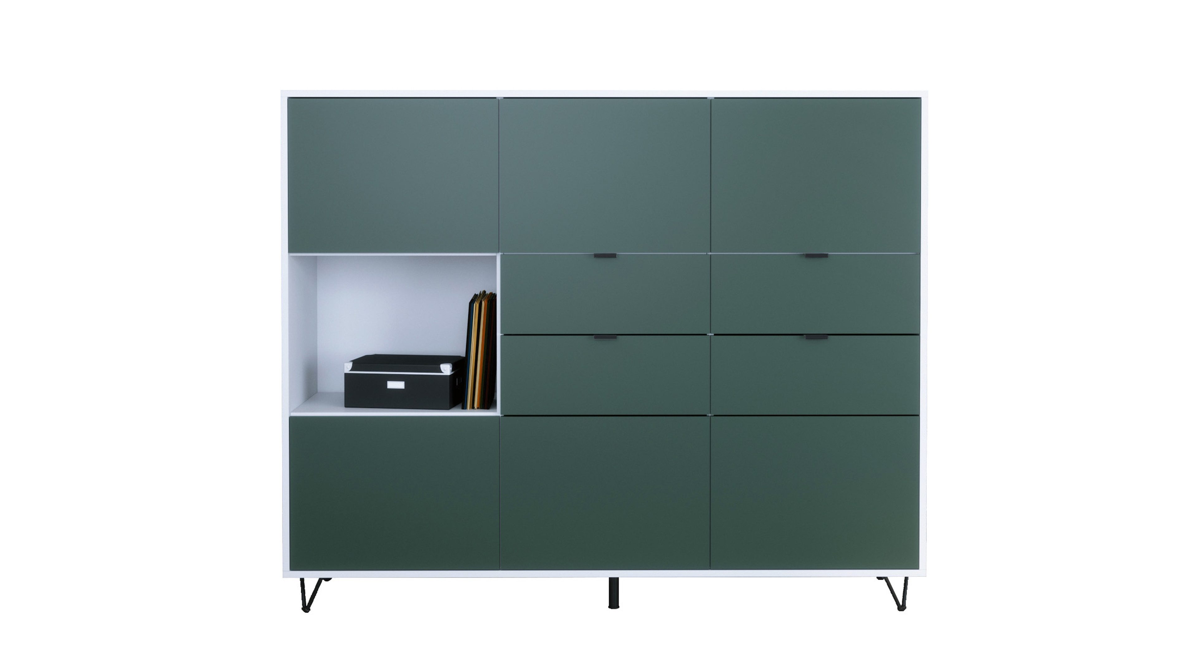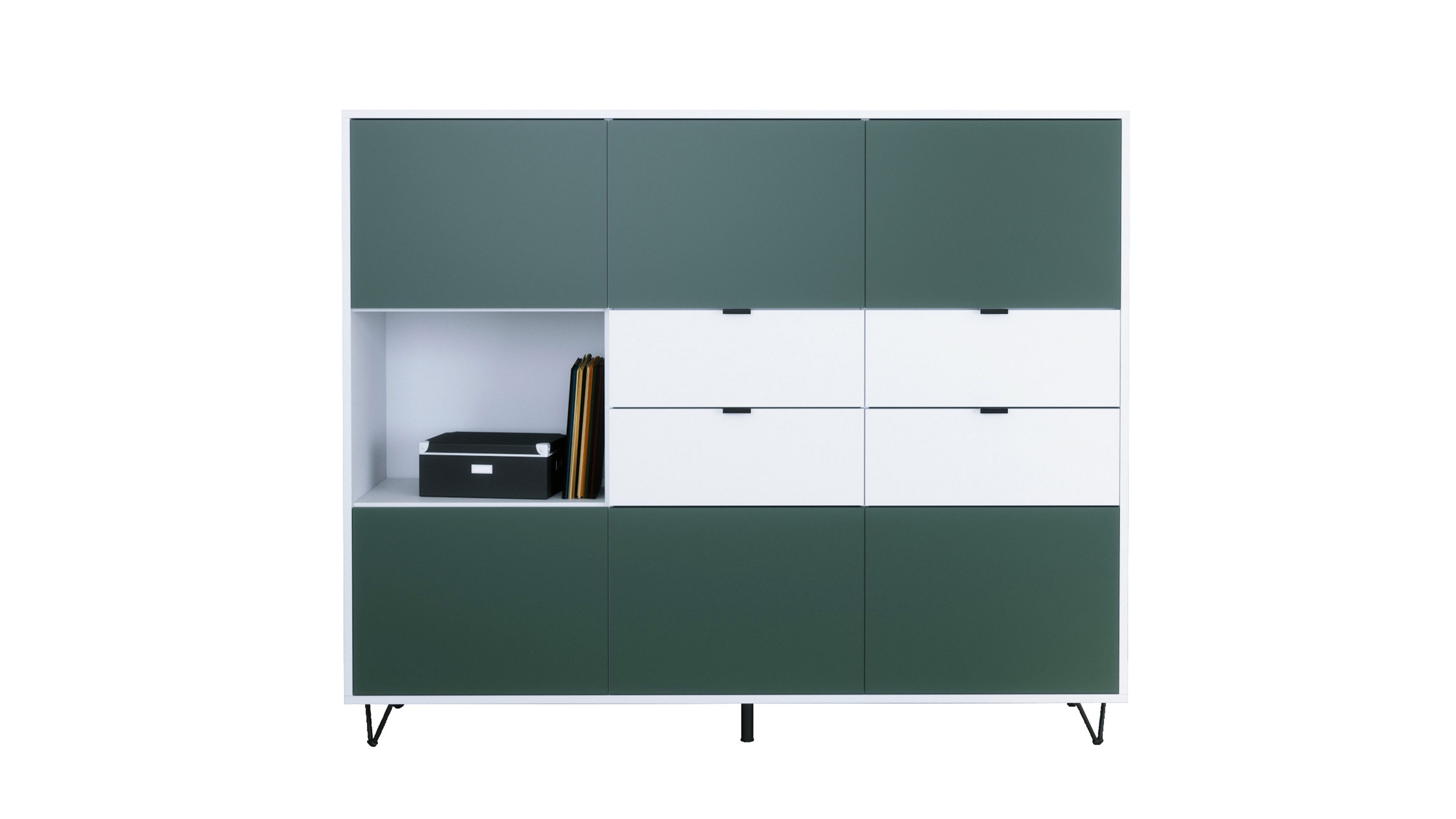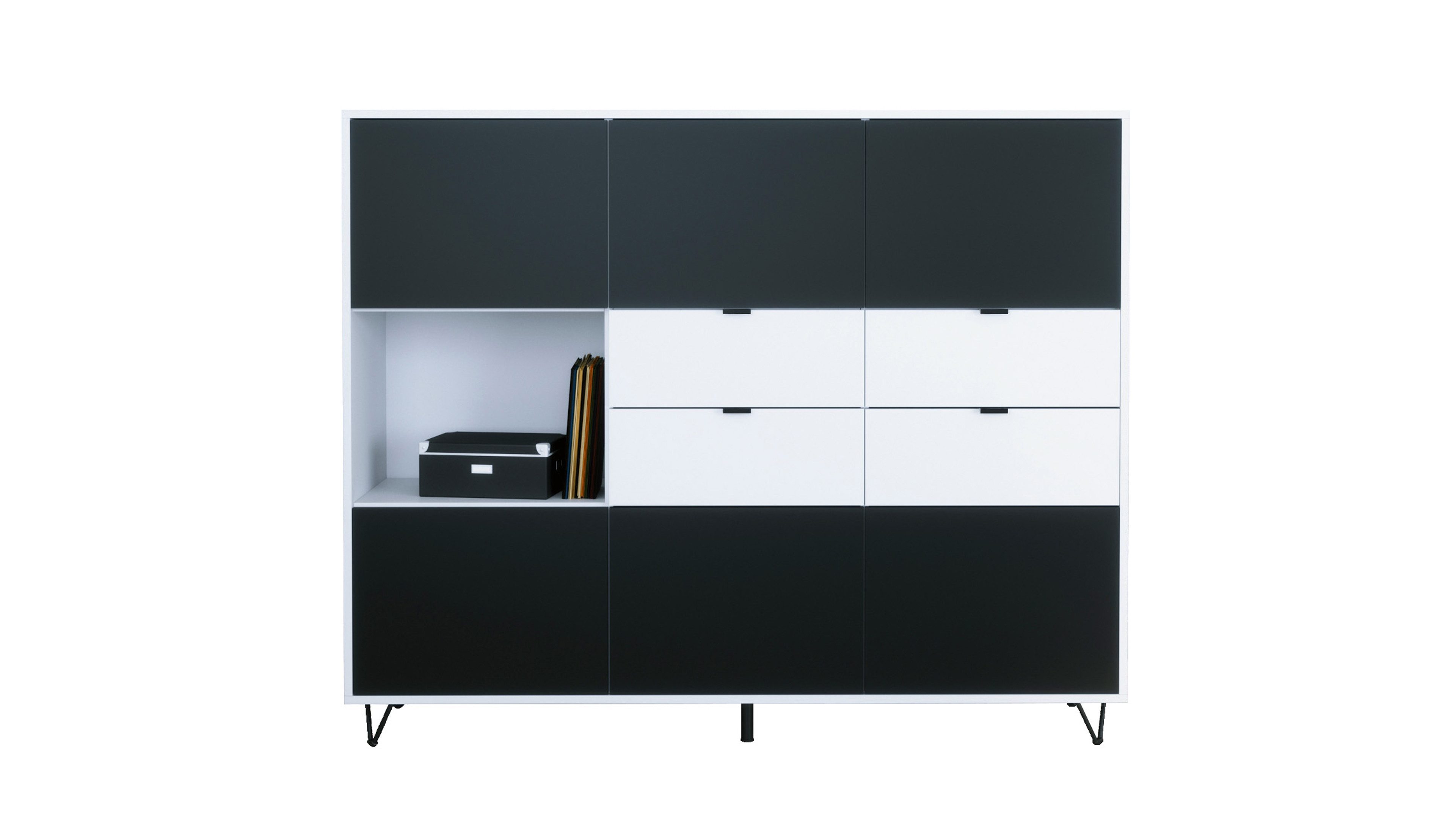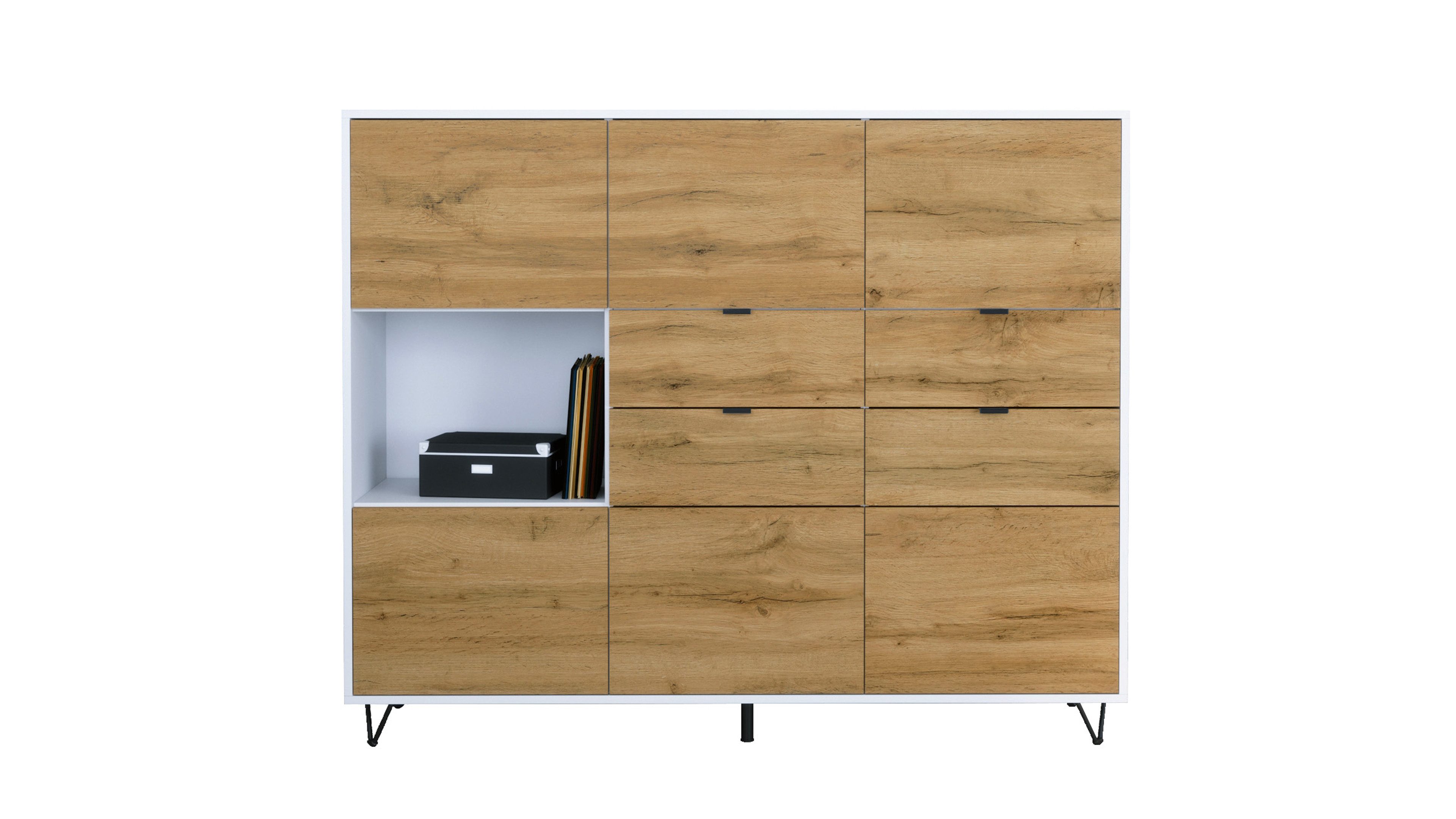 In der oberen und unteren Reihe befinden sich jeweils drei Türen mit Push-to-Open-Funktion, die sechs geschlossene Fächer verbergen – ideal als Kommode, Schrank oder Aufbewahrungsschrank. Auf der linken Seite befindet sich ein offenes Fach für Bücher, Deko oder Technik. Daneben bieten vier praktische Schubladen mit schwarzen Metallgriffen zusätzlichen Stauraum – perfekt für Alltagsutensilien, Dokumente oder Besteck.