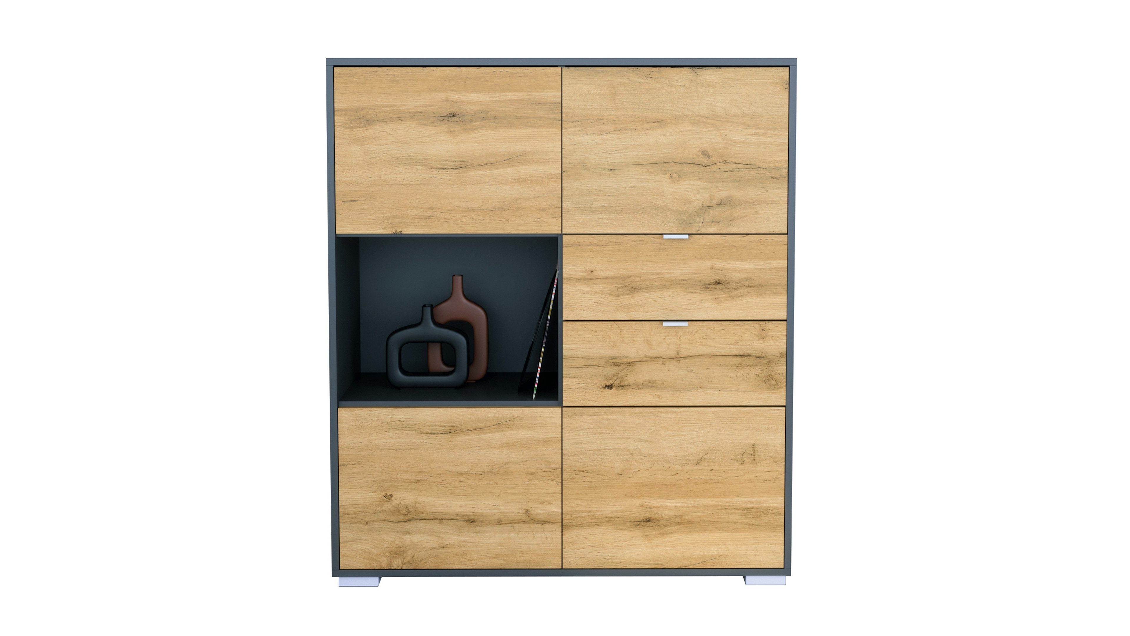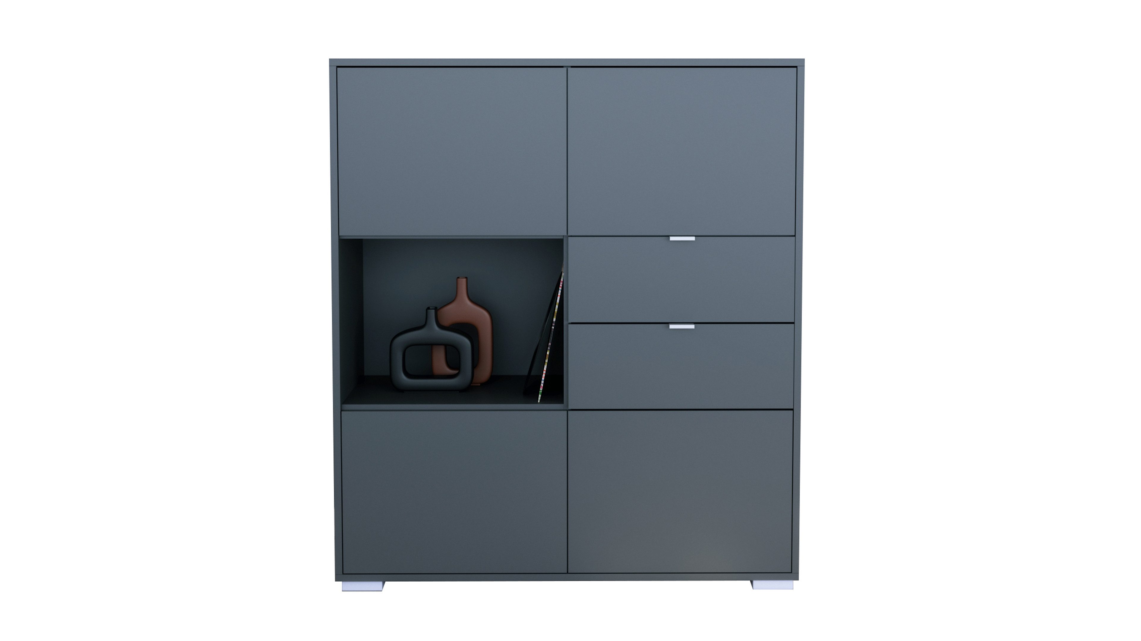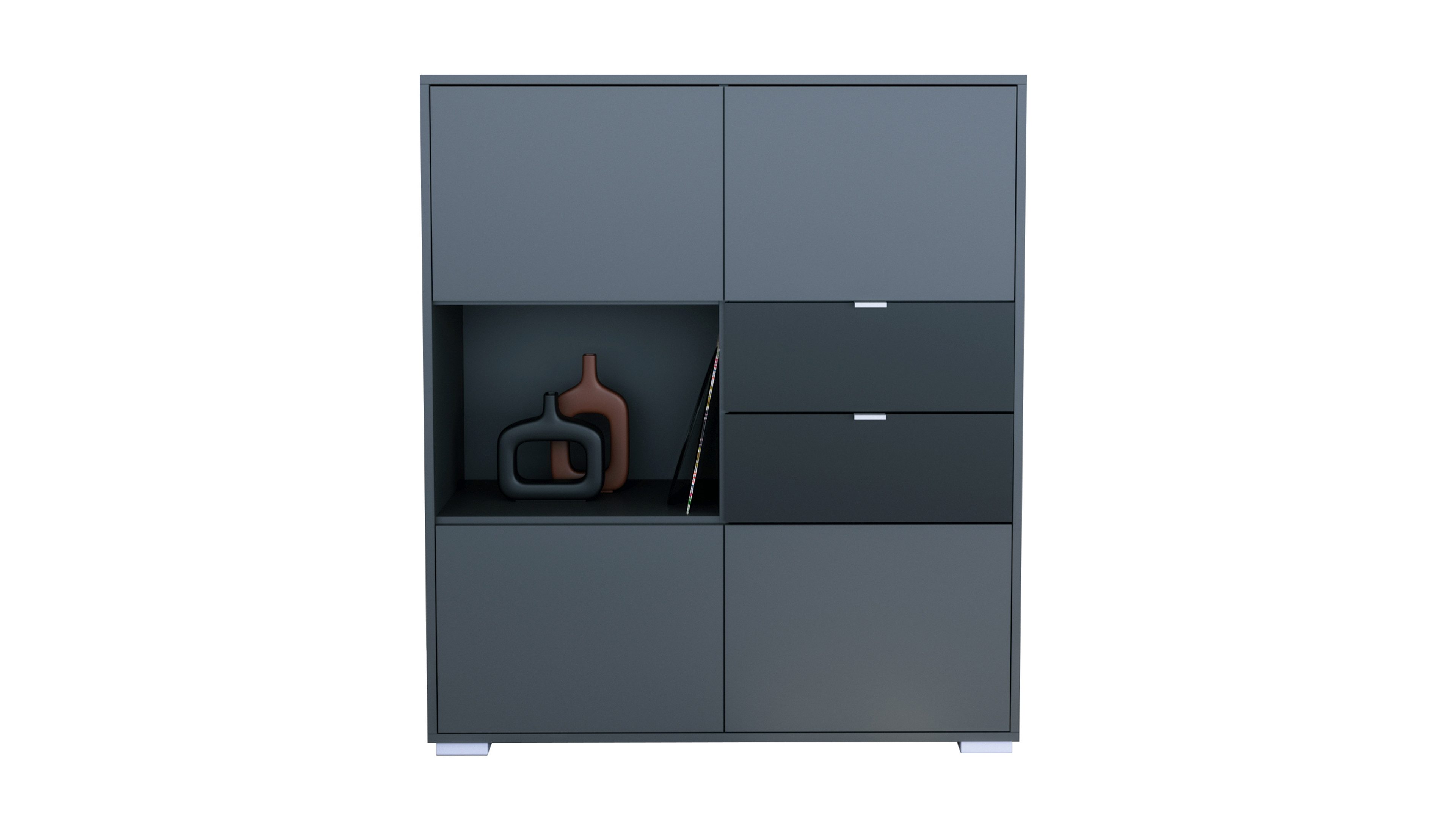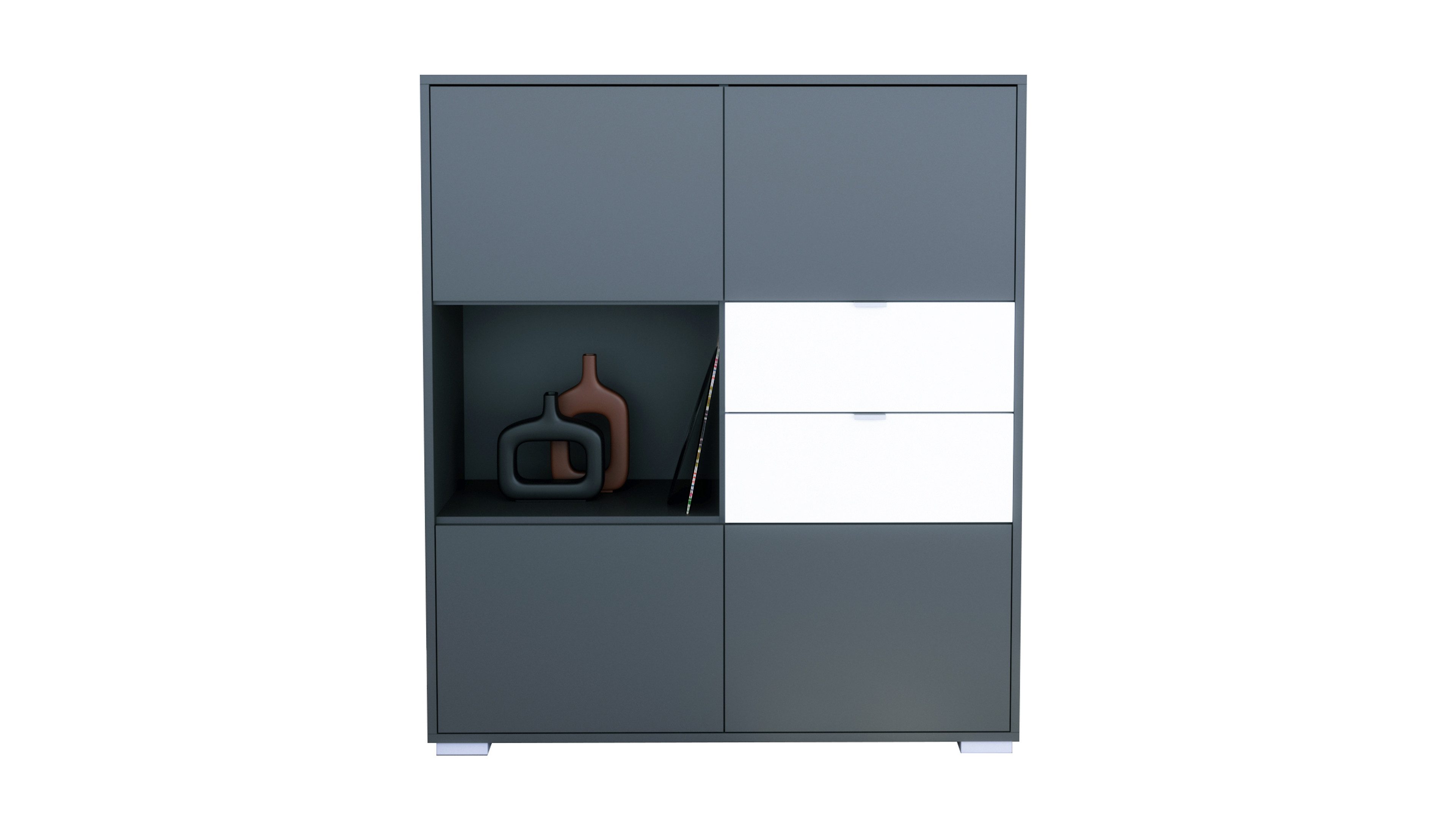 Das Milano Highboard V1 vereint stilvolles Design mit cleverem Stauraum. Der Korpus in Anthrazit verleiht dem Möbelstück eine zeitlose, elegante Ausstrahlung. Silberne Füße sorgen für Stabilität und dezente Akzente. Die Frontfarbe ist individuell wählbar – ideal für Wohnzimmer, Schlafzimmer, Esszimmer oder Flur.