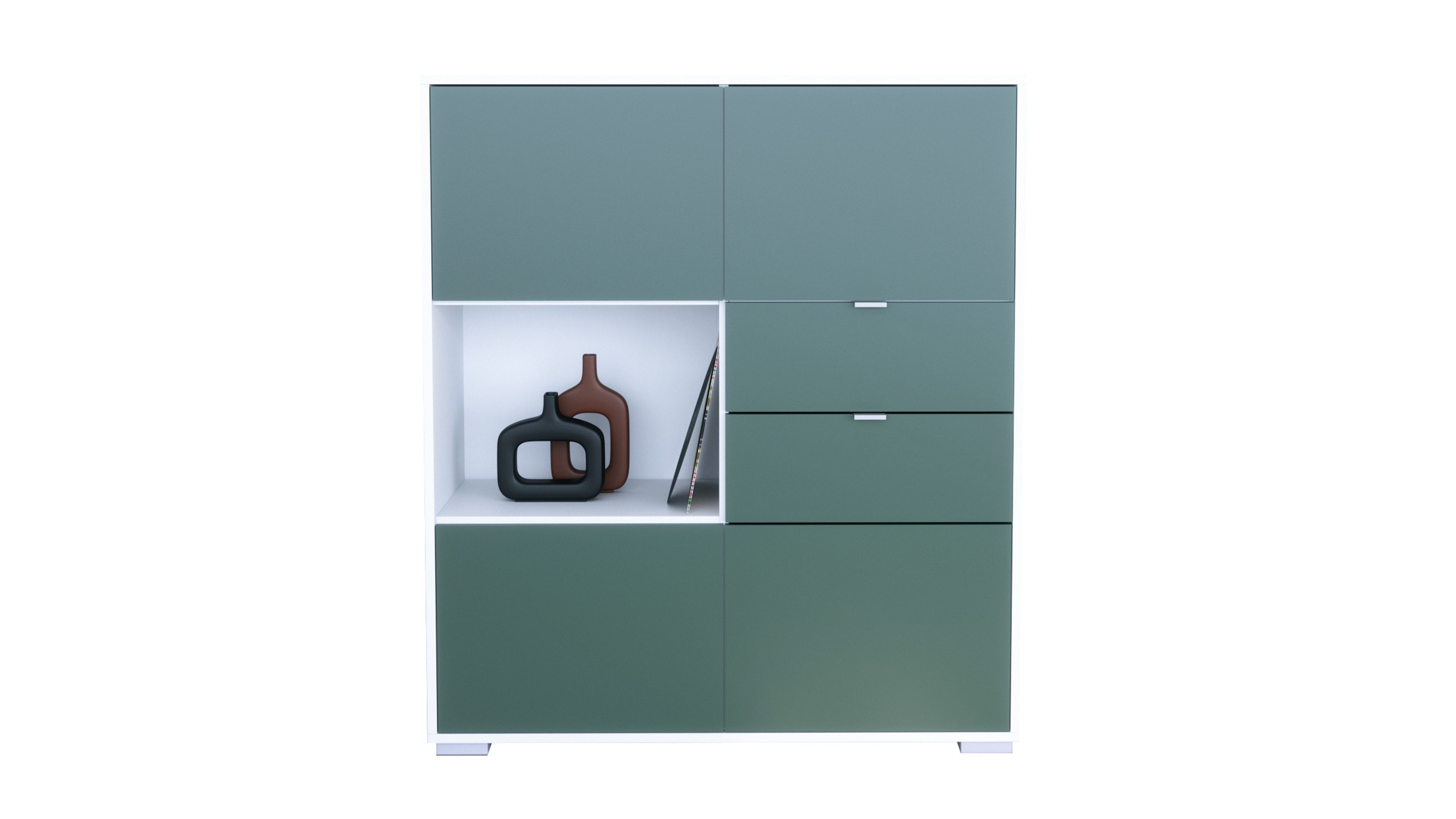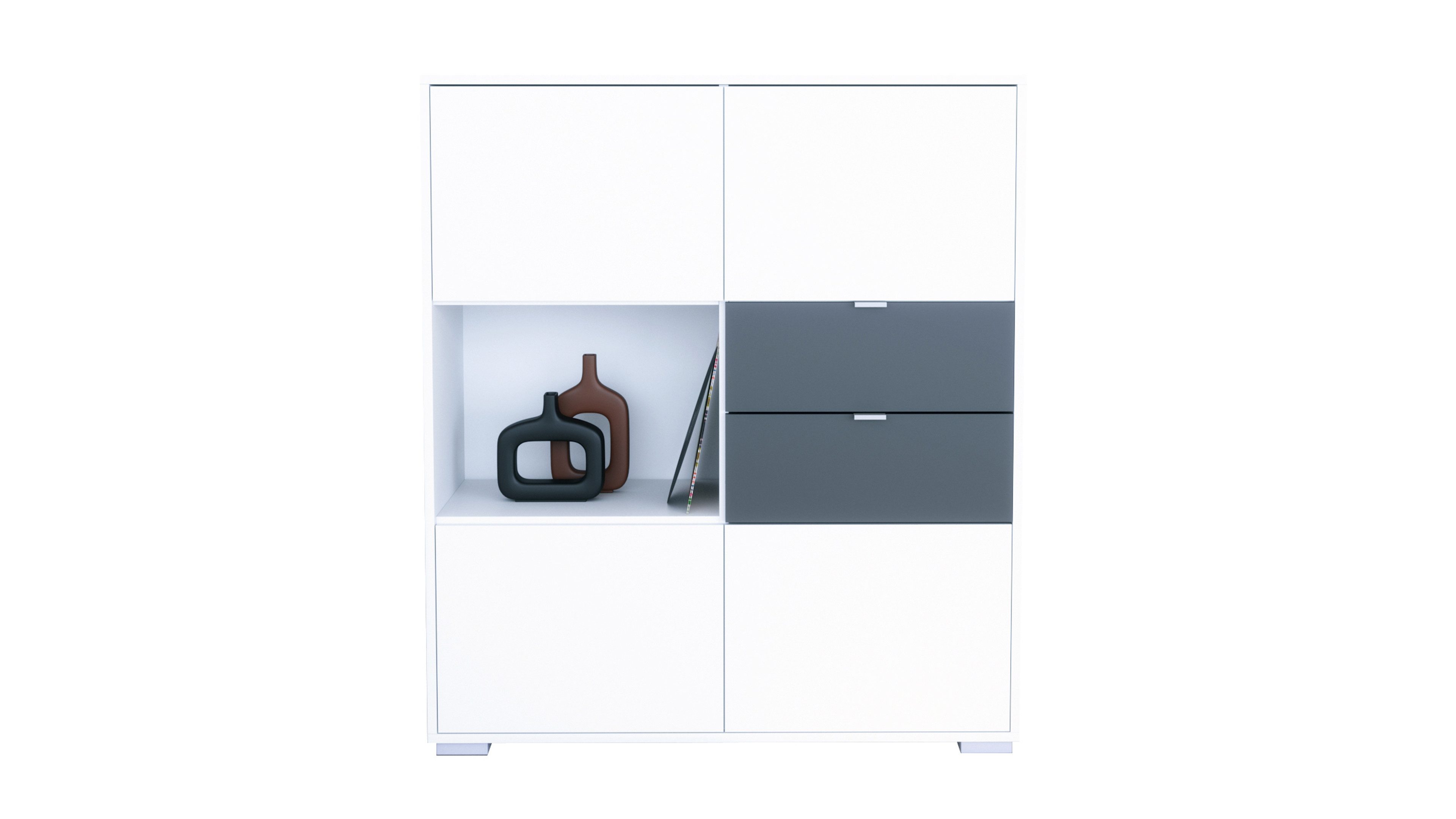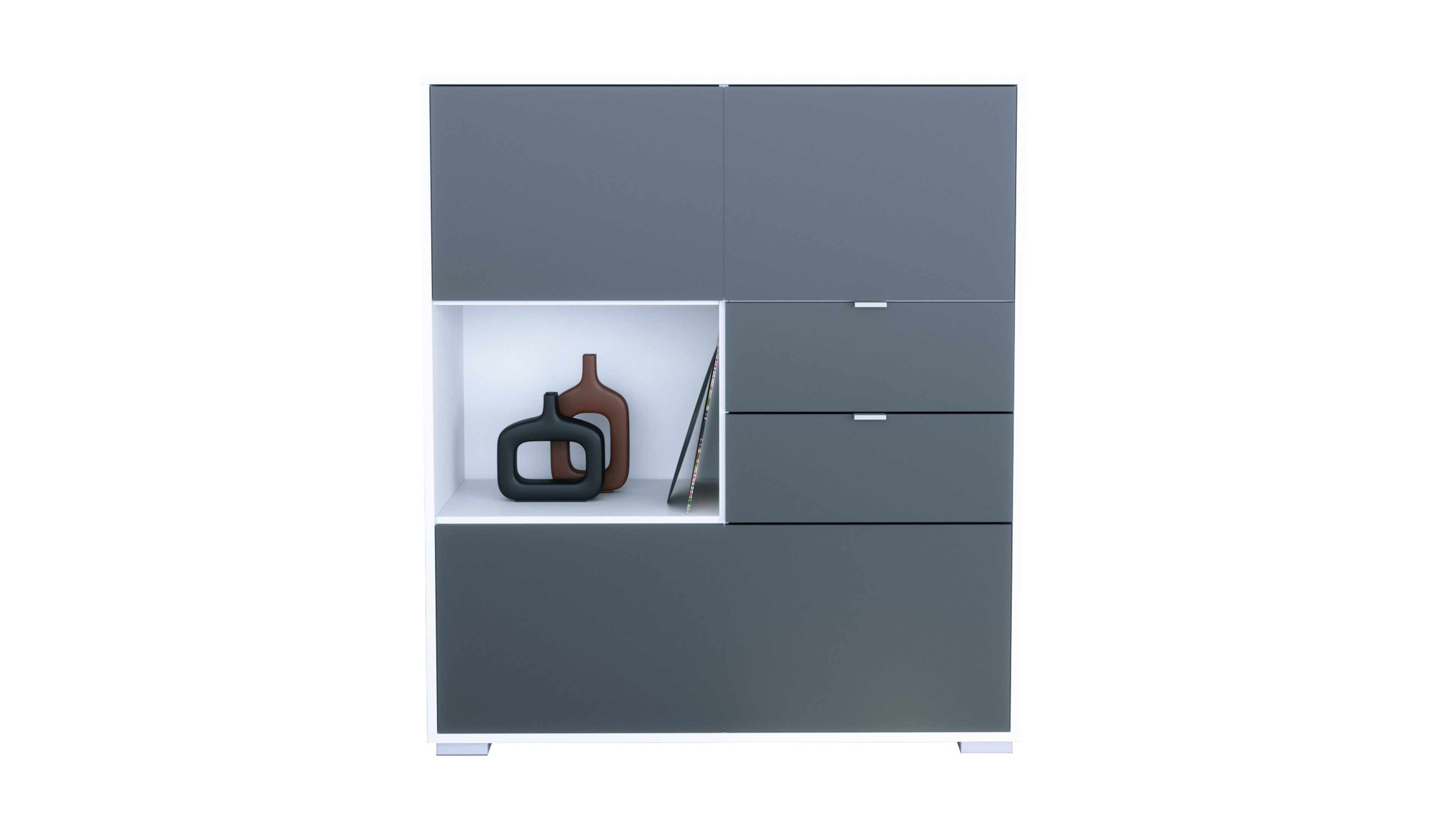 Oben und unten befinden sich jeweils zwei Türen mit Push-to-Open-Funktion, die insgesamt vier geschlossene Innenfächer bieten – ideal als Kommode, Highboard, Schrank oder Aufbewahrungsschrank. Auf der linken Seite sorgt ein offenes Fach für dekorative Akzente oder Technik. Direkt rechts daneben befinden sich zwei praktische Schubladen mit hochwertigen Metallgriffen, perfekt für Besteck, Unterlagen oder Kleinartikel.