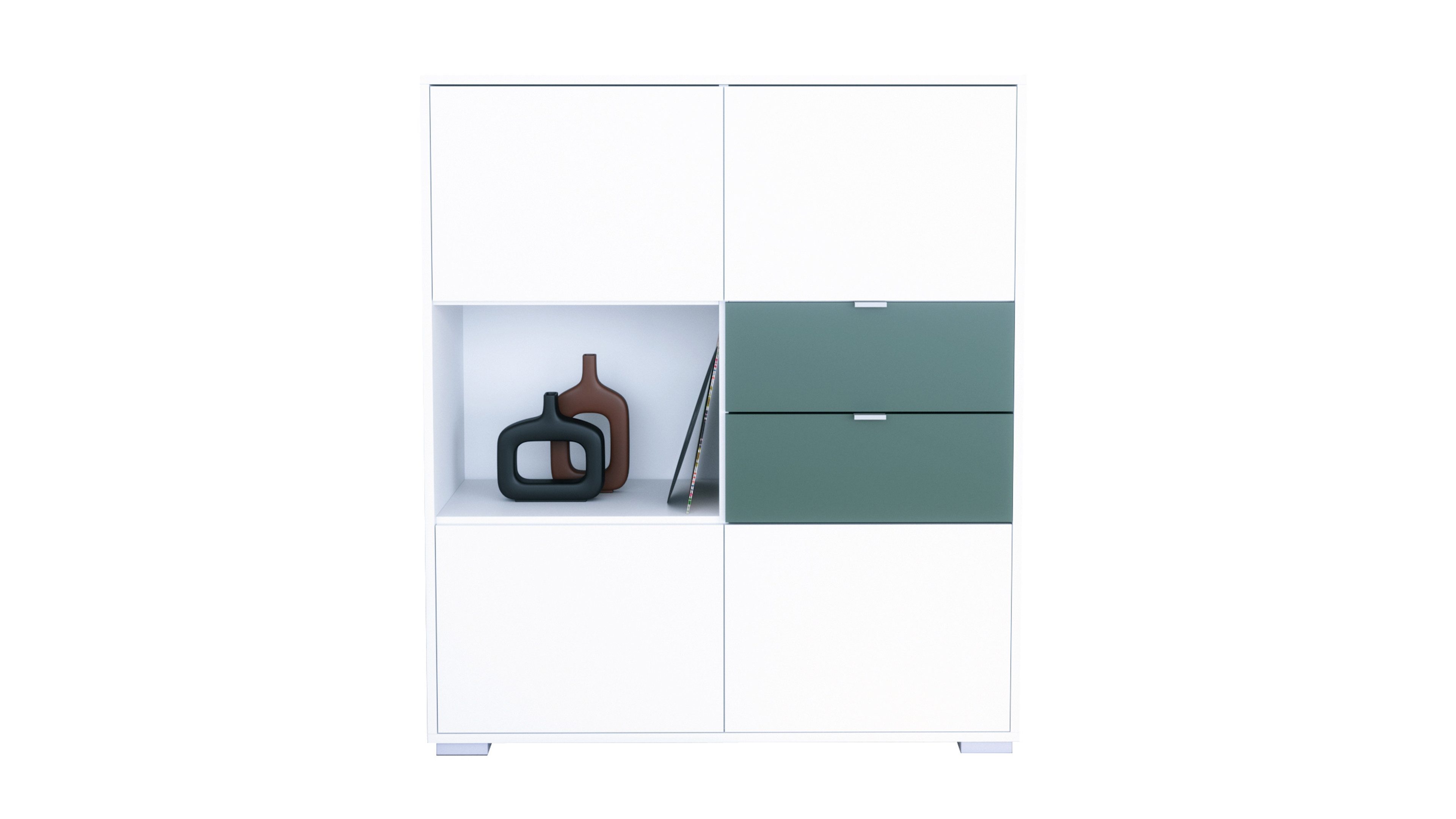 Das Milano Highboard V1 vereint stilvolles Design mit cleverem Stauraum. Der Korpus in Weiß matt verleiht dem Möbelstück eine zeitlose, elegante Ausstrahlung. Silberne Füße sorgen für Stabilität und dezente Akzente. Die Frontfarbe ist individuell wählbar – ideal für Wohnzimmer, Schlafzimmer, Esszimmer oder Flur.