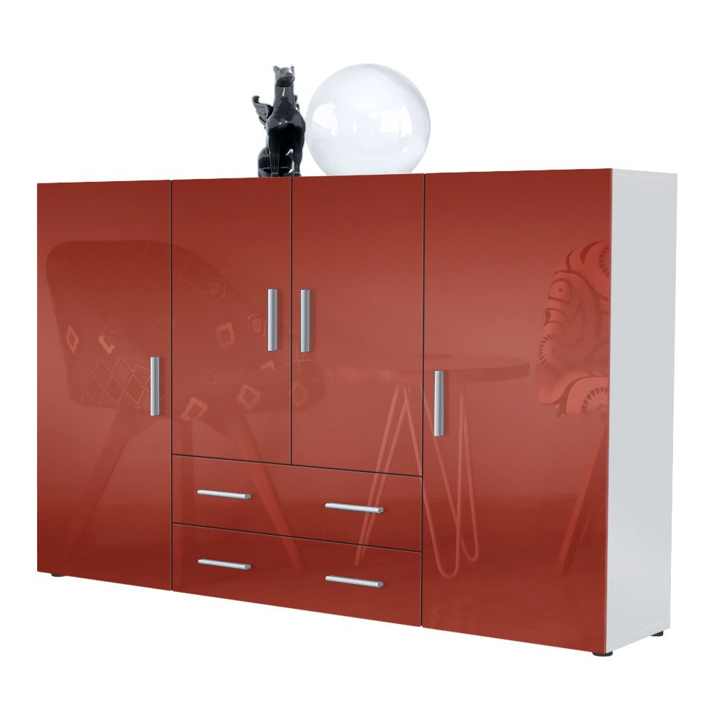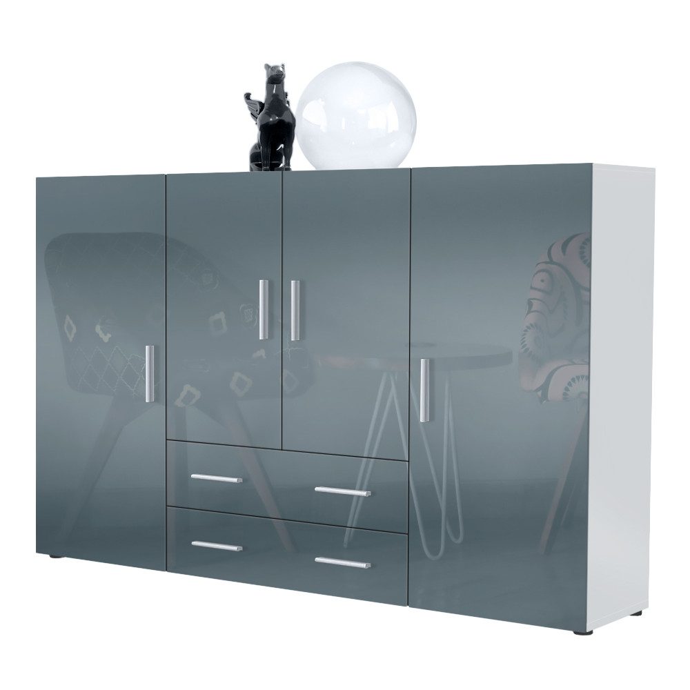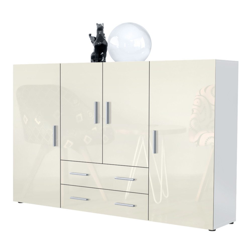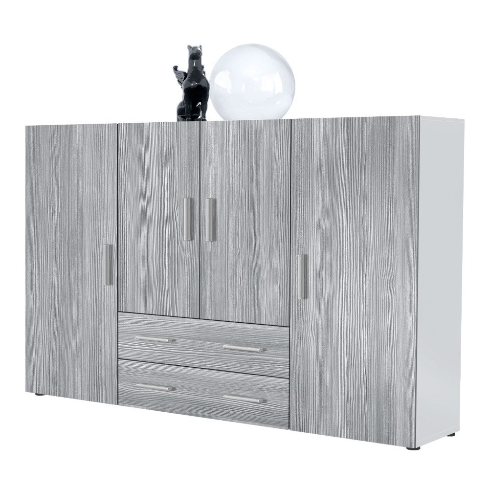 In seinen insgesamt acht geschlossenen Fächern verschiedener Größen und zwei länglichen Schubladen können zahlreiche Gegenstände sicher und abseits neugieriger Augen aufbewahrt werden. Dabei sind die 4 Türen und 2 Schubladen harmonisch aufeinander abgestimmt. Auch die abgerundeten, silberfarbenen Kunststoffgriffe tragen zum modernen Look des hohen Sideboards bei. So gelingt es dem Highboard Nora jeden Wohnraum um ein großartiges Platzangebot zu erweitern.