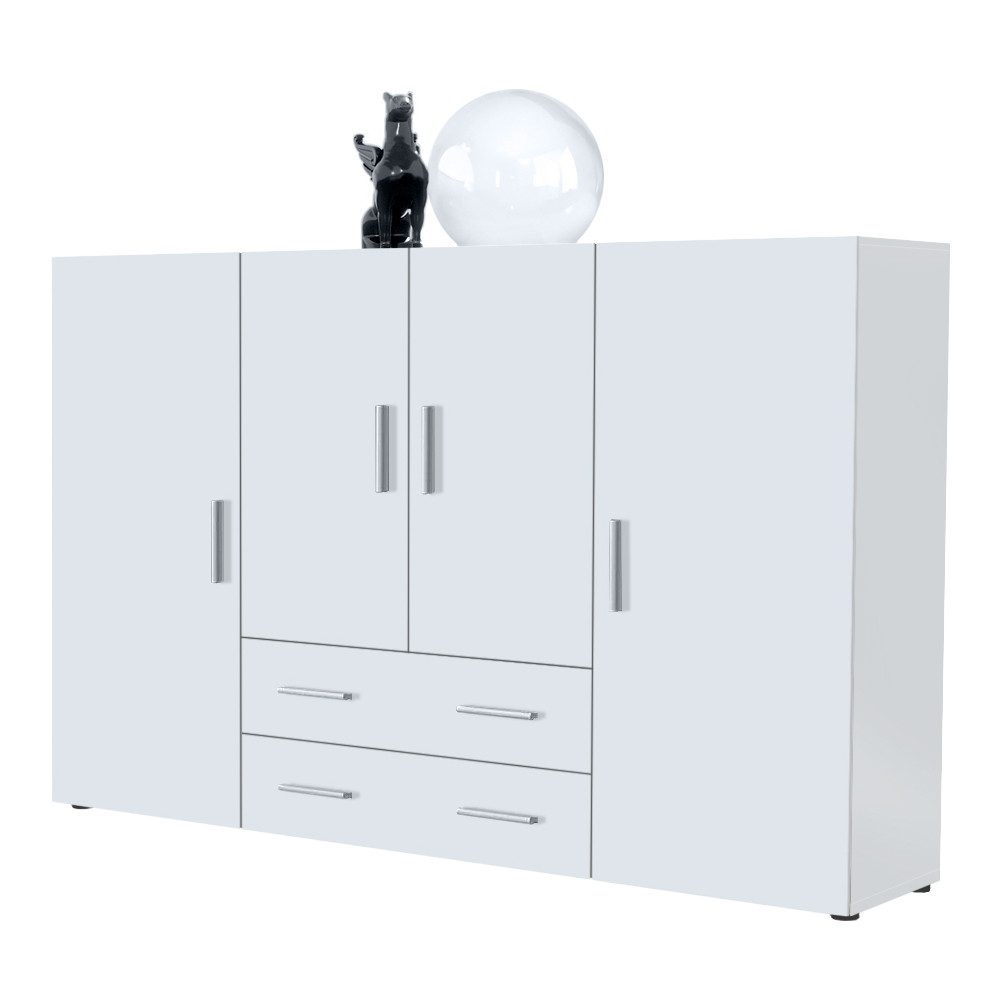 In seinen insgesamt acht geschlossenen Fächern verschiedener Größen und zwei länglichen Schubladen können zahlreiche Gegenstände sicher und abseits neugieriger Augen aufbewahrt werden. Dabei sind die 4 Türen und 2 Schubladen harmonisch aufeinander abgestimmt. Auch die abgerundeten, silberfarbenen Kunststoffgriffe tragen zum modernen Look des hohen Sideboards bei. So gelingt es dem Highboard Nora jeden Wohnraum um ein großartiges Platzangebot zu erweitern.