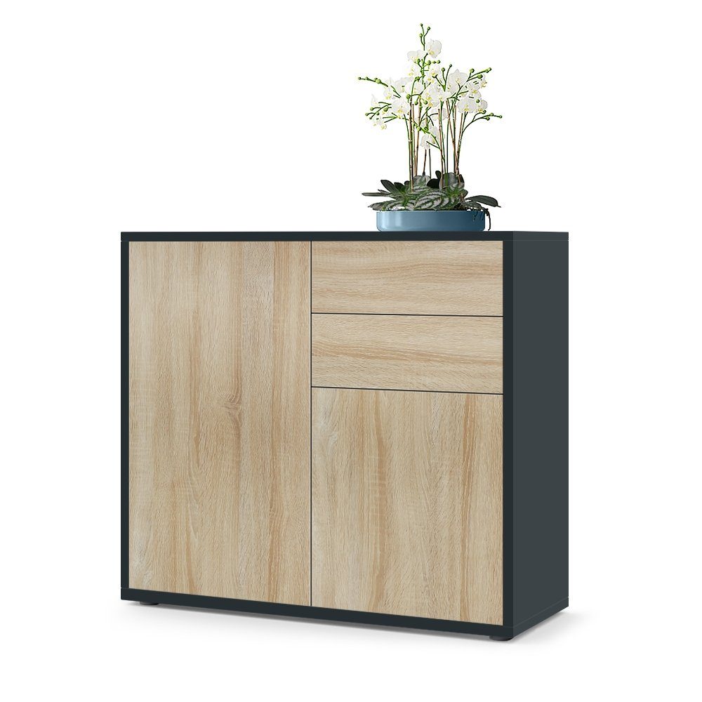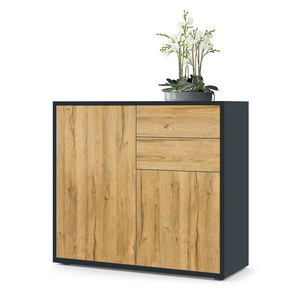 Ob als modernes Sideboard im Wohnzimmer, Kommodenschrank für's Schlafzimmer, Anrichte im Flur oder als Kommode im Kinderzimmer – die geräumige Kommode Ben präsentiert sich als praktisches Möbelstück mit modernem Design, hergestellt in Deutschland. Der Beistellschrank ist mit einer großen Tür, einer kleinen Tür und zwei leichtgängigen Schubladen ausgerüstet. Die Schubkästen verlaufen dank Laufschienen aus Metall nahezu geräuschlos und sorgen für eine leichte Handhabung. Hinter den Türen befinden sich jeweils zwei geräumige Fächer mit Einlegeboden. Die Türen und Schubladen sind mit unserem Push-to-Open-System ausgestattet. Eine Rückwand in Holzoptik aus Hartfaserplatten ist im Lieferumfang enthalten.