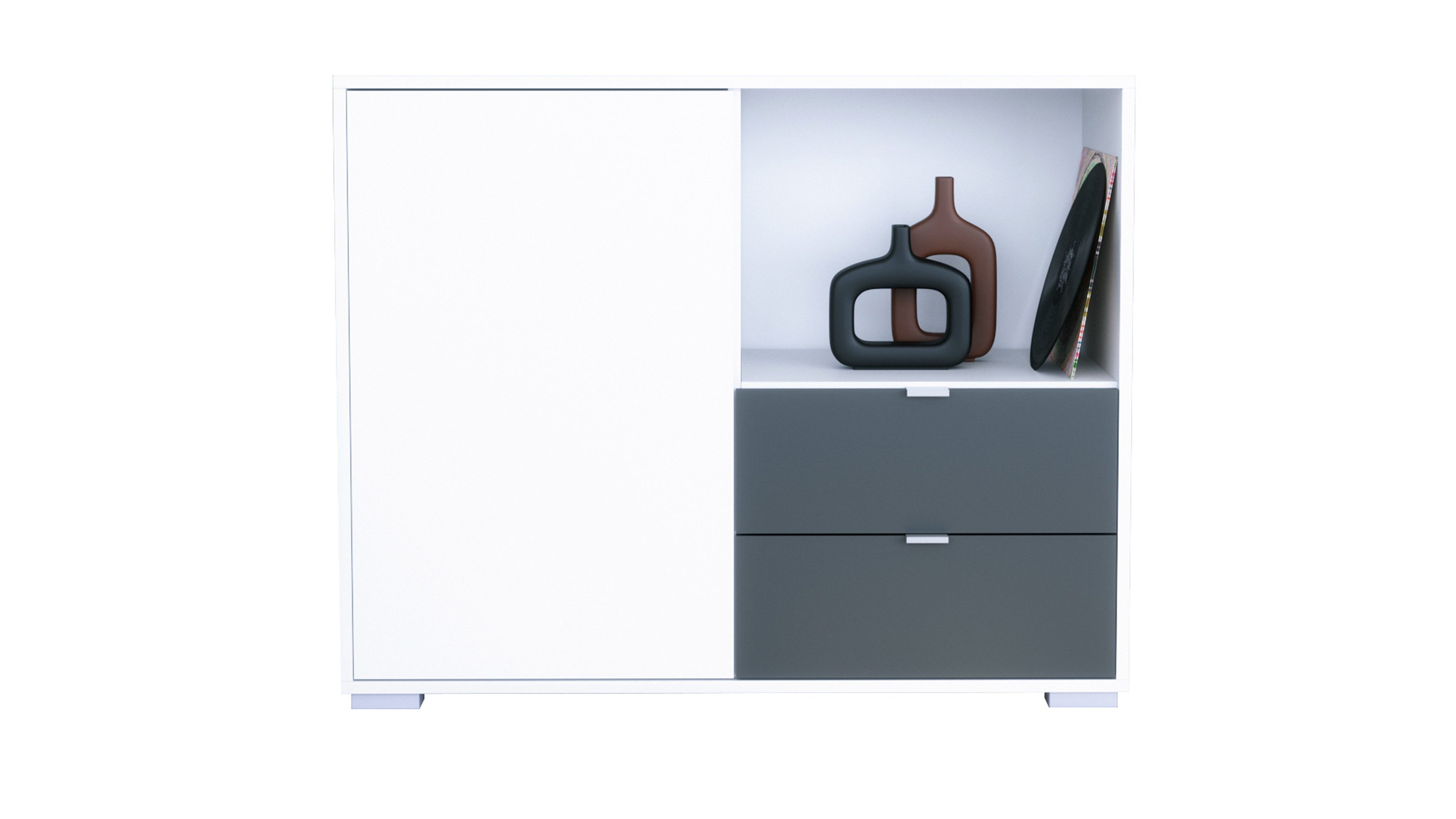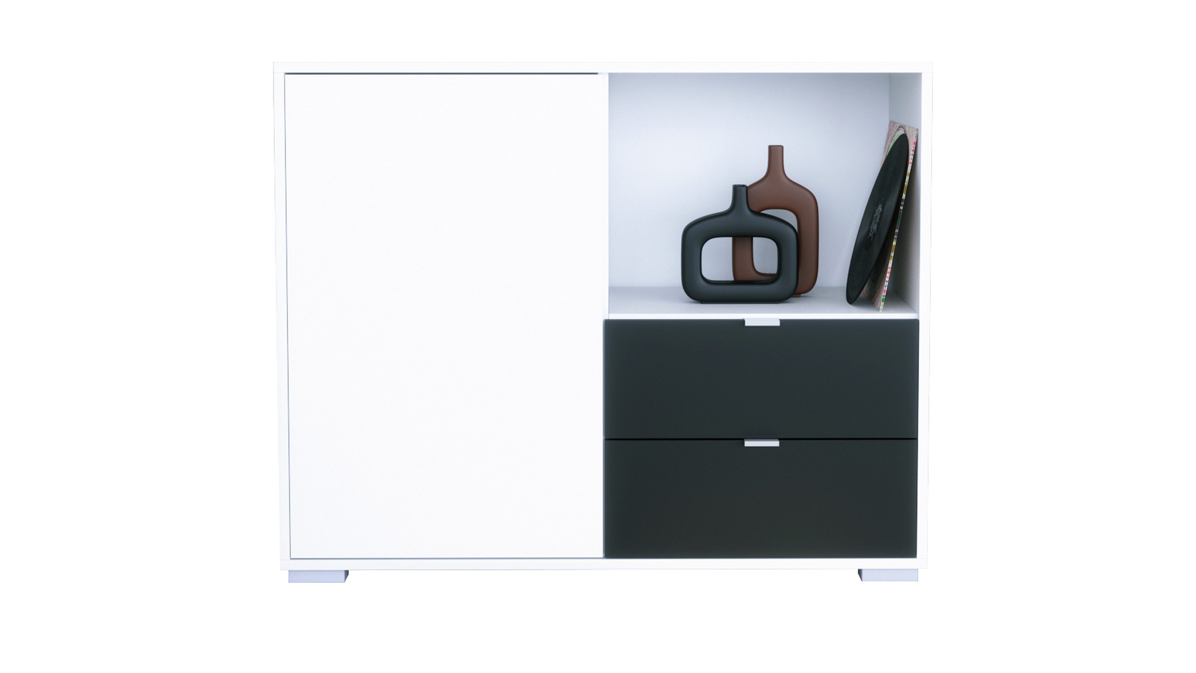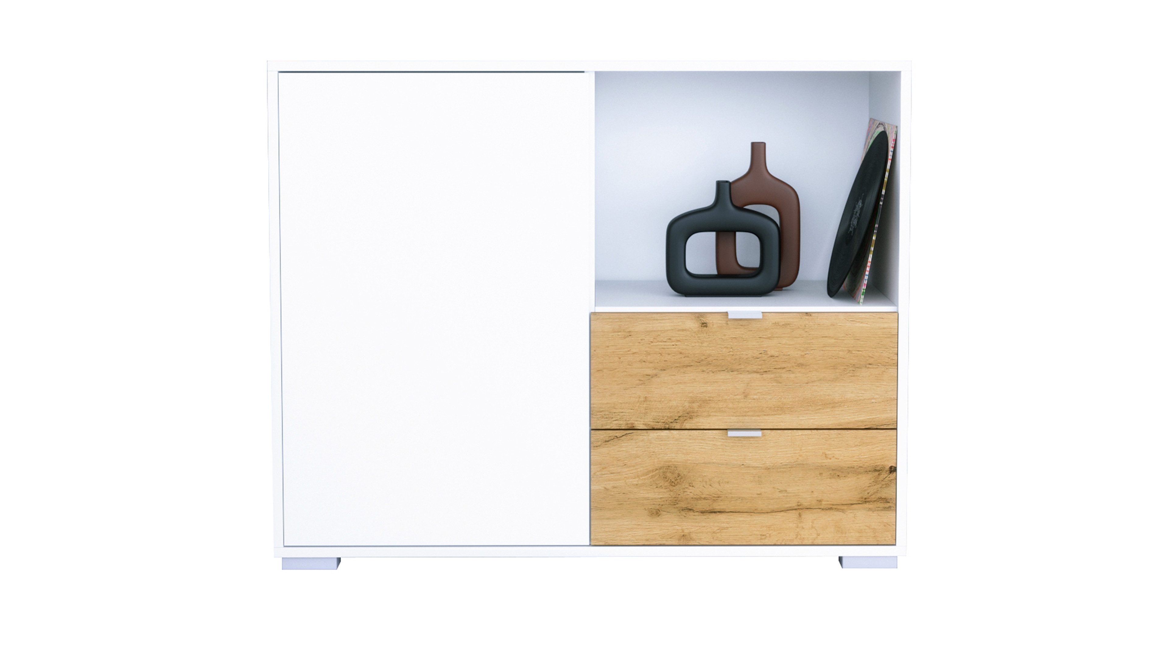 Hinter der einzigen Tür mit Push-to-Open-Funktion verbergen sich zwei praktische Innenfächer – ideal als Kommode, Schrank oder Aufbewahrungsschrank für Haushaltsgegenstände, Deko oder Geschirr. Auf der rechten Seite befindet sich ein offenes Fach, das sich ideal für Dekoration, Pflanzen oder Technik eignet. Direkt darunter liegen zwei geräumige Schubladen mit hochwertigen Metallgriffen, die viel Platz für Kleinteile, Besteck oder Dokumente bieten.
