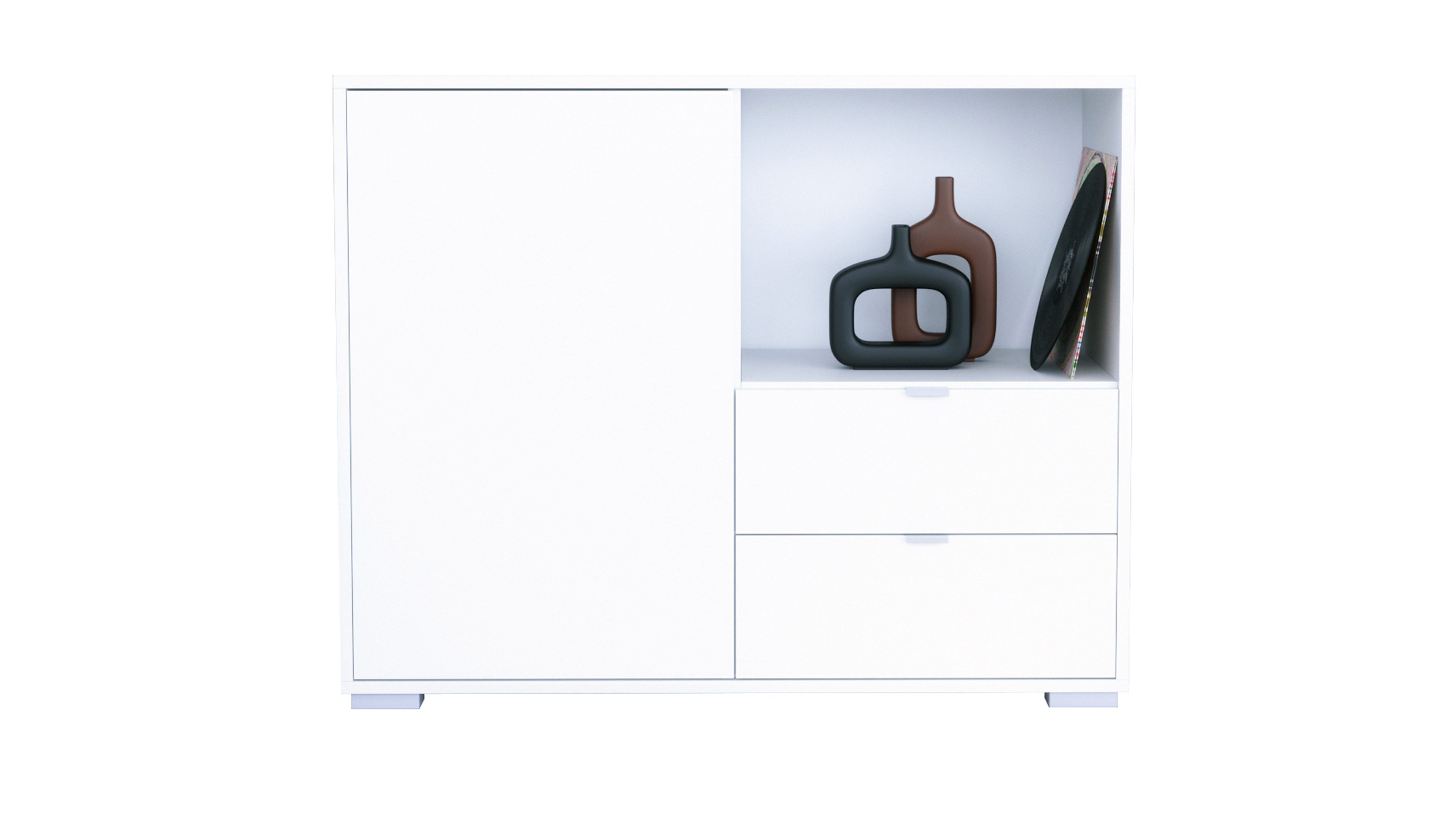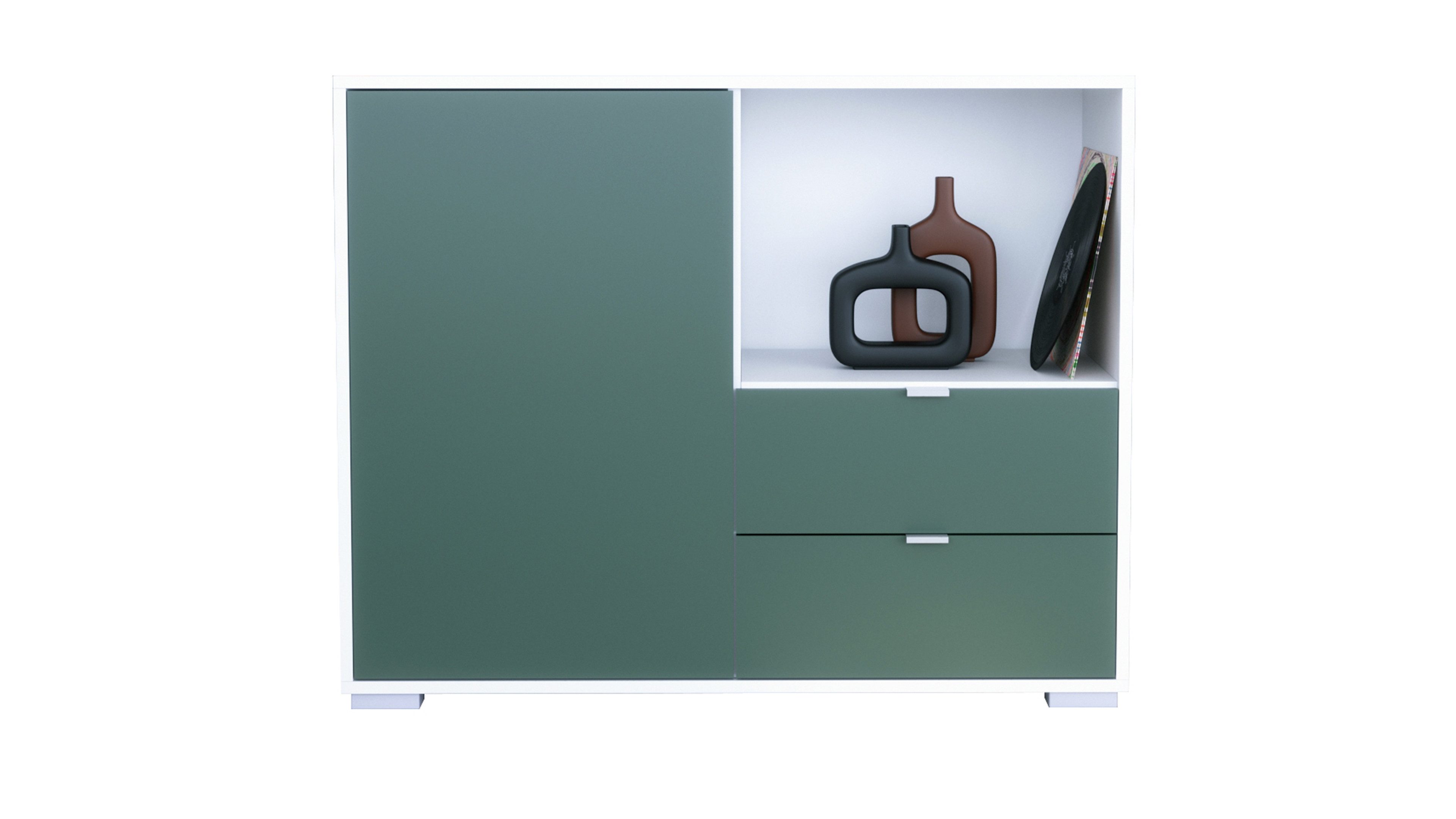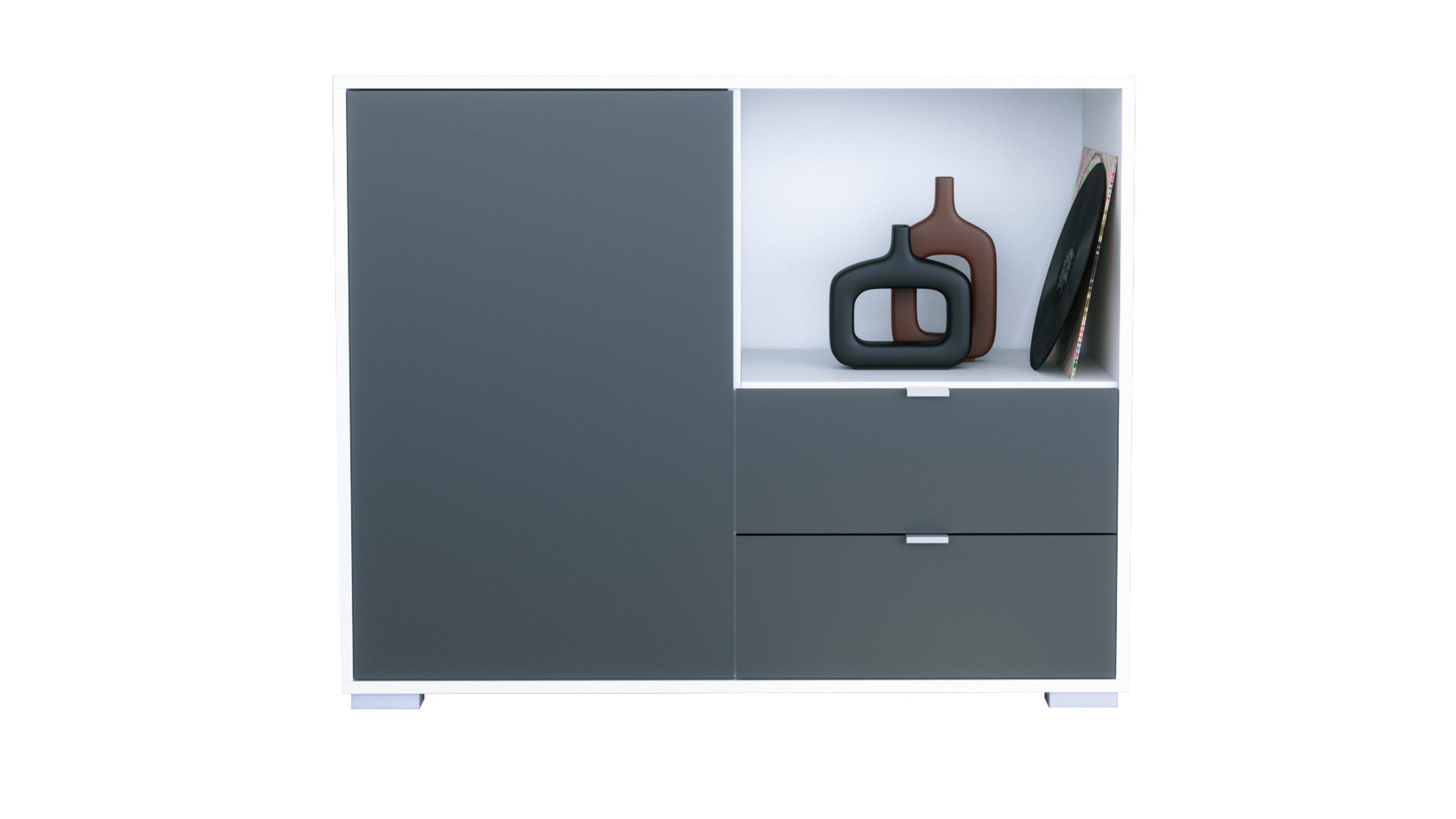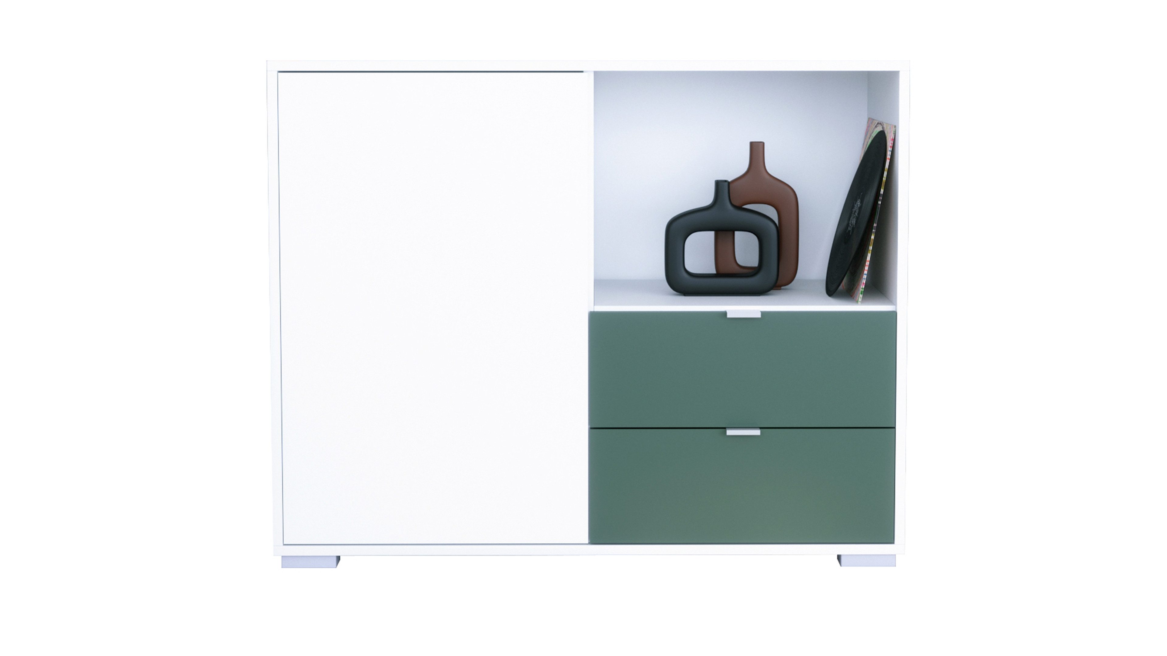 Hinter der einzigen Tür mit Push-to-Open-Funktion verbergen sich zwei praktische Innenfächer – ideal als Kommode, Schrank oder Aufbewahrungsschrank für Haushaltsgegenstände, Deko oder Geschirr. Auf der rechten Seite befindet sich ein offenes Fach, das sich ideal für Dekoration, Pflanzen oder Technik eignet. Direkt darunter liegen zwei geräumige Schubladen mit hochwertigen Metallgriffen, die viel Platz für Kleinteile, Besteck oder Dokumente bieten.