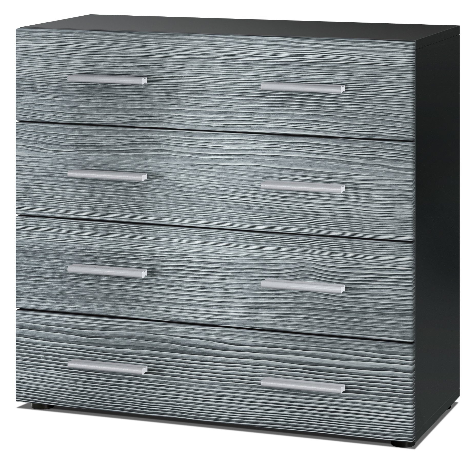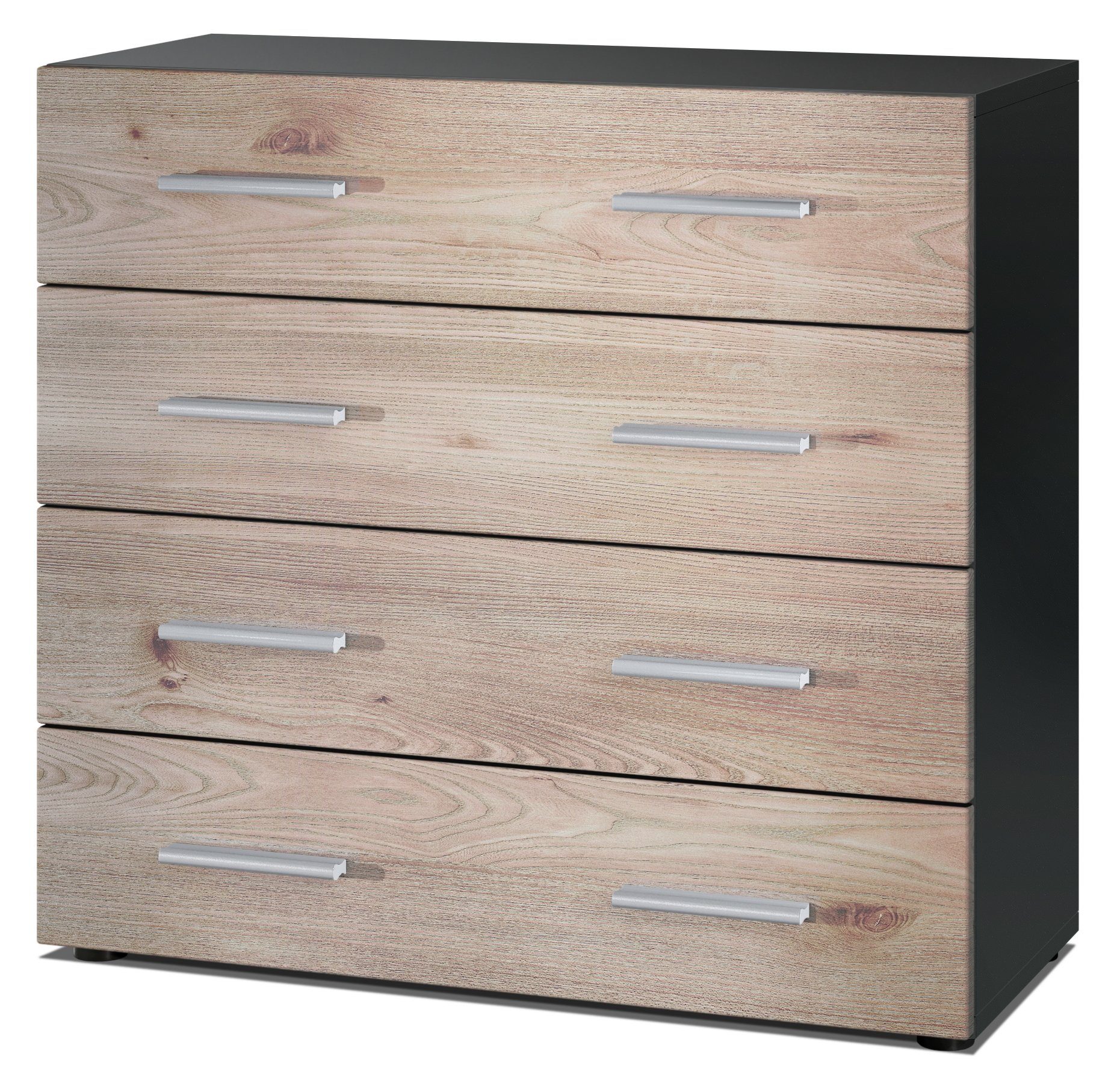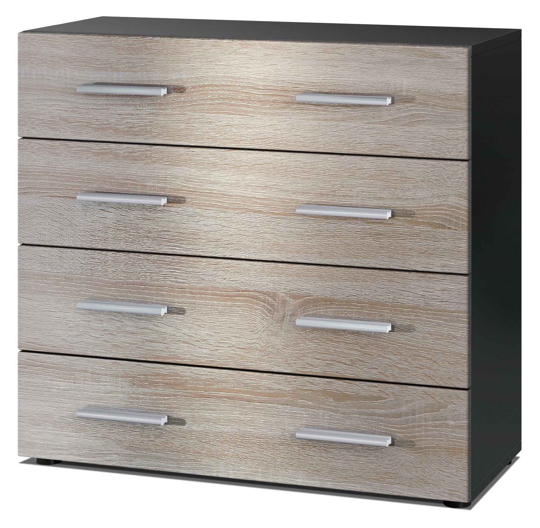 Ob als modernes Sideboard im Wohnzimmer, Kommodenschrank für's Schlafzimmer, Anrichte im Flur oder als Kommode im Kinderzimmer - die geräumige Kommode Pavos präsentiert sich als praktisches Möbelstück mit modernem Design, hergestellt in Deutschland. Der Beistellschrank ist mit vier leichtgängigen Schubladen ausgerüstet. Diese verlaufen dank Laufschienen aus Metall nahezu geräuschlos und sorgen für eine leichte Handhabung. Die Schubladen sind mit dezenten, silbernen Griffen ausgestattet. Optional können Sie zusätzlich eine aufgesetzte Glasablage für das Sideboard wählen. Der Glasaufsatz bietet weitere Ablagefläche und lädt zum Dekorieren ein. Eine Rückwand in Holzoptik aus Hartfaserplatten ist im Lieferumfang enthalten.
