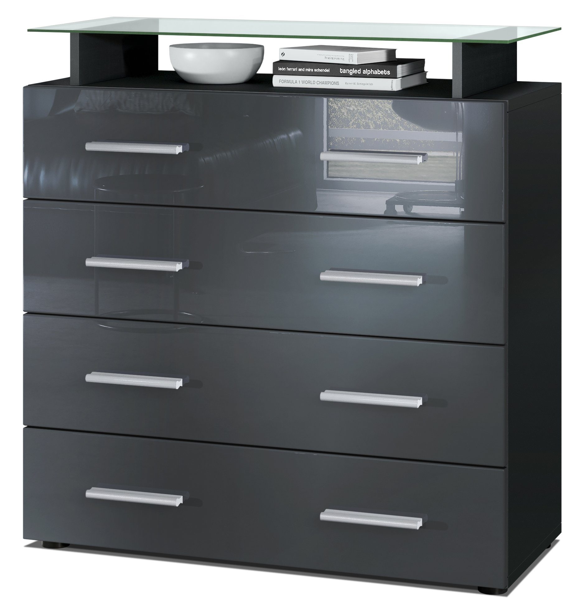 Ob als modernes Sideboard im Wohnzimmer, Kommodenschrank für's Schlafzimmer, Anrichte im Flur oder als Kommode im Kinderzimmer - die geräumige Kommode Pavos V2 präsentiert sich als praktisches Möbelstück mit modernem Design, hergestellt in Deutschland. Der Beistellschrank ist mit einer dekorativen Glasablage und vier leichtgängigen Schubladen ausgerüstet. Diese verlaufen dank Laufschienen aus Metall nahezu geräuschlos und sorgen für eine leichte Handhabung. Die Schubladen sind mit dezenten, silbernen Griffen ausgestattet. Optional können Sie das Sideboard auch ohne die Glasablage wählen. Eine Rückwand in Holzoptik aus Hartfaserplatten ist im Lieferumfang enthalten.