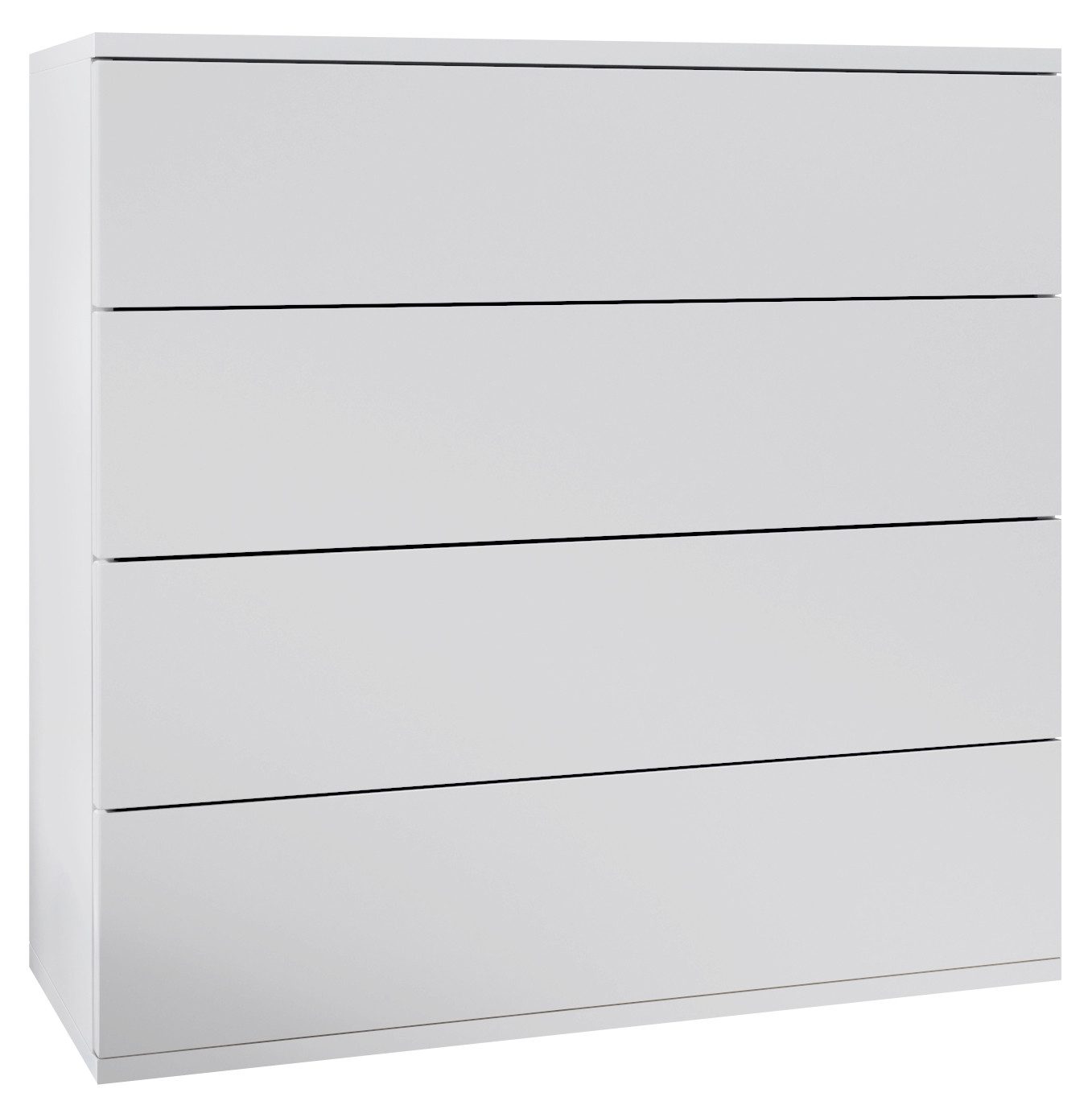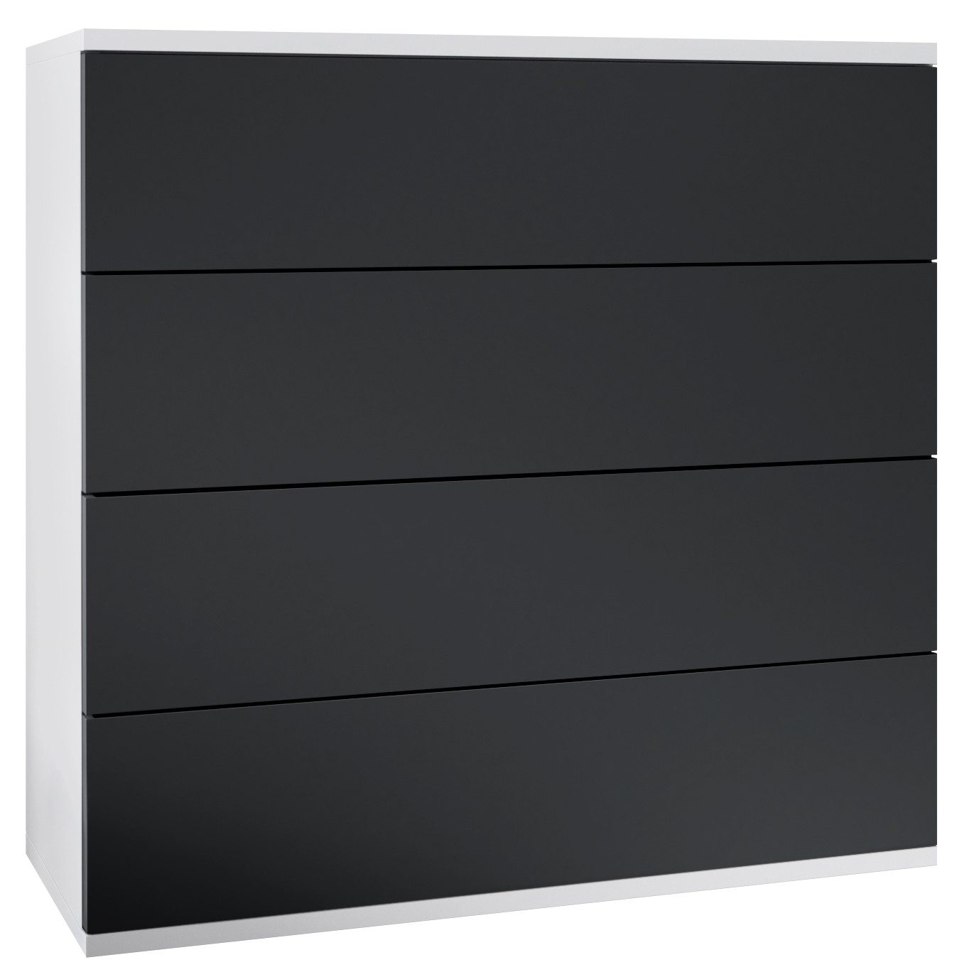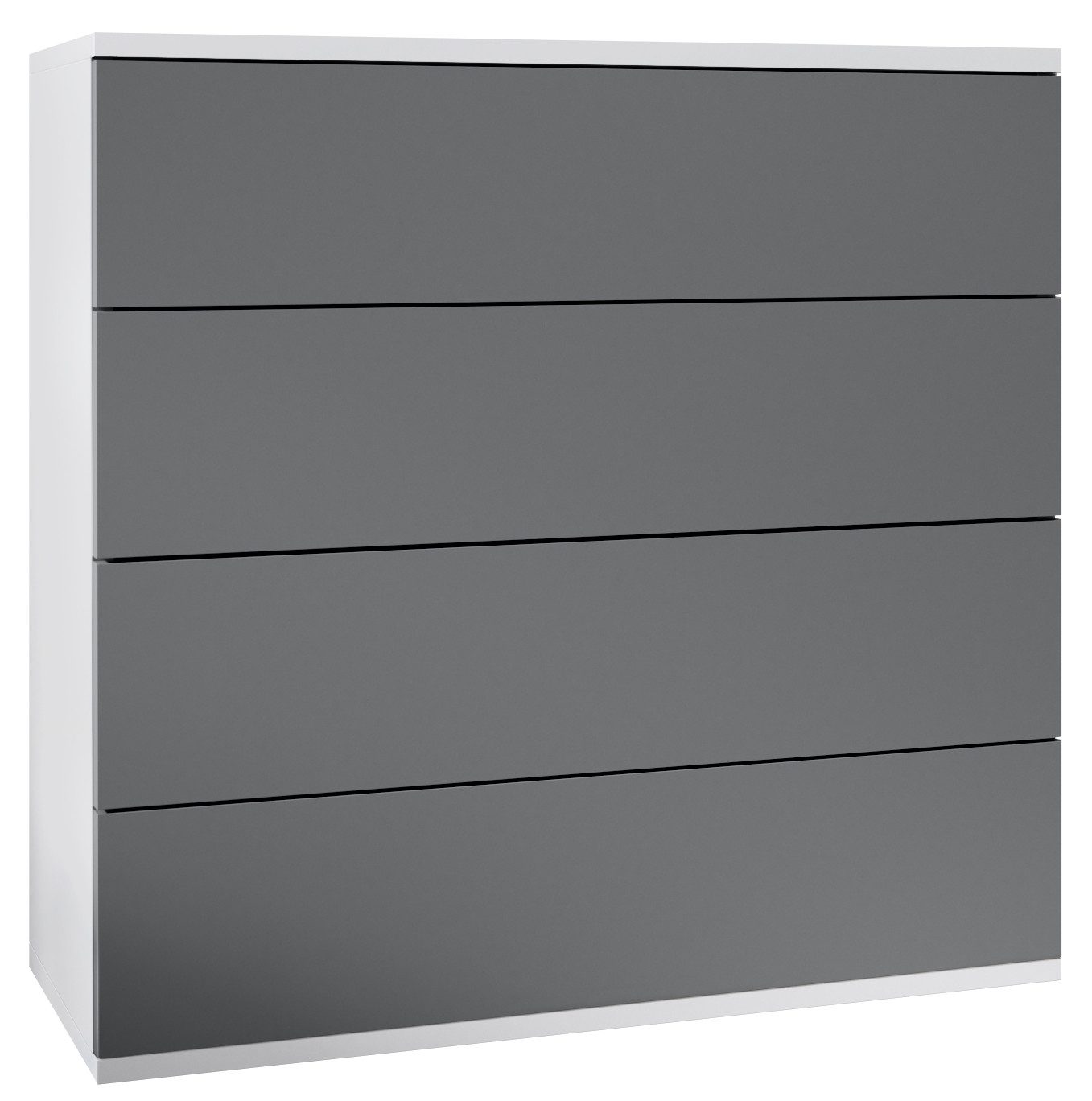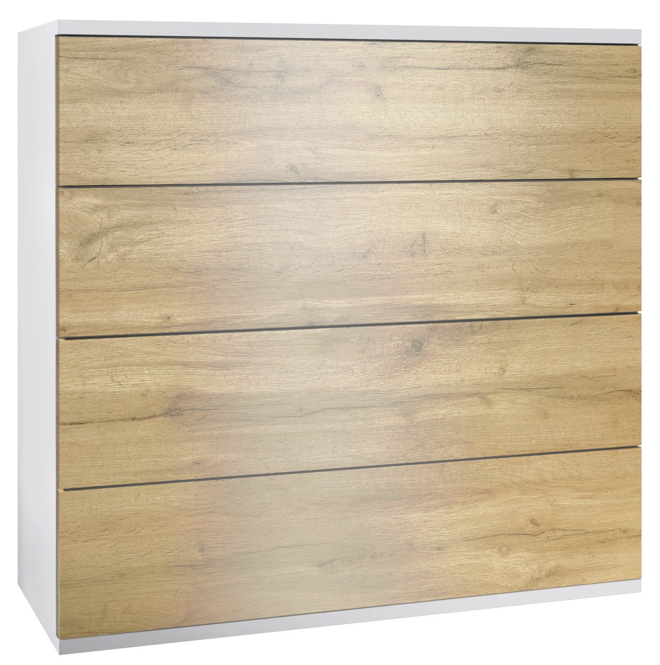 Ob als modernes Sideboard im Wohnzimmer, Kommodenschrank für's Schlafzimmer, Anrichte im Flur oder als Kommode im Kinderzimmer - die geräumige und schwebende Kommode Pavos V3 präsentiert sich als praktisches Möbelstück mit modernem Design, hergestellt in Deutschland. Der Beistellschrank verfügt über vier leichtgängige Schubladen, die sich dank des innovativen Push-to-Open-Systems mühelos durch einen einfachen Druck öffnen lassen. Die Schubladen gleiten nahezu geräuschlos auf stabilen Metallschienen, was eine besonders komfortable Nutzung gewährleistet. Eine Rückwand in Holzoptik aus Hartfaserplatten ist im Lieferumfang enthalten.