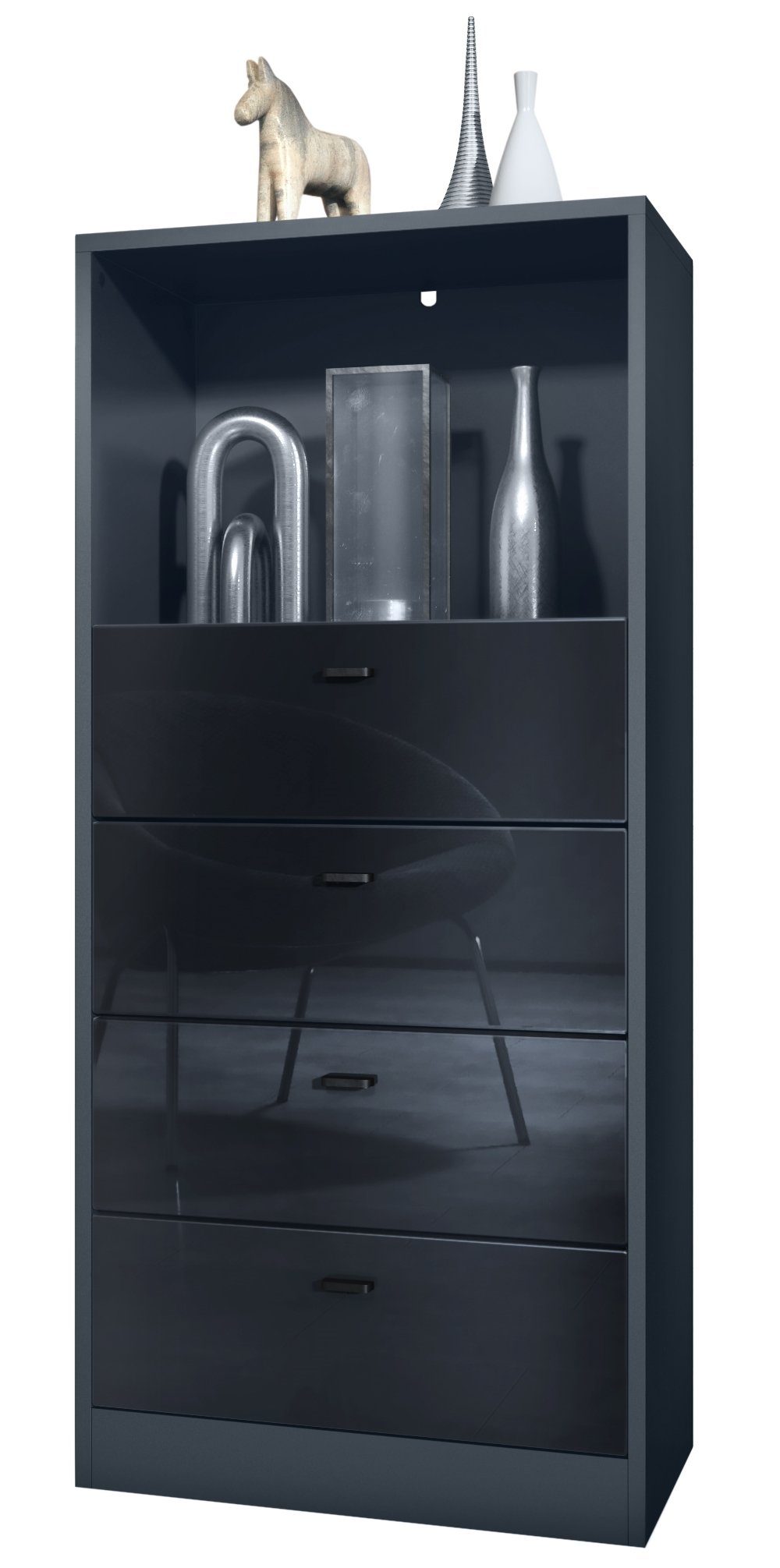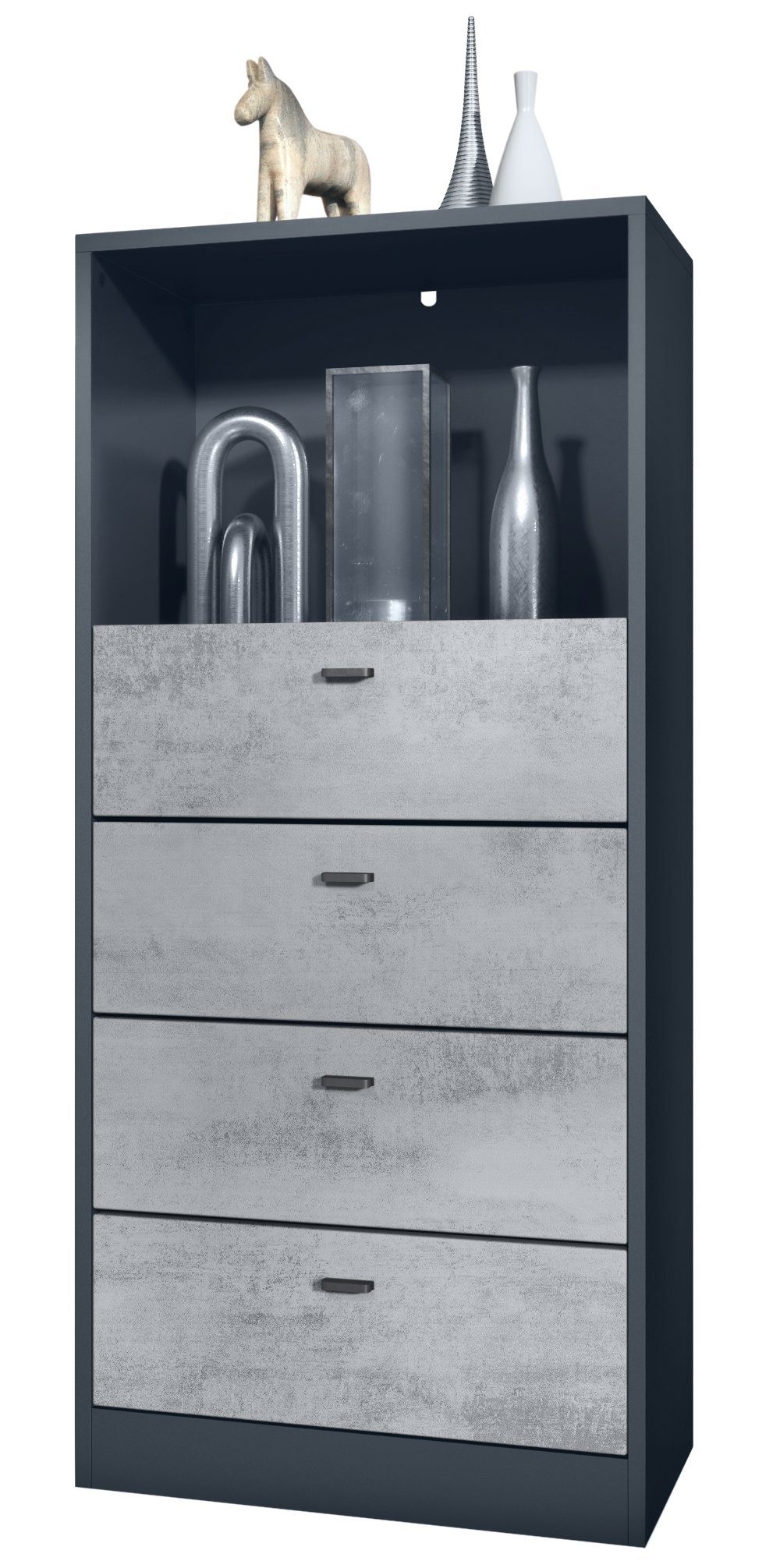 Ob als modernes Sideboard im Wohnzimmer, Kommodenschrank fürs Schlafzimmer, Anrichte im Flur oder als Kommode im Kinderzimmer - die geräumige Kommode Pino V3 präsentiert sich als praktisches Möbelstück mit modernem Design, hergestellt in Deutschland. Der Beistellschrank ist mit einem offenen Fach und vier Schubladen ausgerüstet. Diese verlaufen dank Laufschienen aus Metall nahezu geräuschlos und sorgen für eine leichte Handhabung. Die Schubladen der Kommode sind mit dezenten schwarzen Griffen ausgestattet. Eine Rückwand in Holzoptik aus Pressspan ist im Lieferumfang enthalten.
