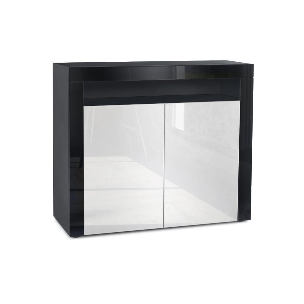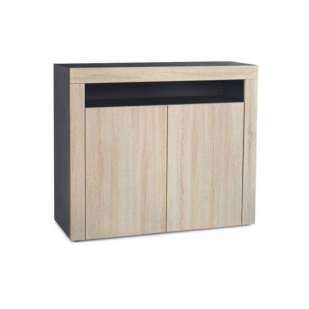 Ob als modernes Sideboard im Wohnzimmer, Kommodenschrank für's Schlafzimmer, Anrichte im Flur oder als Kommode im Kinderzimmer - die geräumige Kommode Valencia präsentiert sich als praktisches Möbelstück mit einer markanten Rahmenverkleidung, hergestellt in Deutschland. Der Beistellschrank ist mit zwei großen Türen und einem durchgehenden, offenen Fach ausgerüstet. Hinter den Türen befinden sich jeweils zwei geräumige Fächer mit Einlegeboden. Die Türen lassen sich ganz bequem durch praktische Überstände öffnen. Eine Rückwand in Holzoptik aus Hartfaserplatten ist im Lieferumfang enthalten.