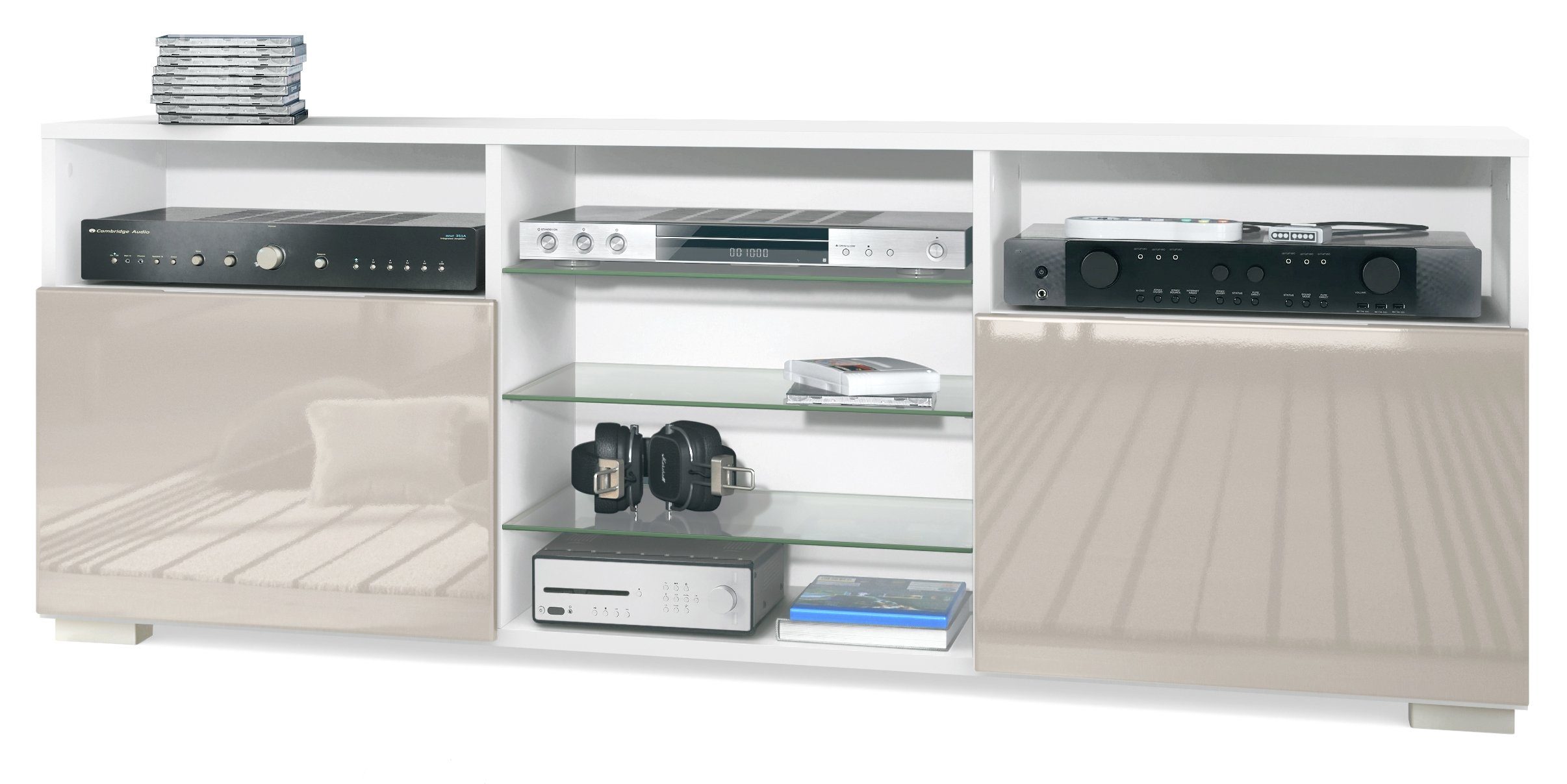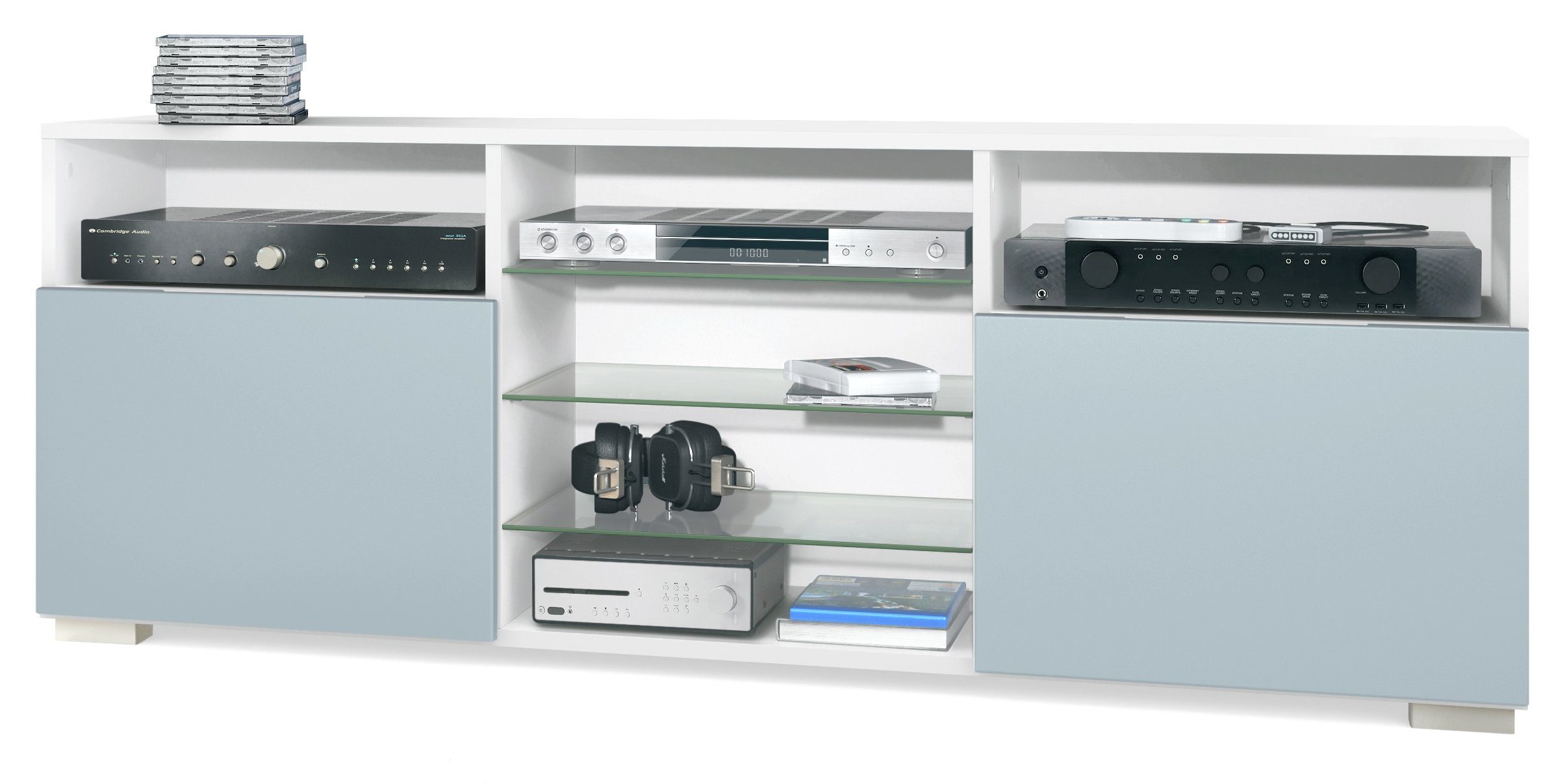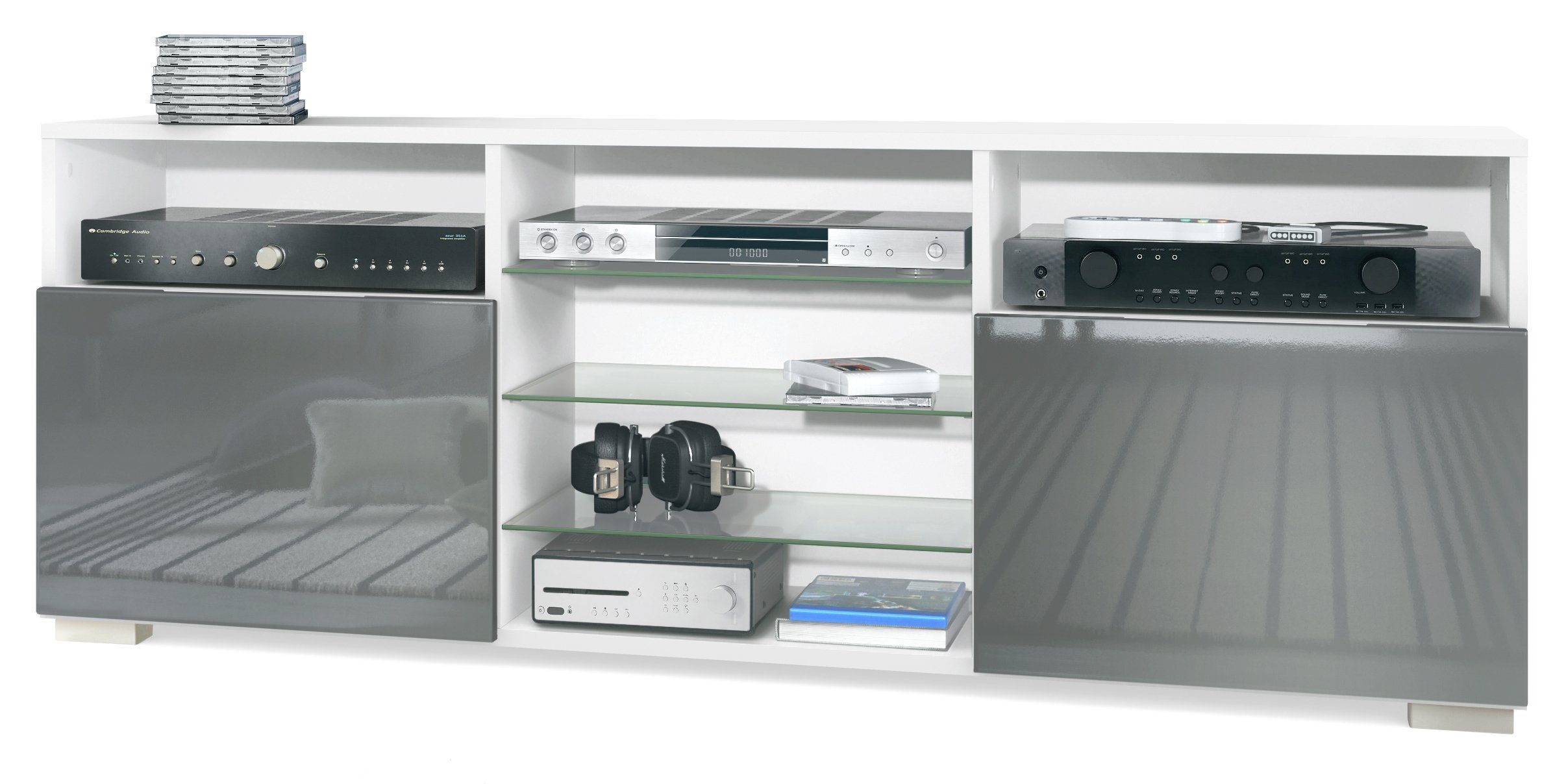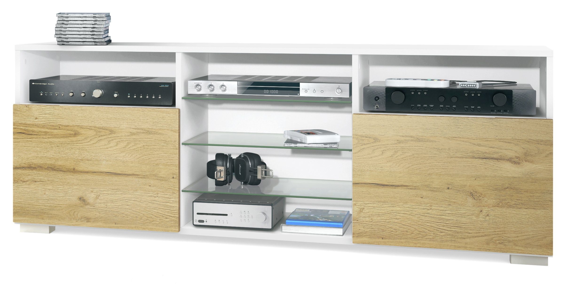 Hochwertig foliierte MDF-Fronten und ein Korpus aus Spanplatten mit Melaminbeschichtung gewährleisten eine langlebige und pflegeleichte Qualität. Das TV-Board ist leicht, stabil und bietet Ihnen somit ein Möbelstück, das sowohl funktional als auch robust ist – Verarbeitung Made in Germany.