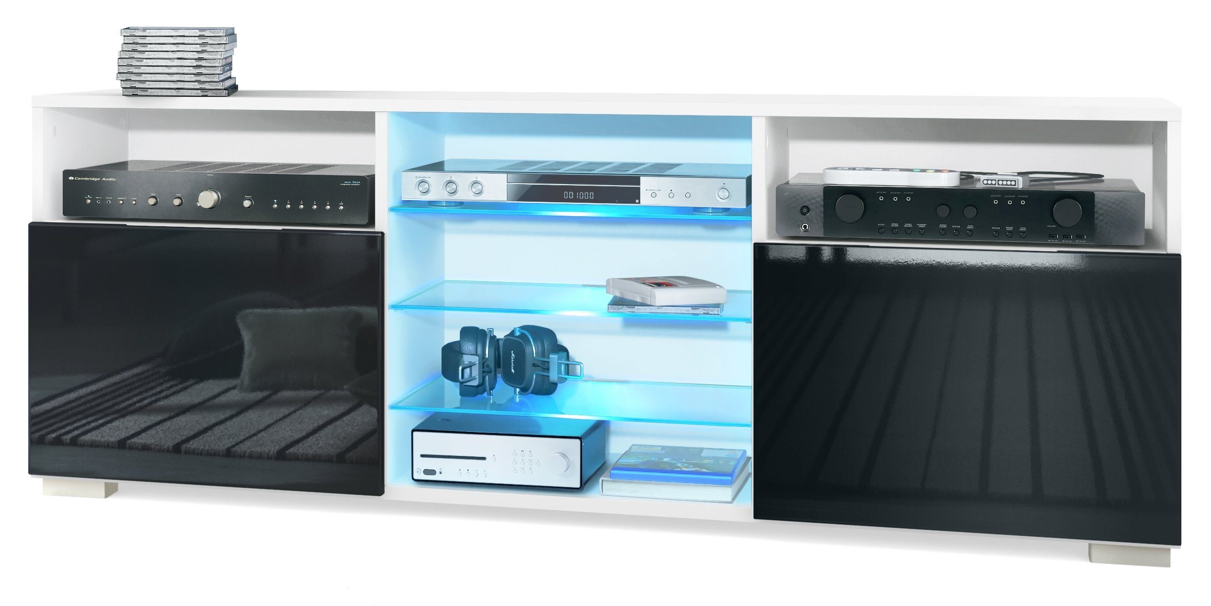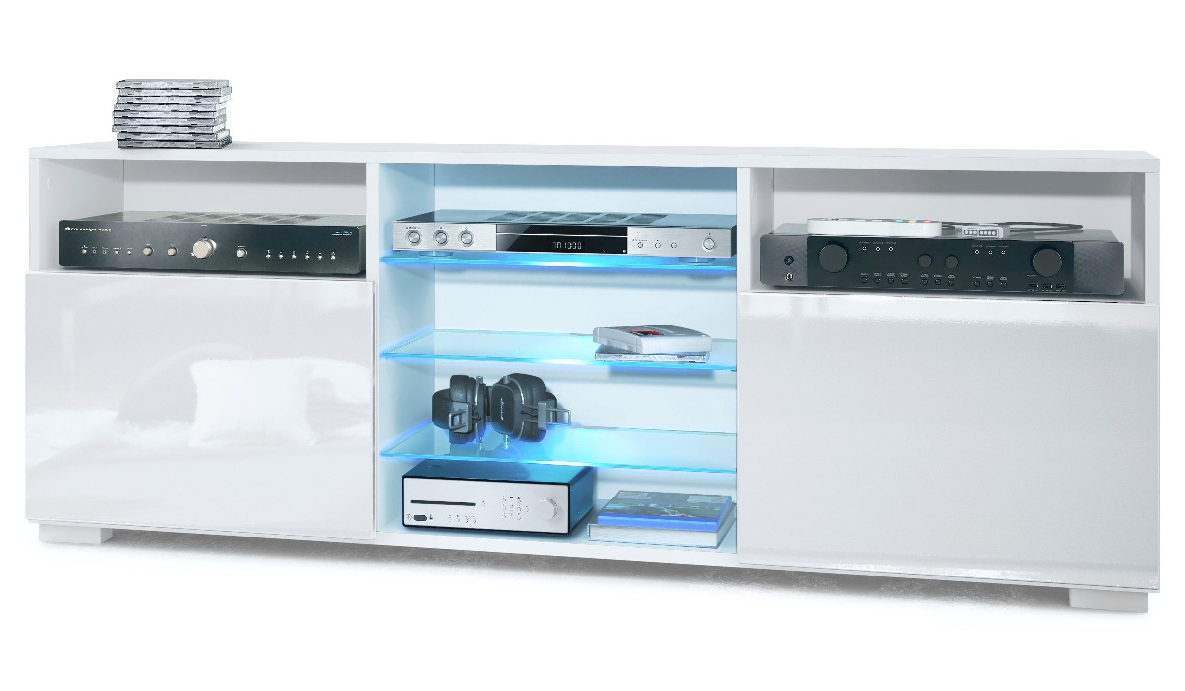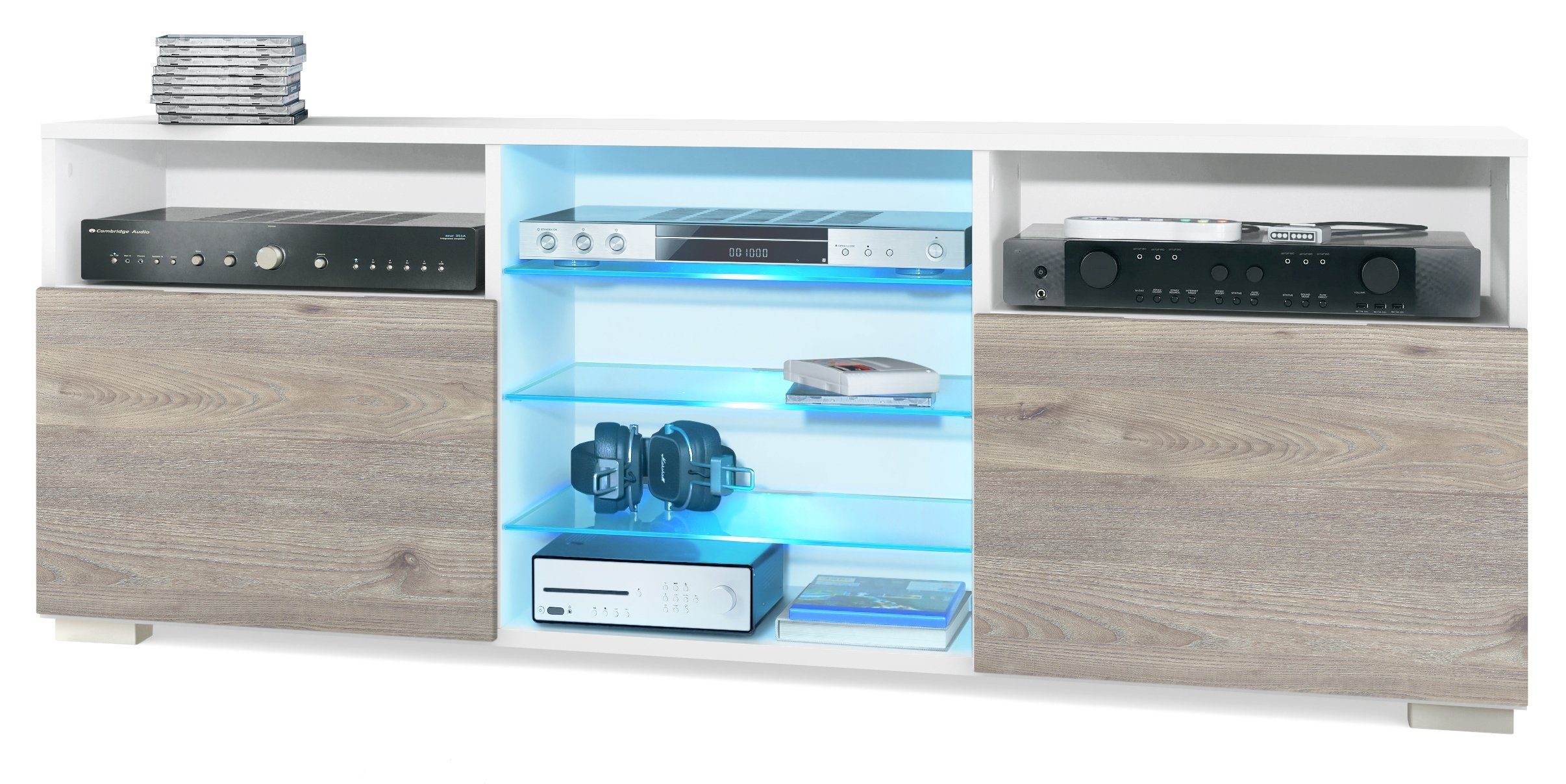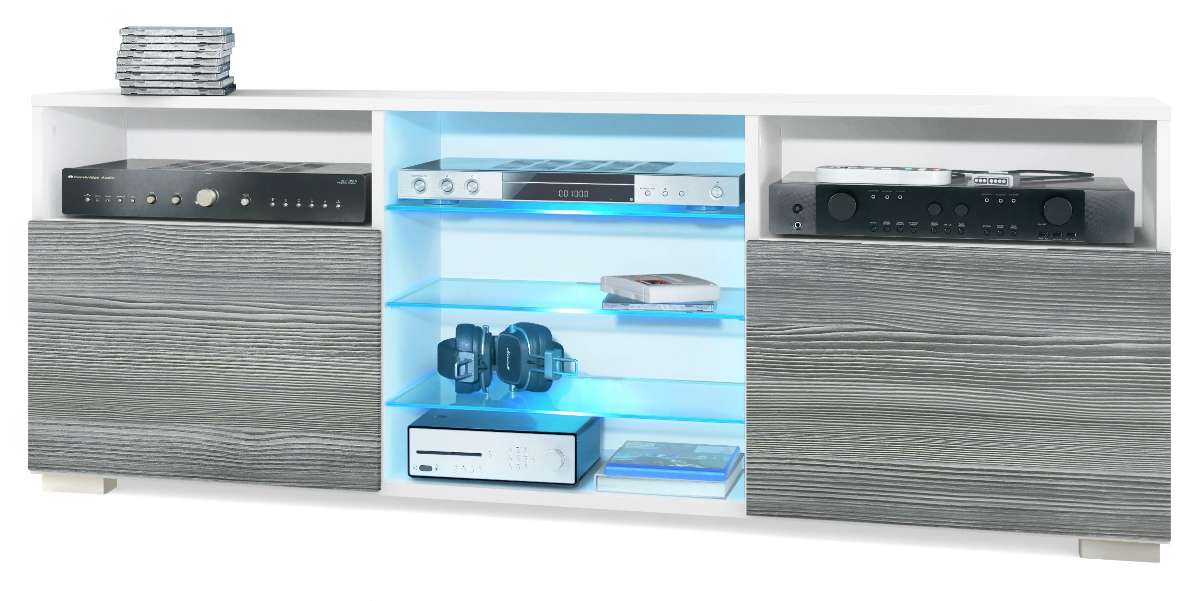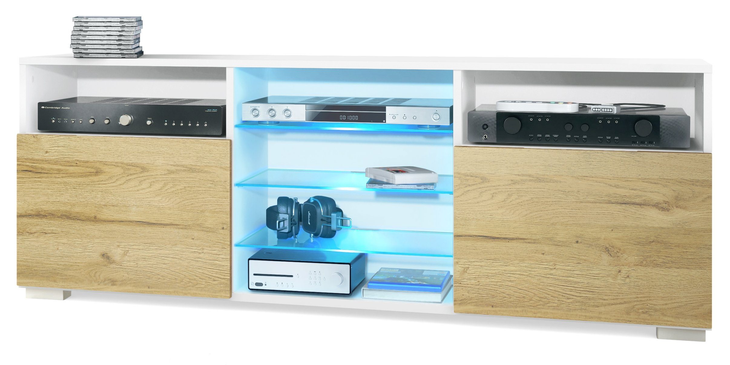 Hochwertig foliierte MDF-Fronten und ein Korpus aus Spanplatten mit Melaminbeschichtung gewährleisten eine langlebige und pflegeleichte Qualität. Das TV-Board ist leicht, stabil und bietet Ihnen somit ein Möbelstück, das sowohl funktional als auch robust ist – Verarbeitung Made in Germany.