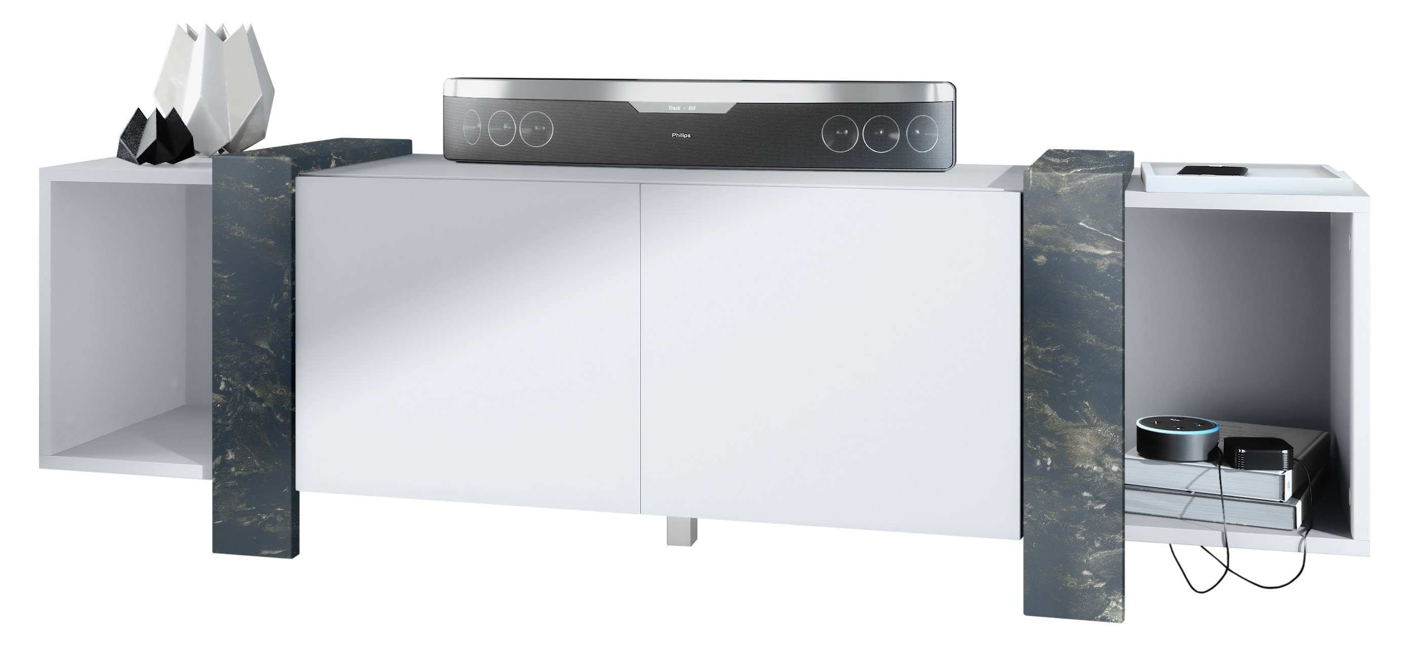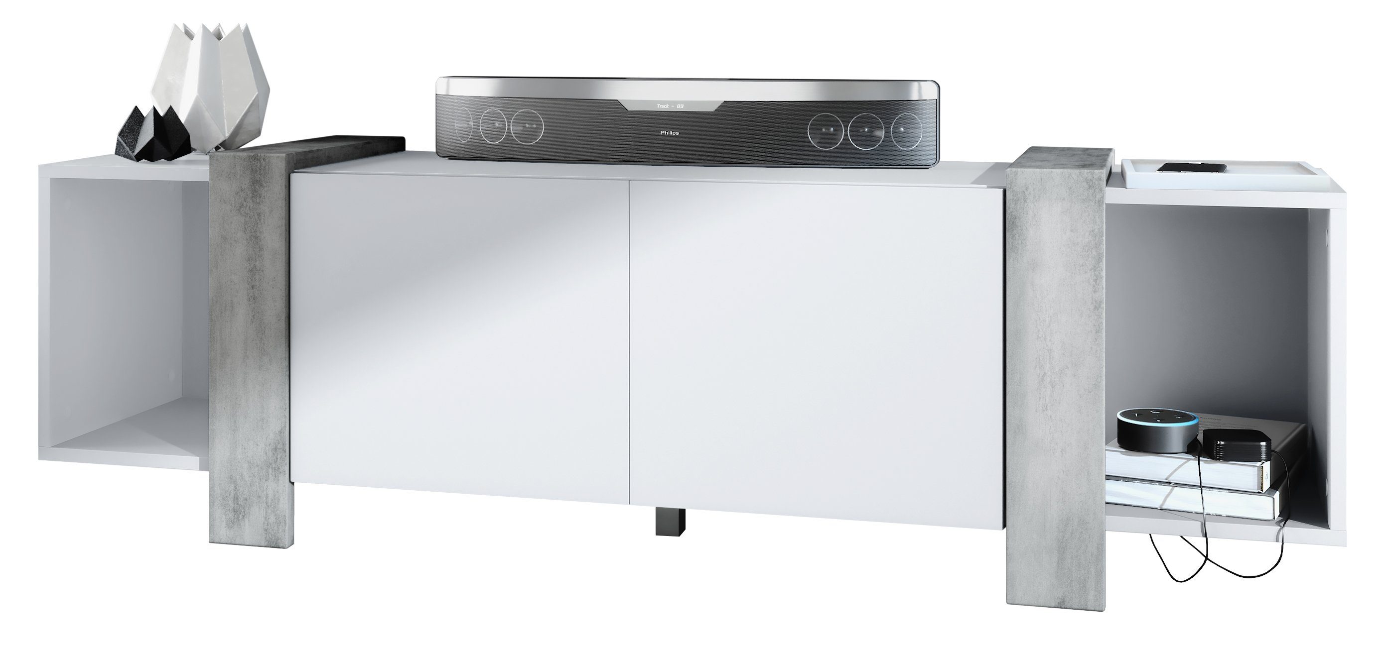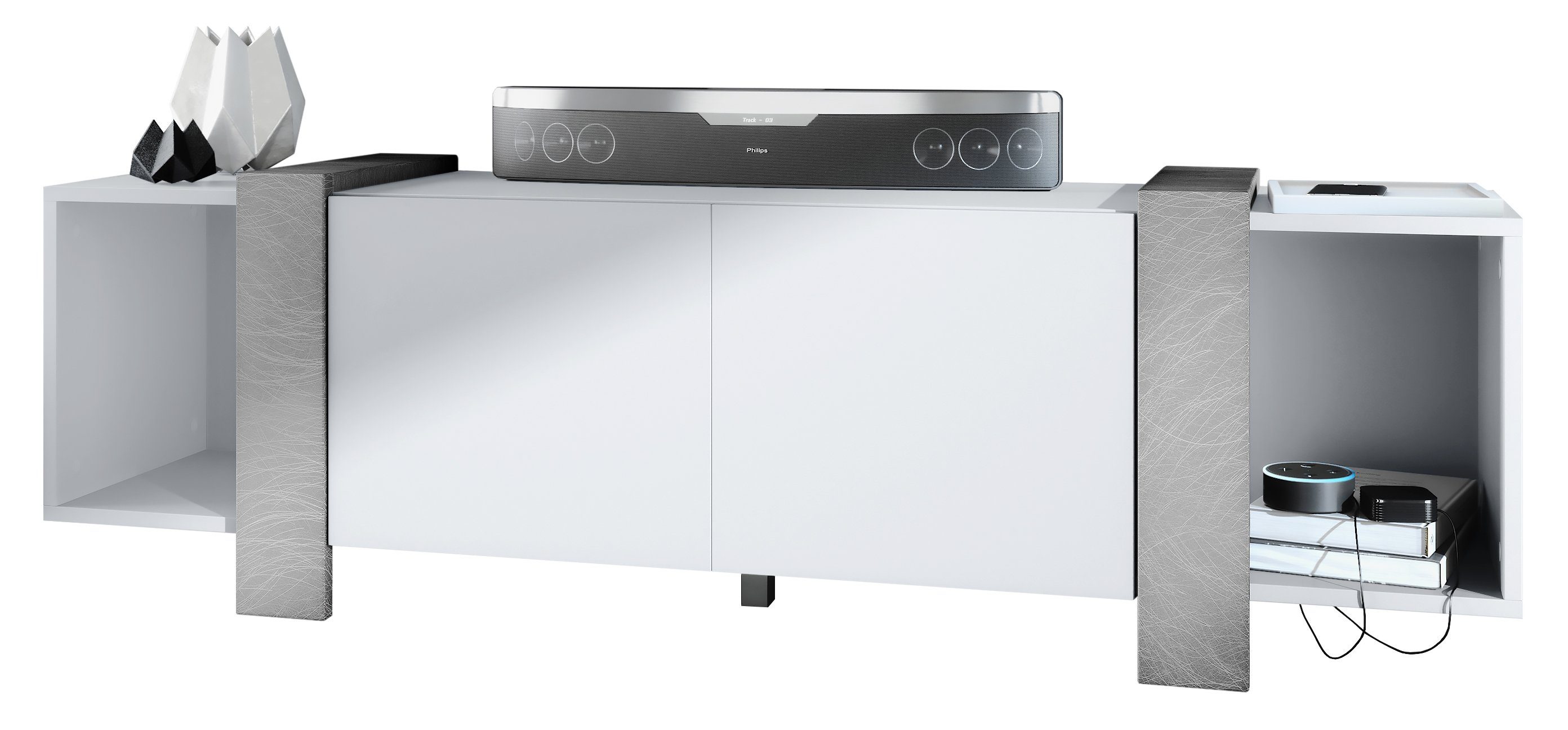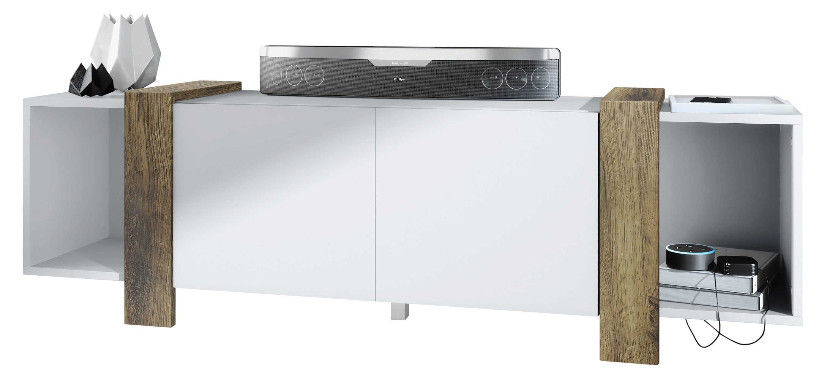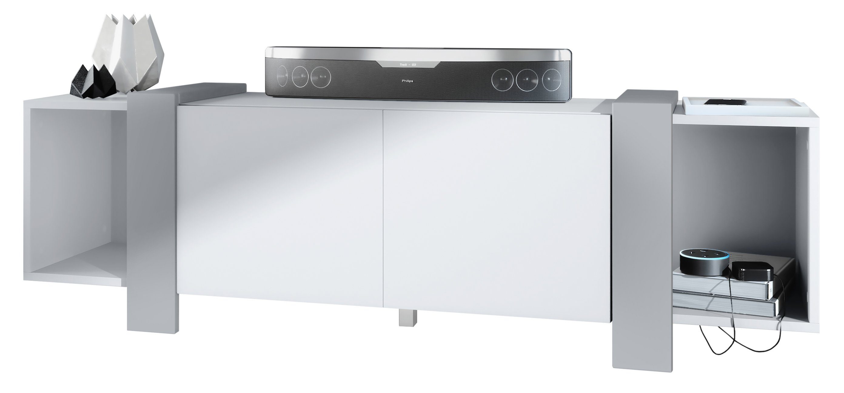 Das Mediamöbel hat insgesamt 4 Fächer: Zwei davon liegen hinter zwei Türen, welche sich mit dem innovativen Push-to-Open-System öffnen lassen, verborgen. Die anderen 2 Fächer sind offen und werden durch die farbigen Blenden von den mittleren Türen abgetrennt. Da die äußeren zwei Fächer offen sind, bieten sie sich hervorragend für Objekte an, die man präsentieren möchte, oder die man gerne einfach in unmittelbarer Griffreichweite hat. So kann man den zusätzlichen Stauraum z.B. nutzen, um Fernsehzeitungen, Blu-Rays oder Videospiele zu verstauen.