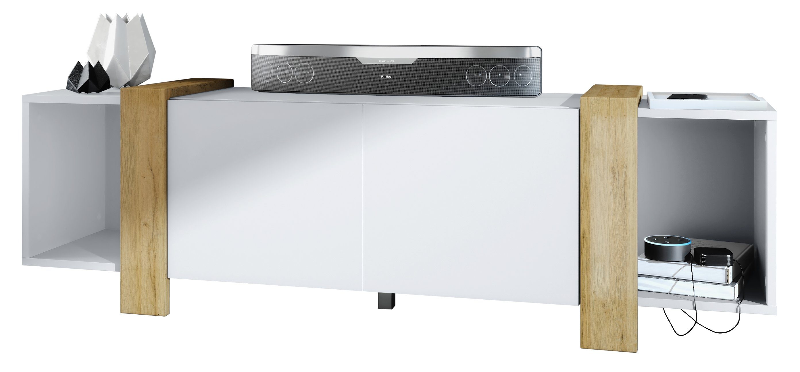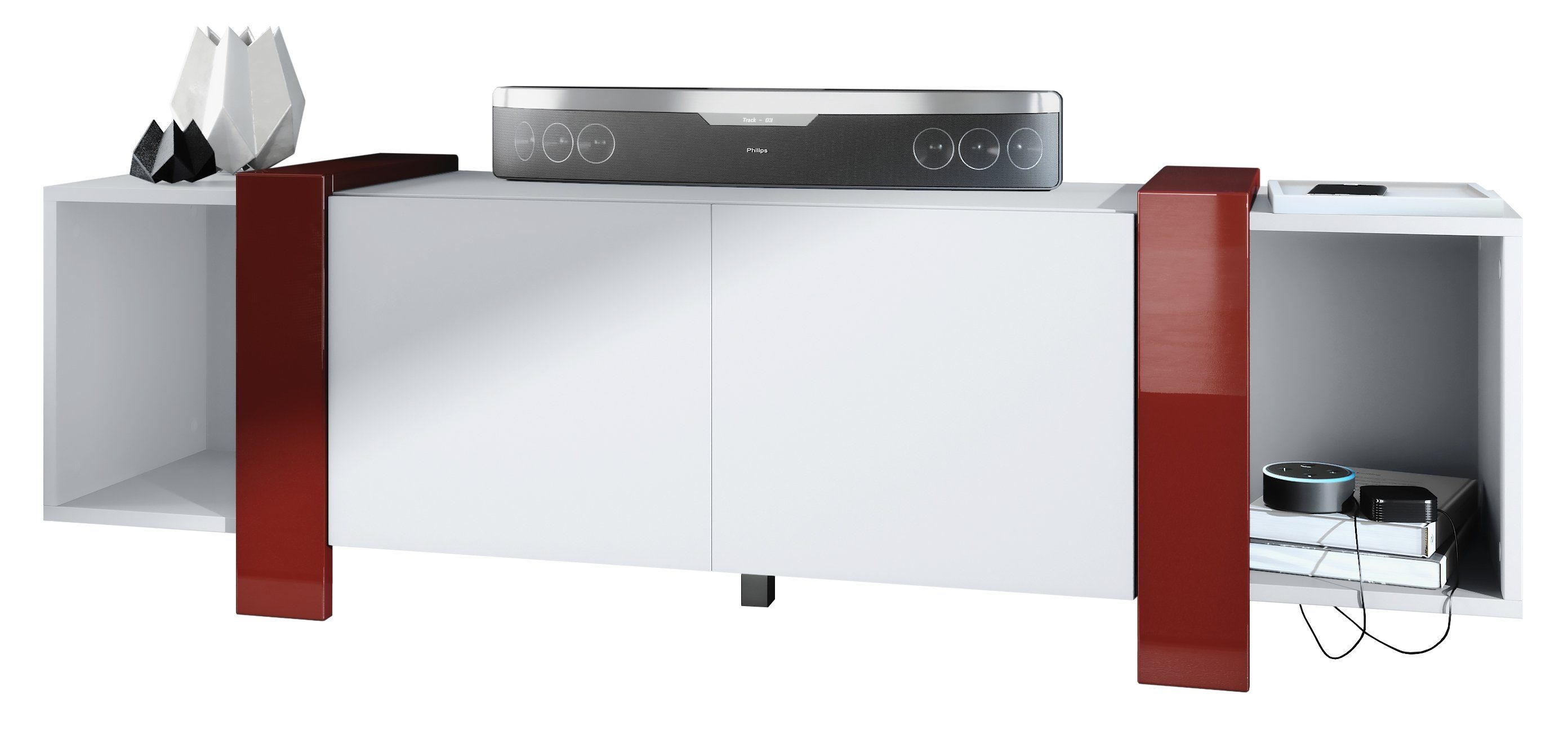 Der Fernsehtisch hat einen kastenförmigen Korpus, welcher mit zwei kreativen, farbigen Blenden verziert ist. Die Blenden verleihen dem TV-Board ein pfiffiges Gesamtbild, welches es von anderen Lowboards unterscheidet.