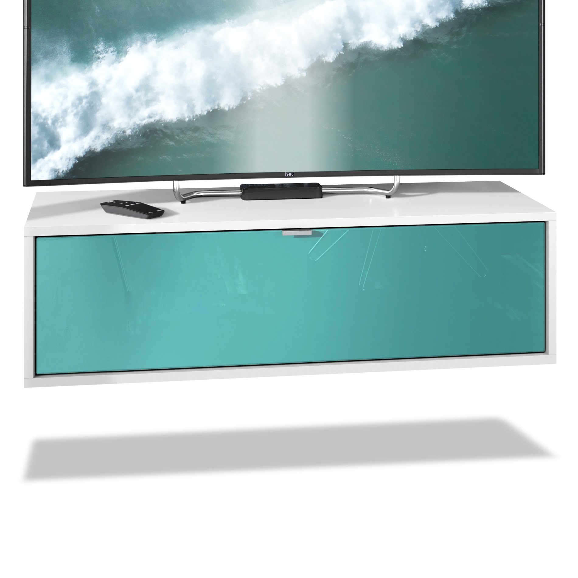 Der Korpus des TV Boards hat die Farbe Weiß matt. Um dem Möbelstück einen futuristischen Stil zu verleihen, wird es hängend an der Wand befestigt. So kann man es nahezu überall im Haus anbringen. Dies ist gerade dann praktisch, wenn auf dem Boden nicht genügend Platz für stehende Möbel verfügbar ist.