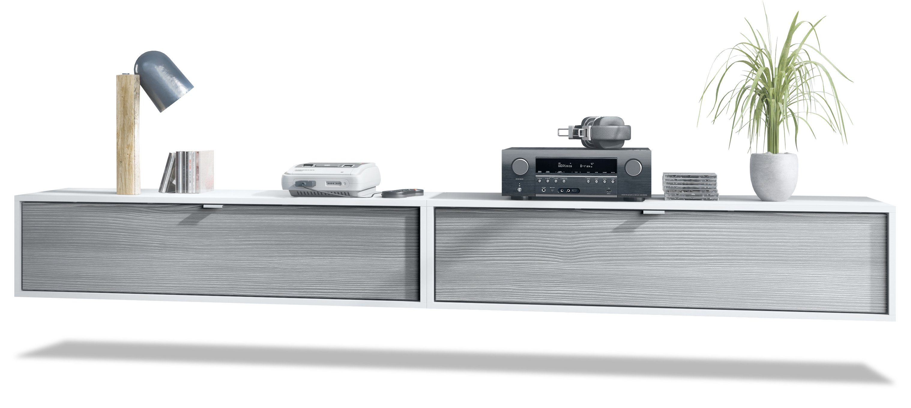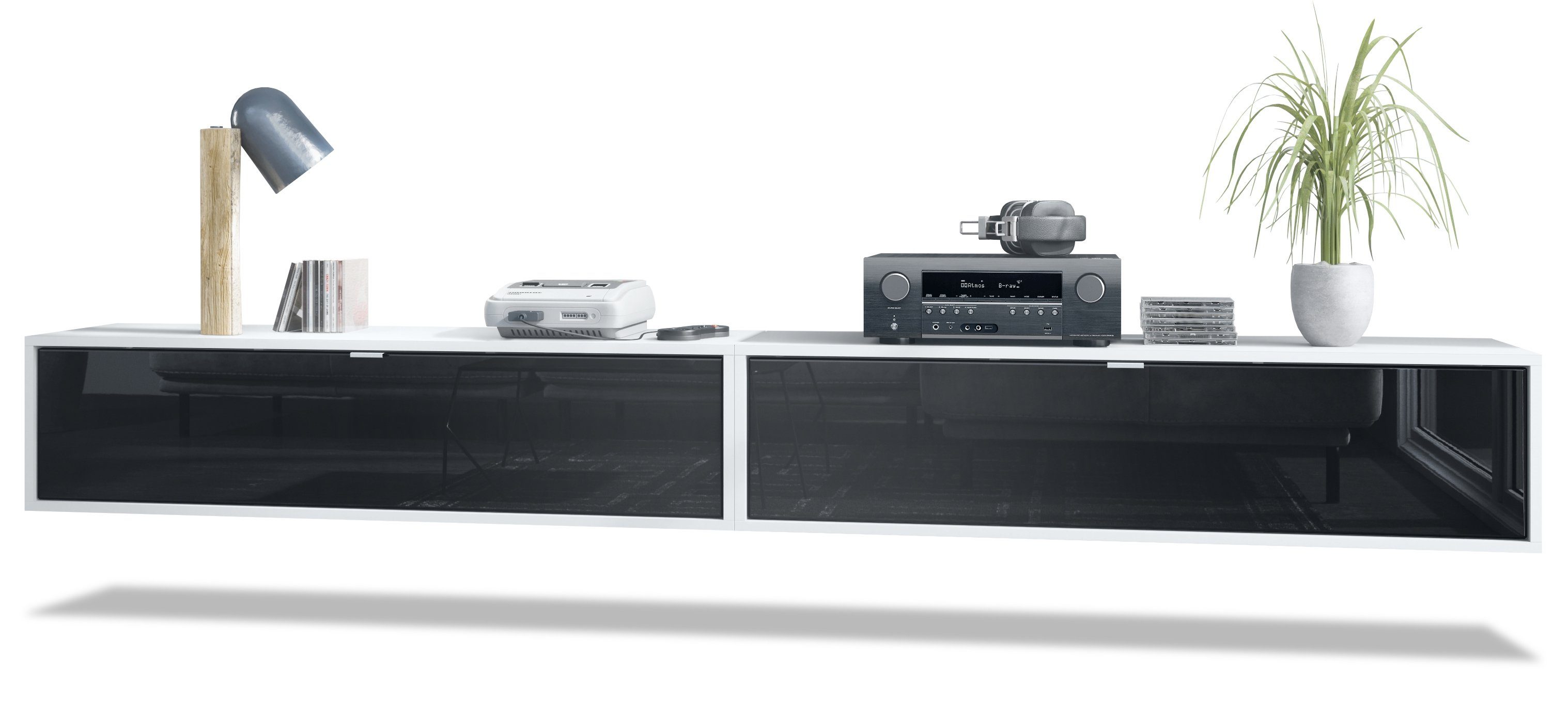Der Korpus des TV Boards hat die Farbe Weiß matt. Um dem Möbelstück einen futuristischen Stil zu verleihen, wird es hängend an der Wand befestigt. So kann man es nahezu überall im Haus anbringen. Dies ist gerade dann praktisch, wenn auf dem Boden nicht genügend Platz für stehende Möbel verfügbar ist.