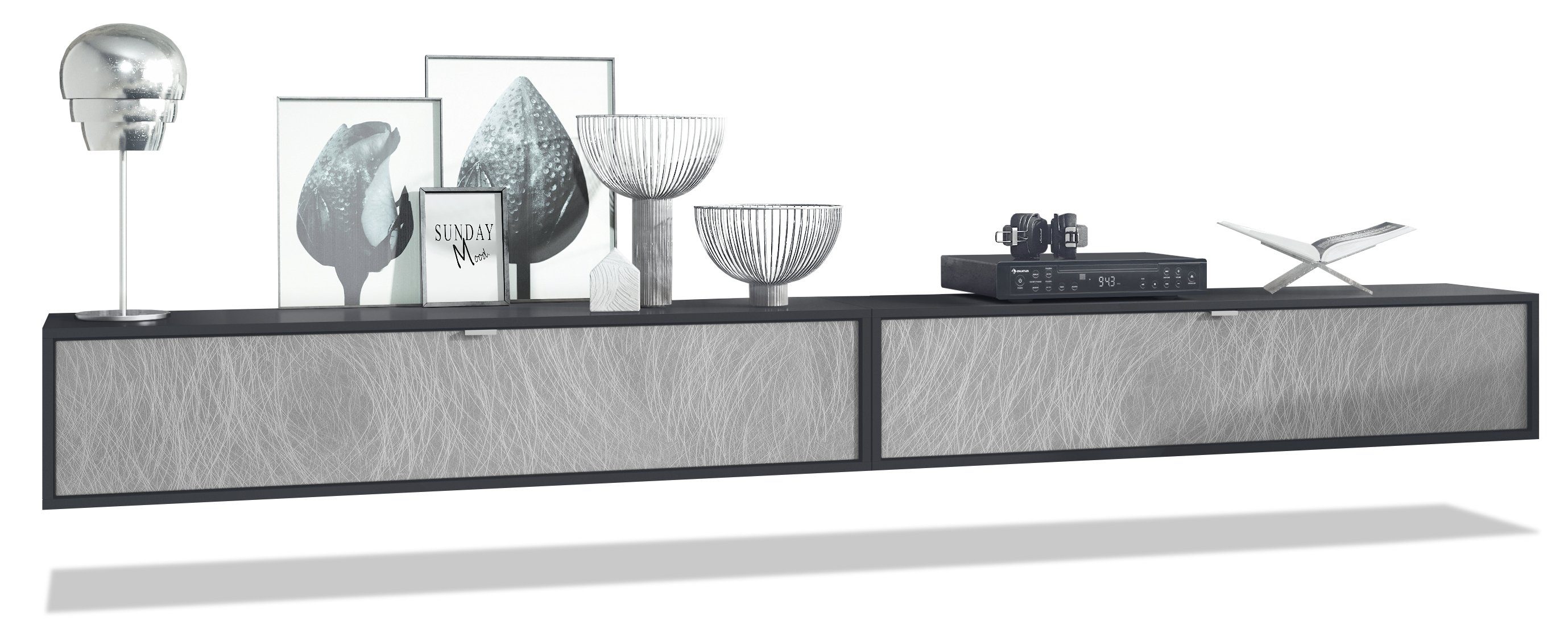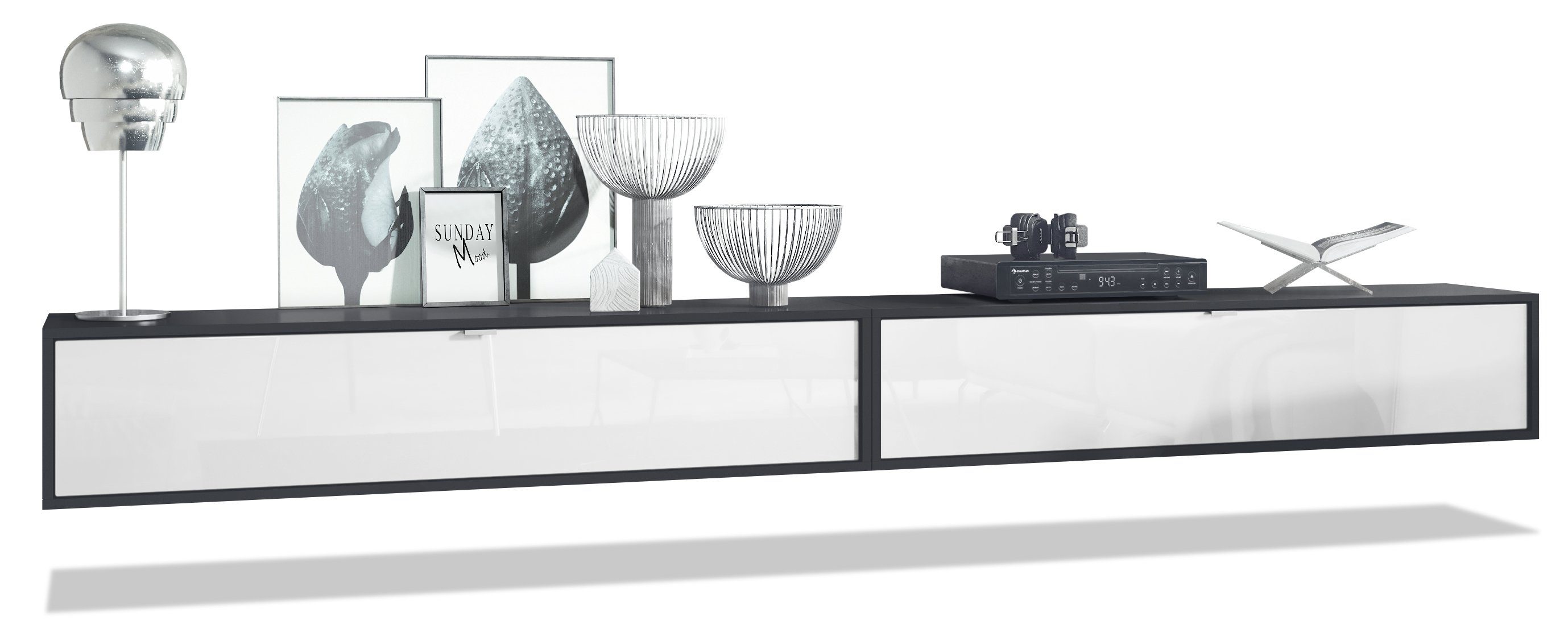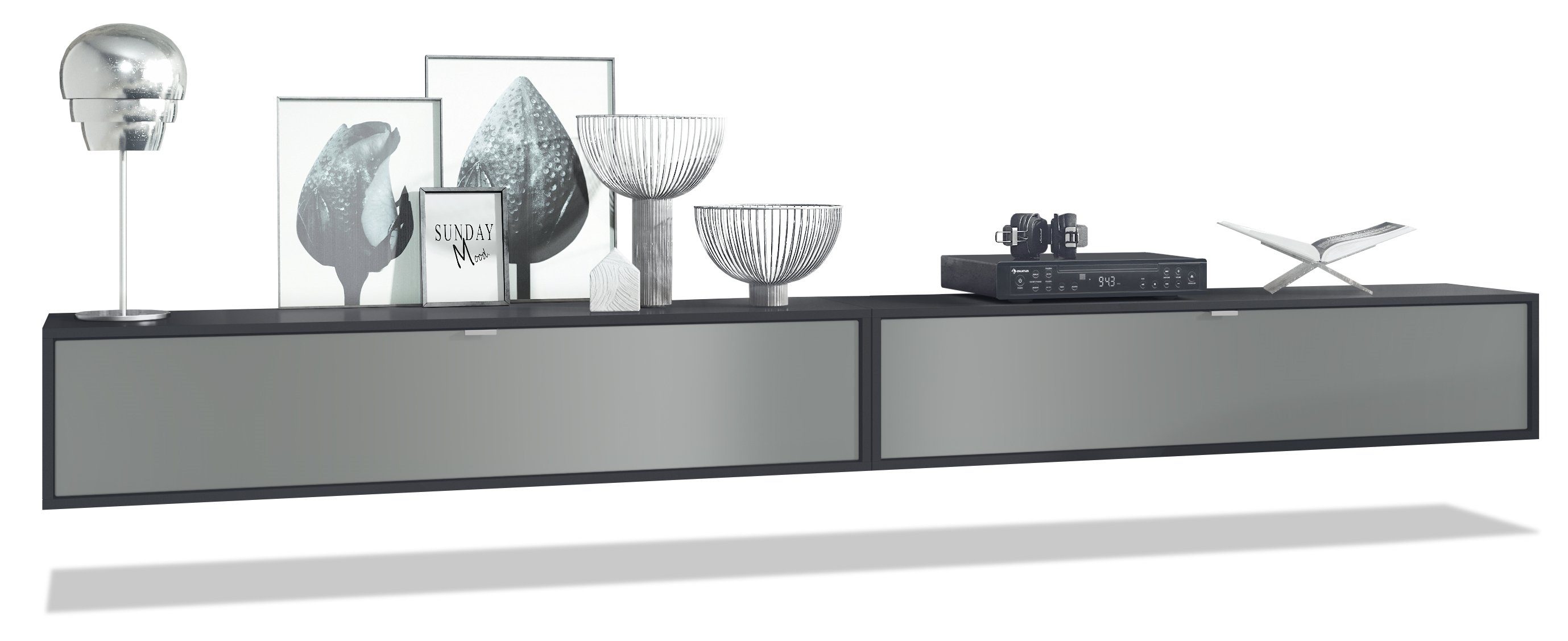 Der Korpus des TV Boards hat die Farbe Schwarz matt. Um dem Möbelstück einen futuristischen Stil zu verleihen, wird es hängend an der Wand befestigt. So kann man es nahezu überall im Haus anbringen. Dies ist gerade dann praktisch, wenn auf dem Boden nicht genügend Platz für stehende Möbel verfügbar ist.