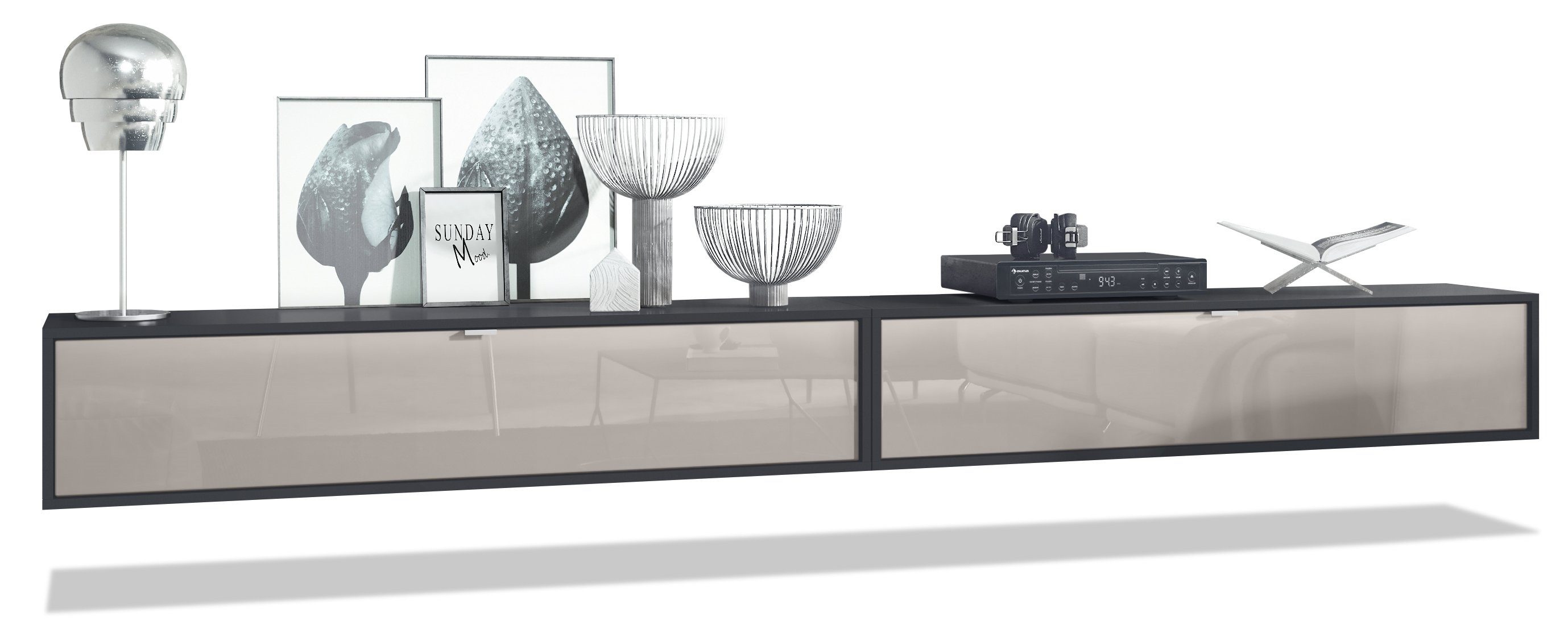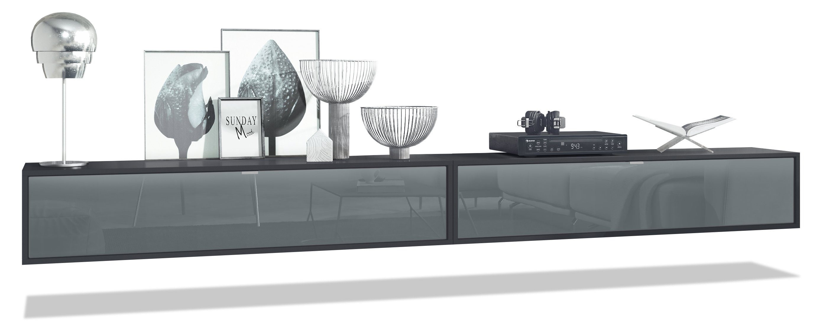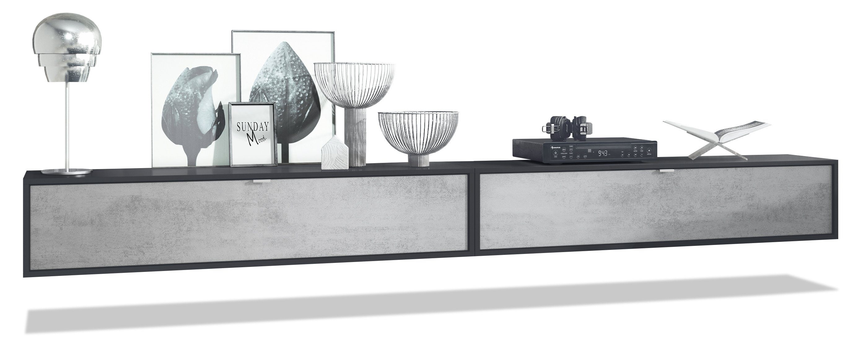 Der Korpus des TV Boards hat die Farbe Schwarz matt. Um dem Möbelstück einen futuristischen Stil zu verleihen, wird es hängend an der Wand befestigt. So kann man es nahezu überall im Haus anbringen. Dies ist gerade dann praktisch, wenn auf dem Boden nicht genügend Platz für stehende Möbel verfügbar ist.
