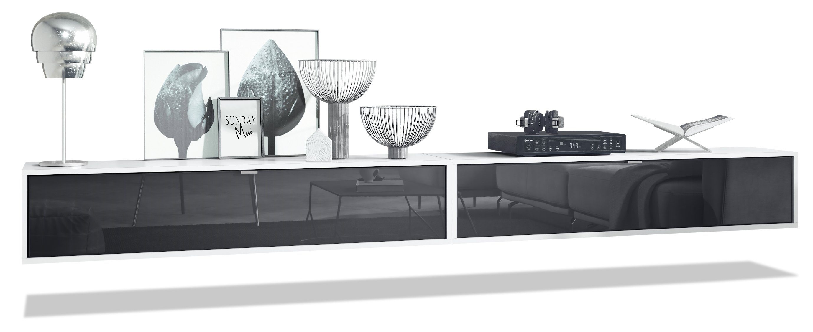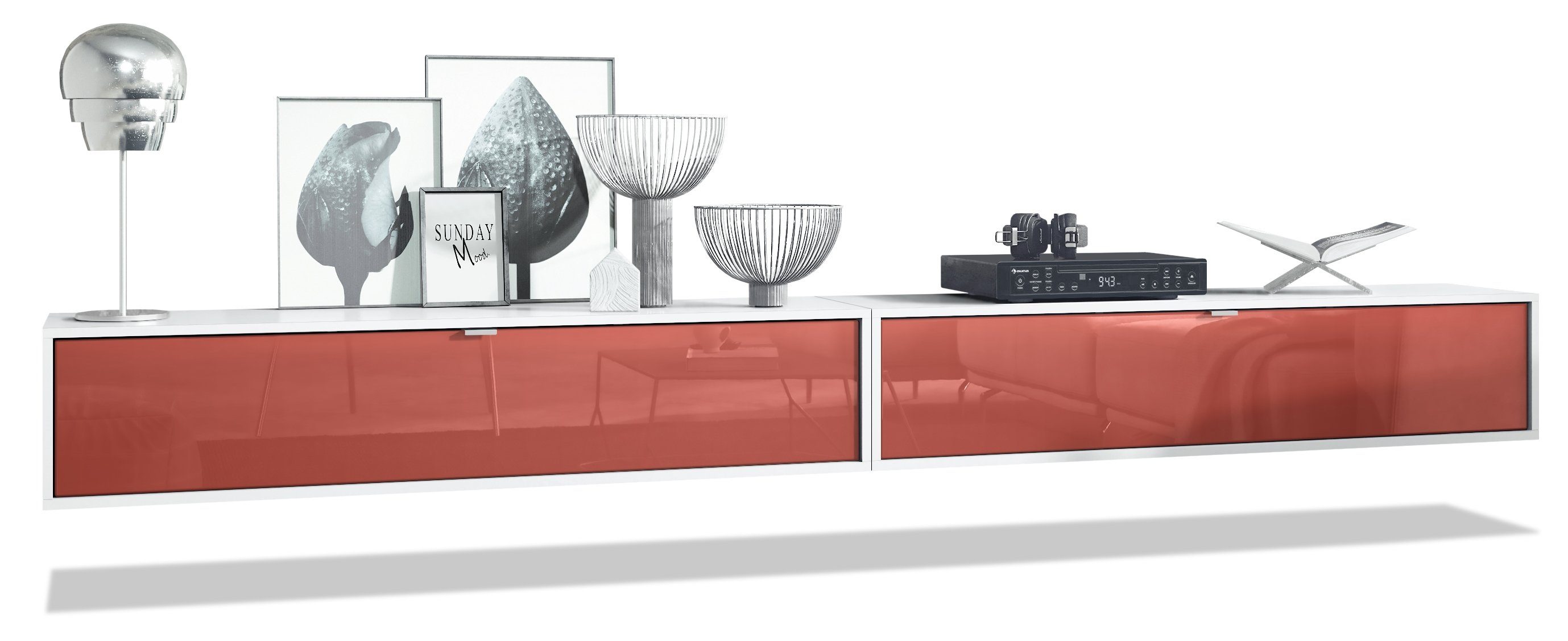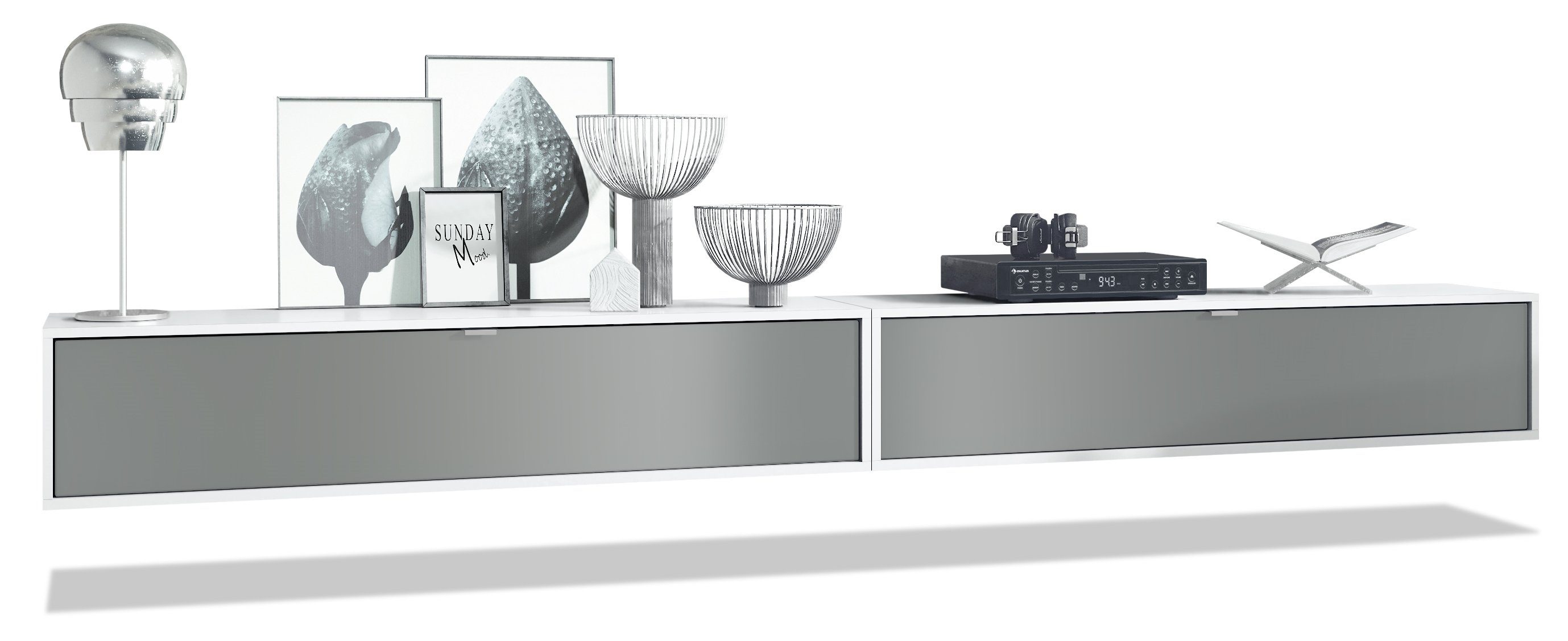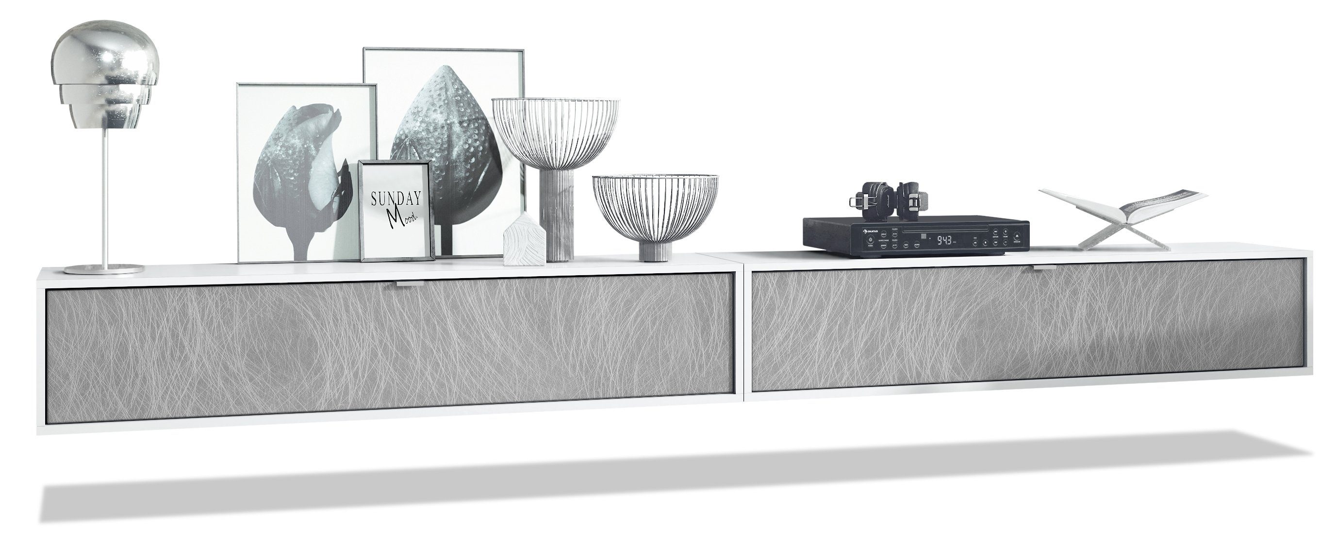 Der Korpus des TV Boards hat die Farbe Weiß matt. Um dem Möbelstück einen futuristischen Stil zu verleihen, wird es hängend an der Wand befestigt. So kann man es nahezu überall im Haus anbringen. Dies ist gerade dann praktisch, wenn auf dem Boden nicht genügend Platz für stehende Möbel verfügbar ist.