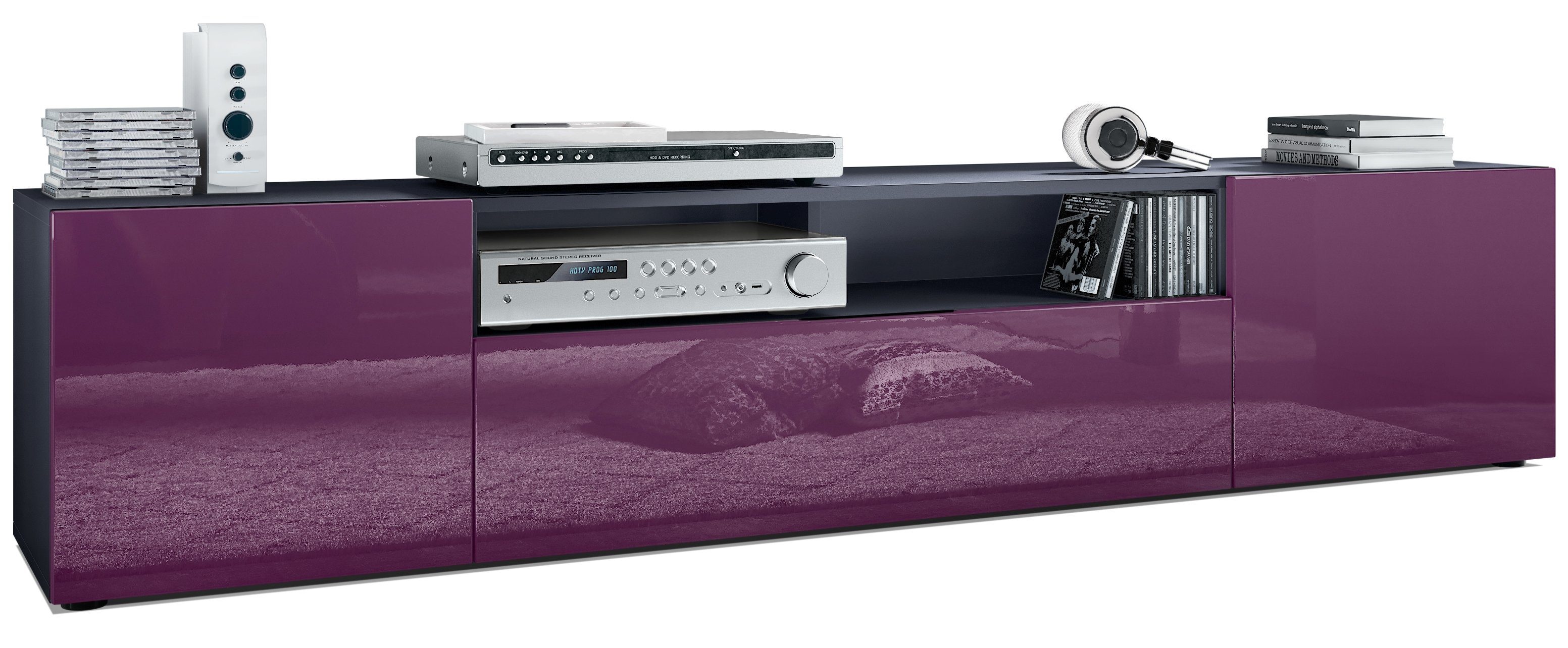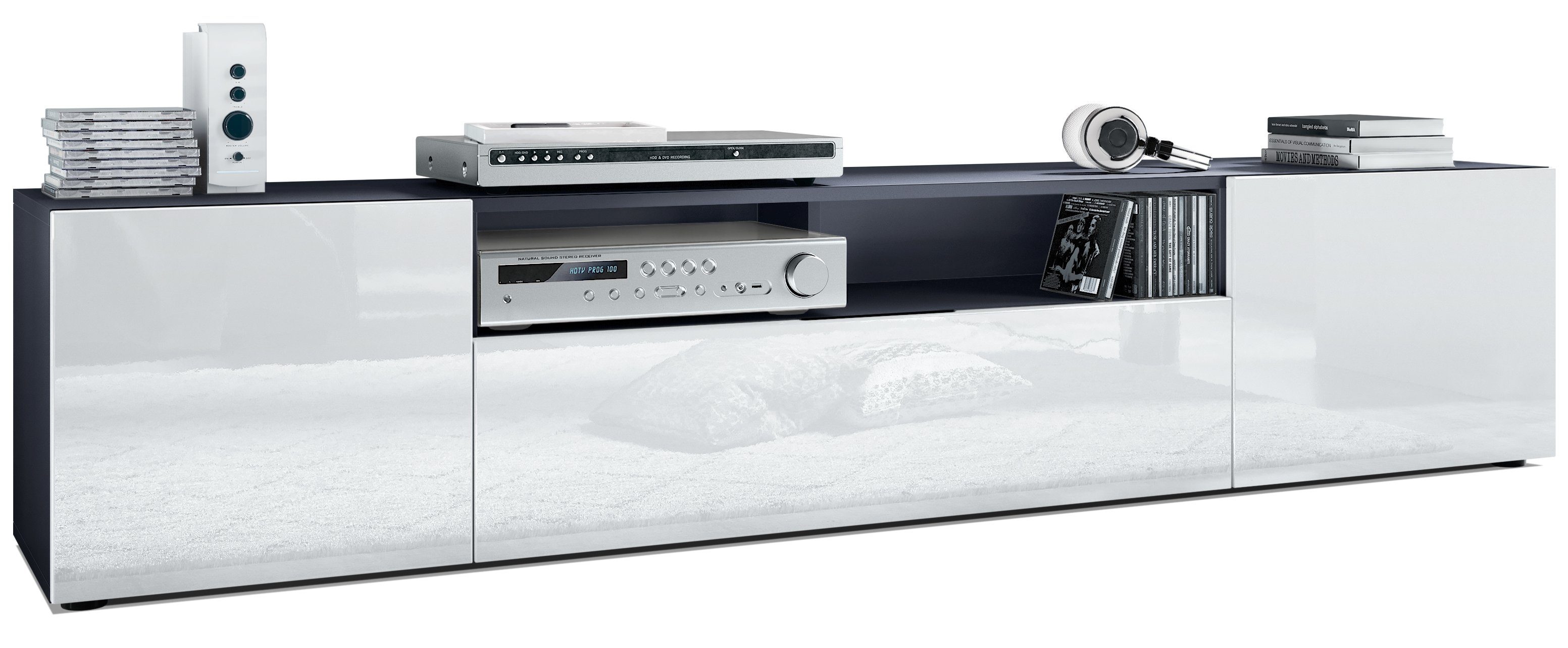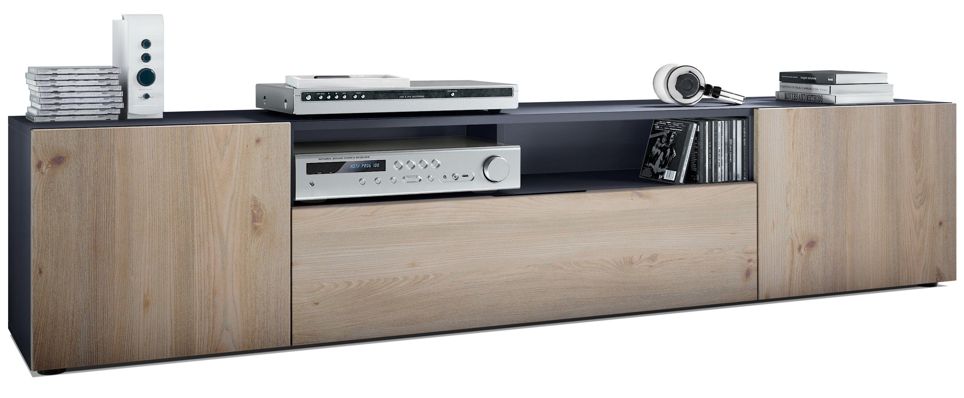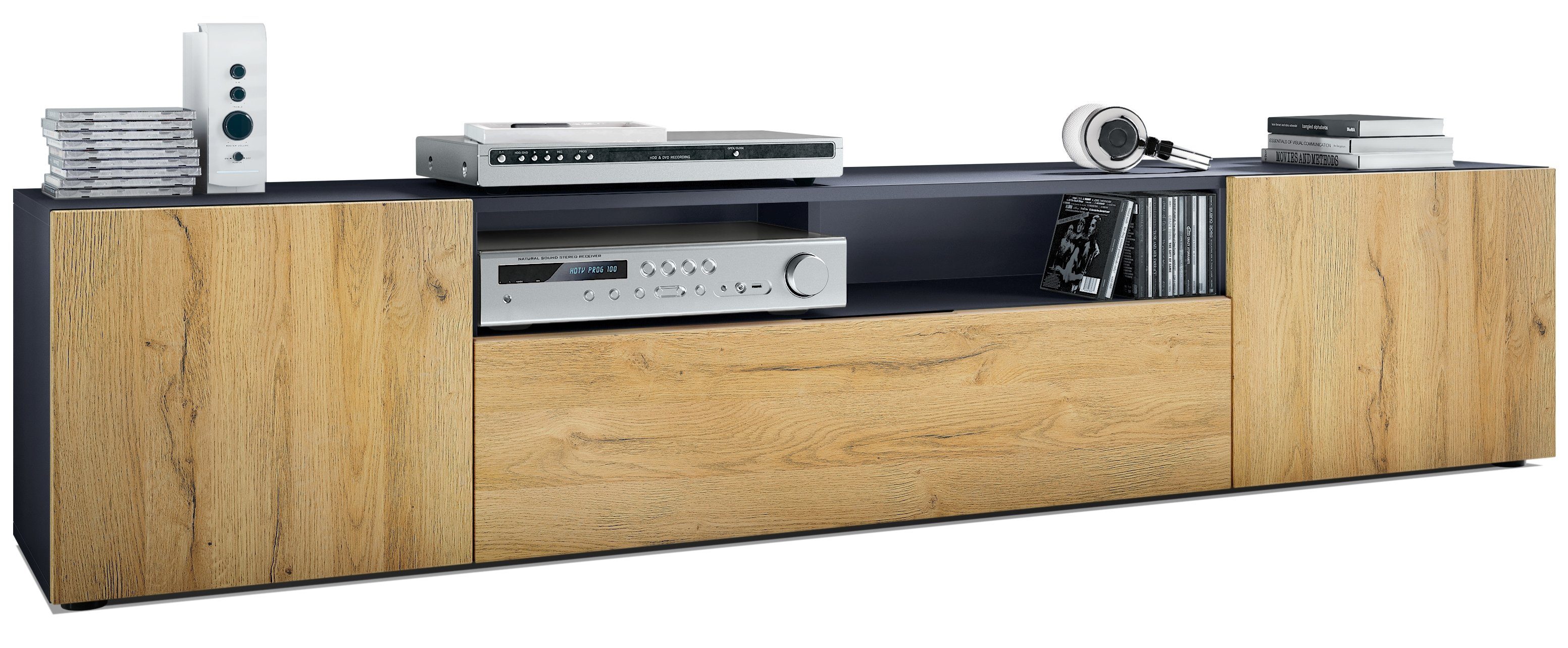 Der Korpus des TV-Möbels hat die Farbe Anthrazit matt. Die Fronten stehen in diversen Farben zur Verfügung, darunter verschiedene Hochglanz- und Naturtöne sowie matte Farben. Unter den zahlreichen Farbvarianten ist für jede Wohnung und jeden Geschmack etwas dabei.