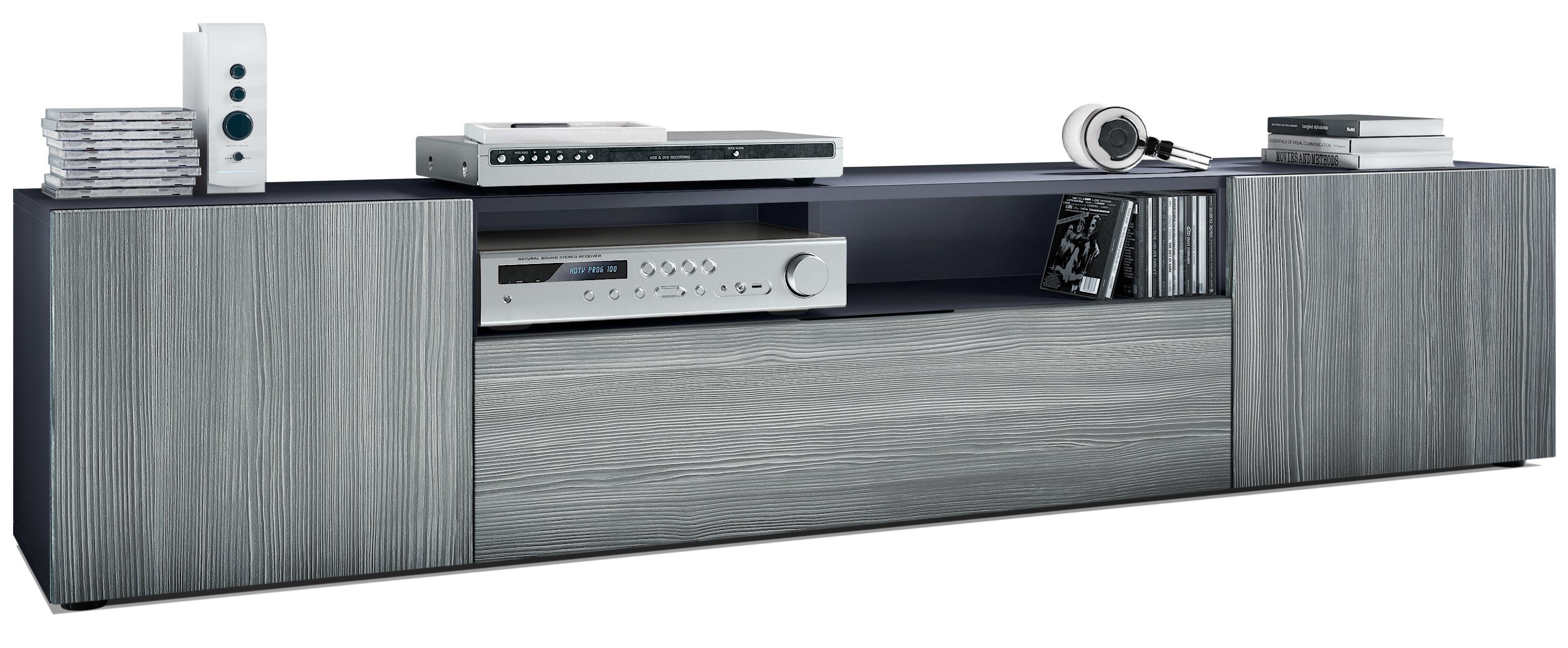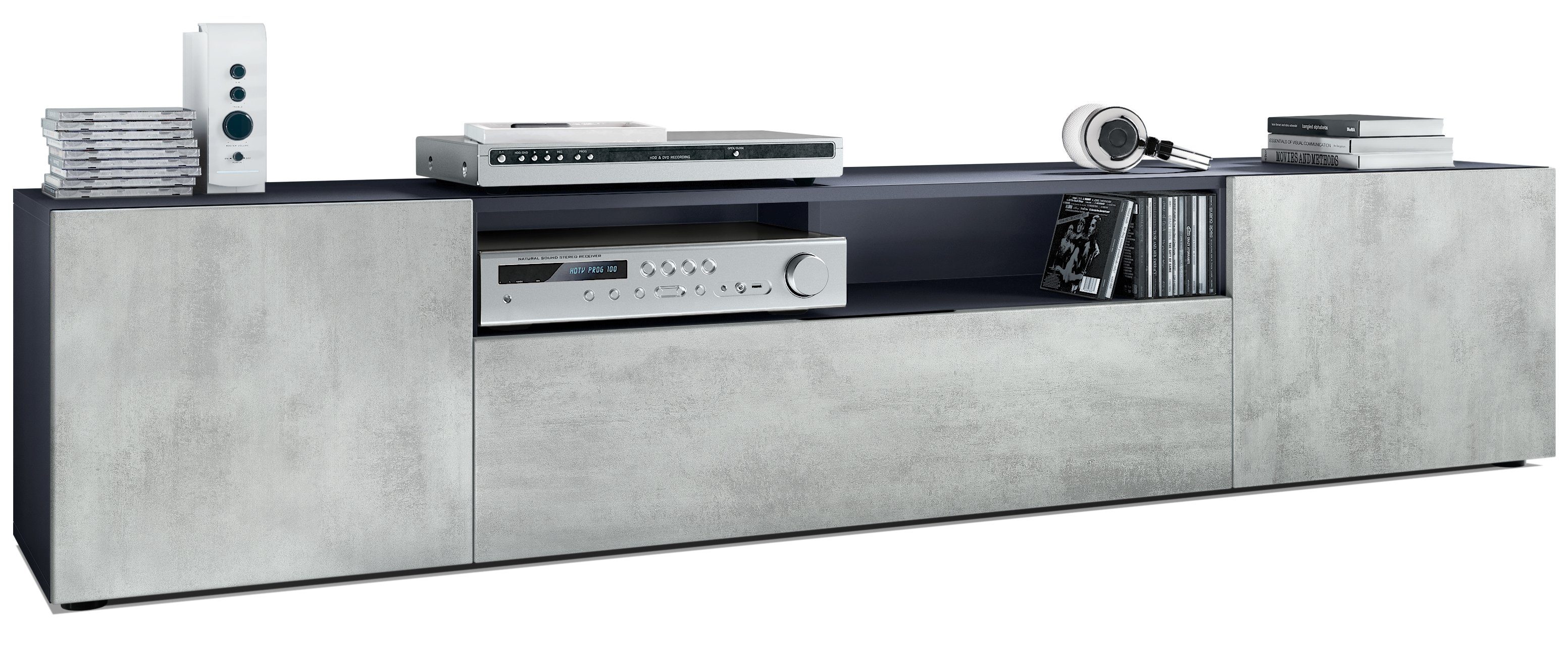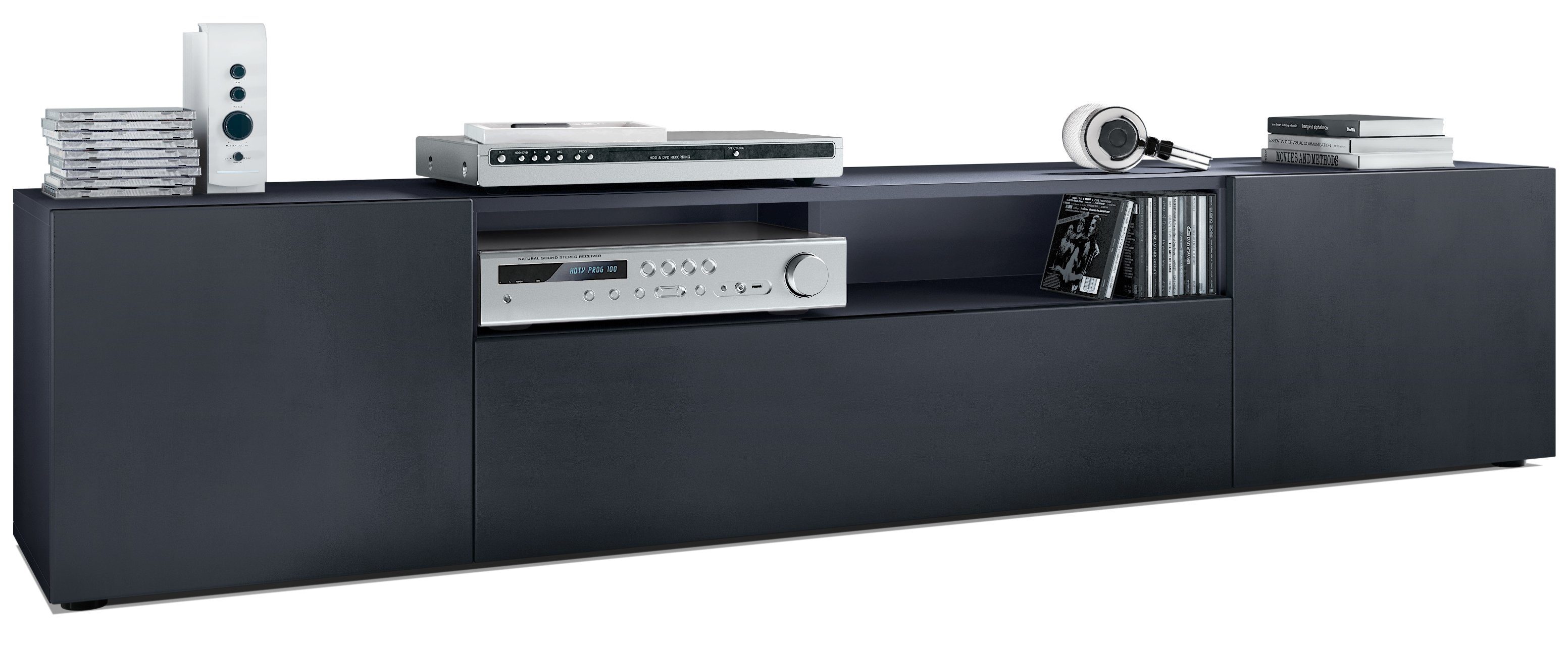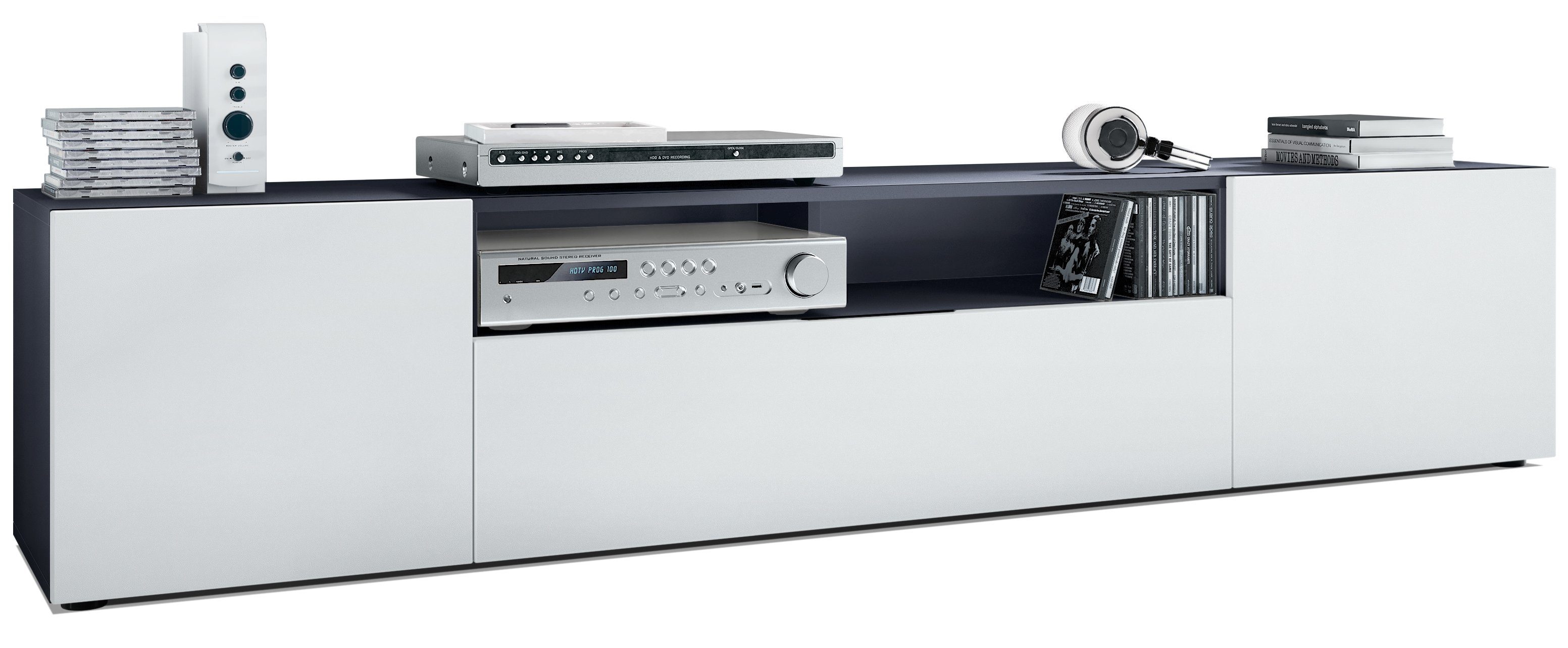 Der Korpus des TV-Möbels hat die Farbe Anthrazit matt. Die Fronten stehen in diversen Farben zur Verfügung, darunter verschiedene Hochglanz- und Naturtöne sowie matte Farben. Unter den zahlreichen Farbvarianten ist für jede Wohnung und jeden Geschmack etwas dabei.