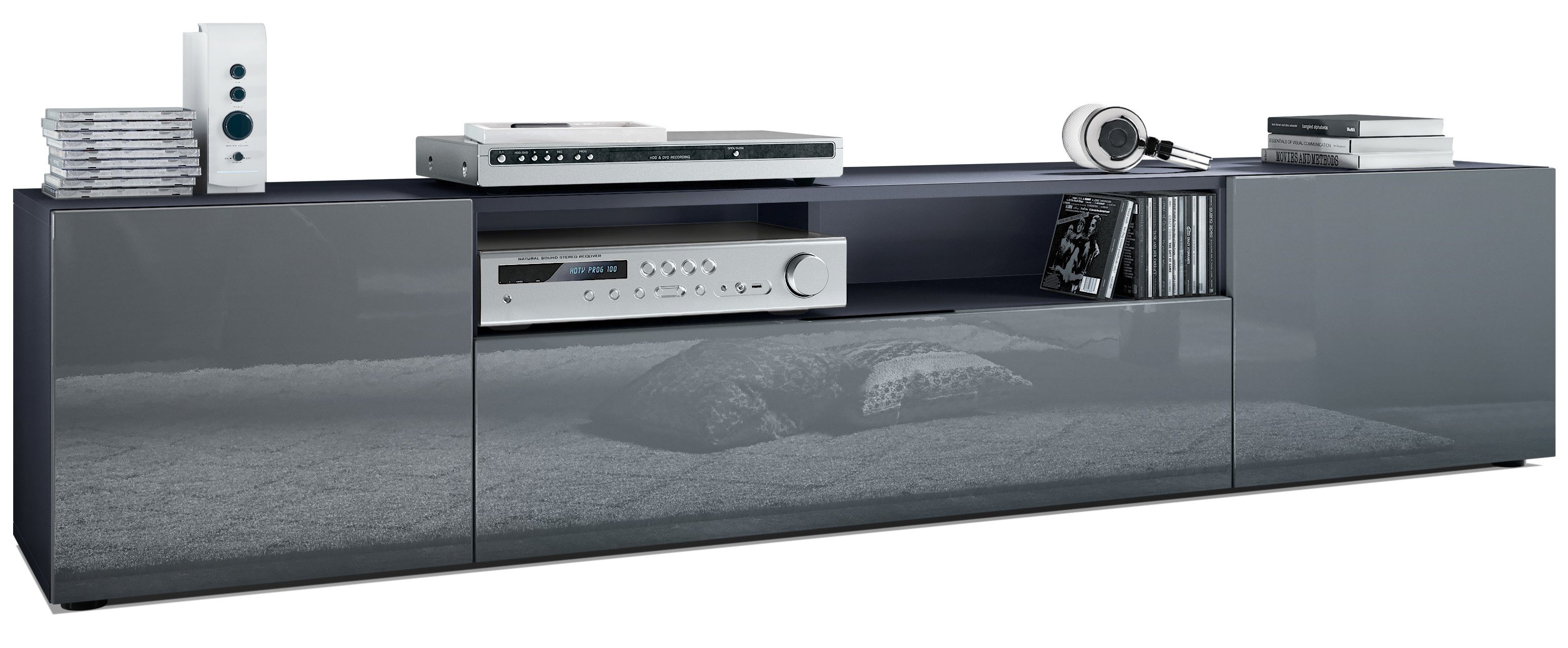 Der Korpus des TV-Möbels hat die Farbe Anthrazit matt. Die Fronten stehen in diversen Farben zur Verfügung, darunter verschiedene Hochglanz- und Naturtöne sowie matte Farben. Unter den zahlreichen Farbvarianten ist für jede Wohnung und jeden Geschmack etwas dabei.