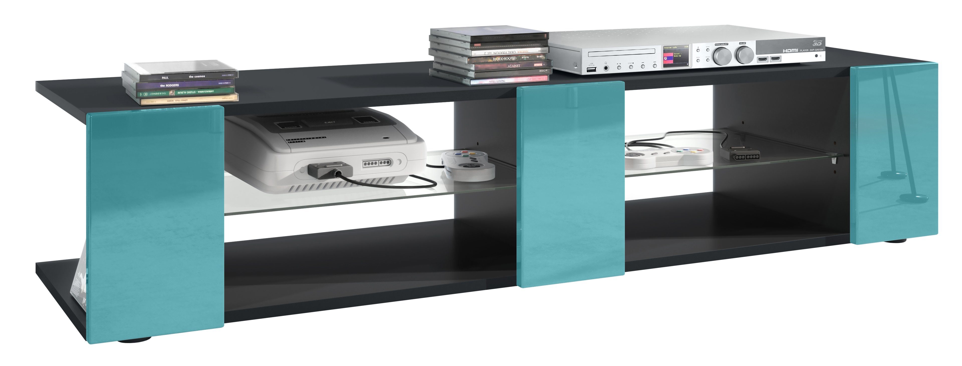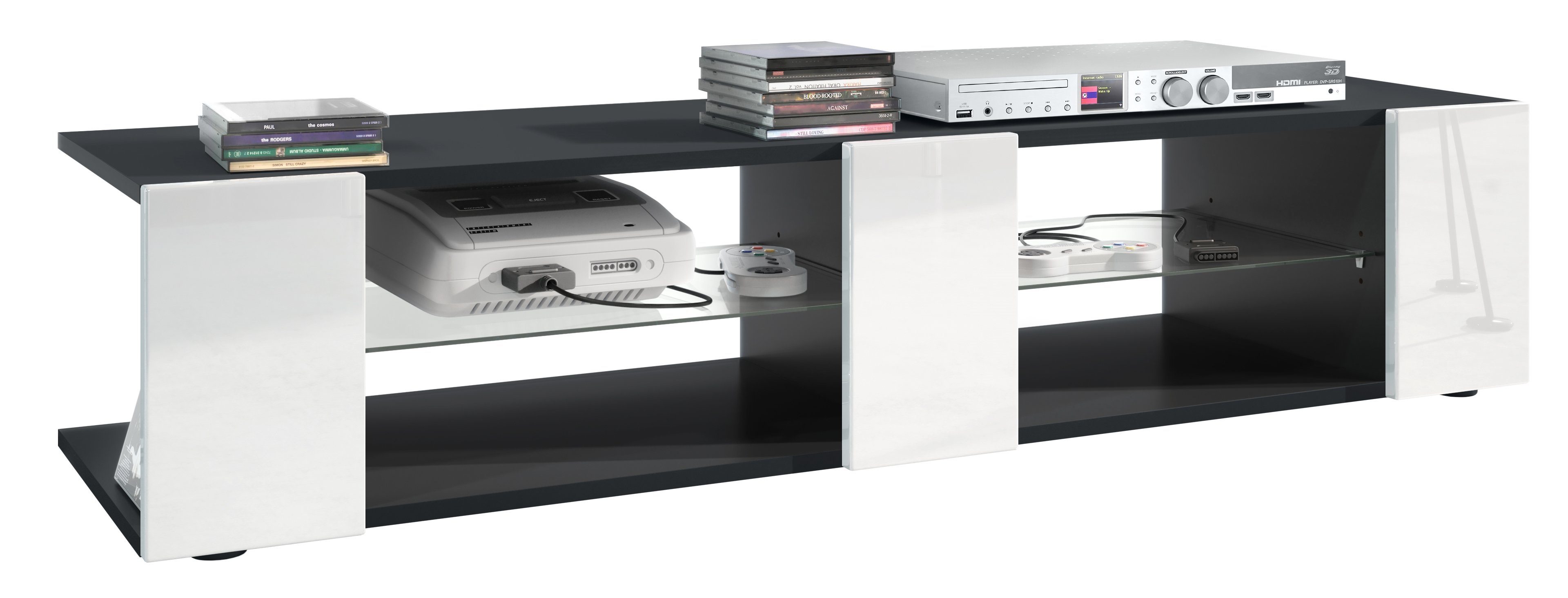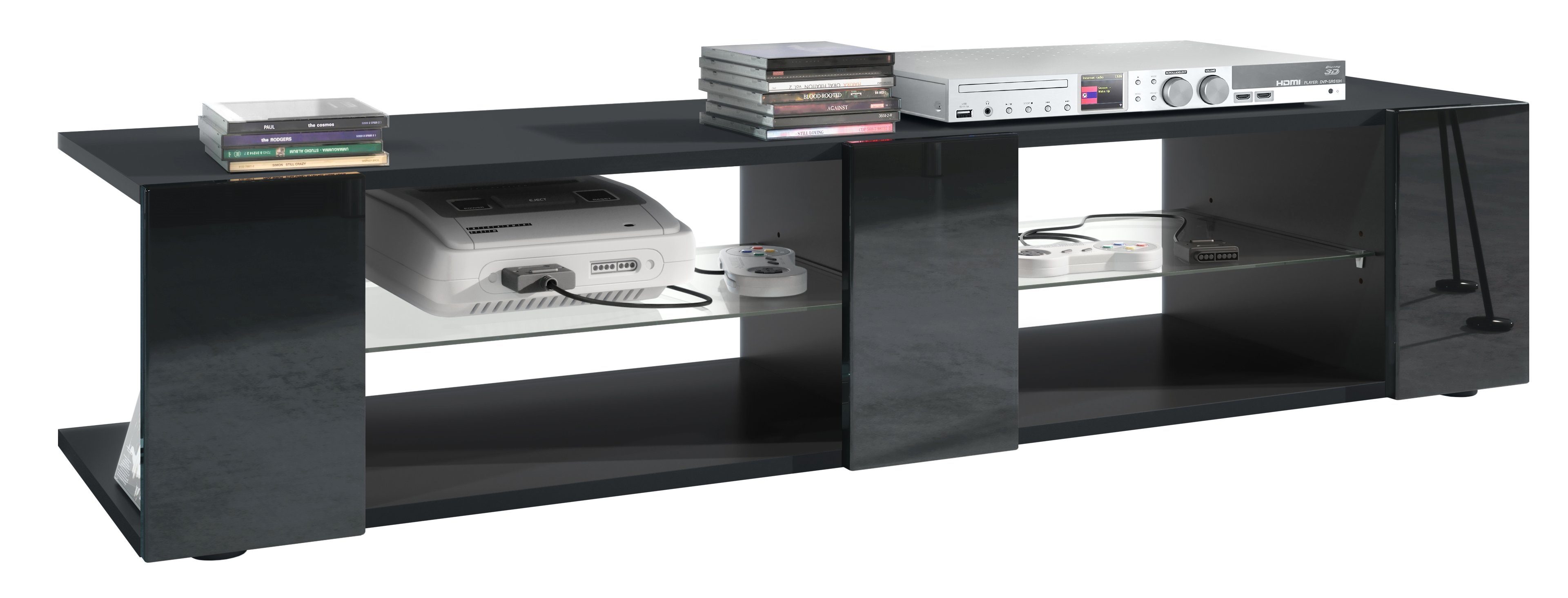 Das TV-Lowboard Movie V2 eignet sich als TV-Regal für jeden Wohnraum. Die geräumige TV-Kommode präsentiert sich als praktisches Möbelstück mit modernem Design, hergestellt in Deutschland. Das Fernsehboard ist mit vier offenen Fächern, davon zwei mit Glasboden und zwei seitlich versteckten Fächern, ausgerüstet. Der große Oberboden bietet auch für größere Fernseher ausreichend Platz. Die Glasböden des TV-Unterschranks können optional mit einer LED-Beleuchtung versehen werden. Damit alle Elektrogeräte problemlos angeschlossen werden können, wurde bei diesem Lowboard komplett auf eine Rückwand verzichtet.