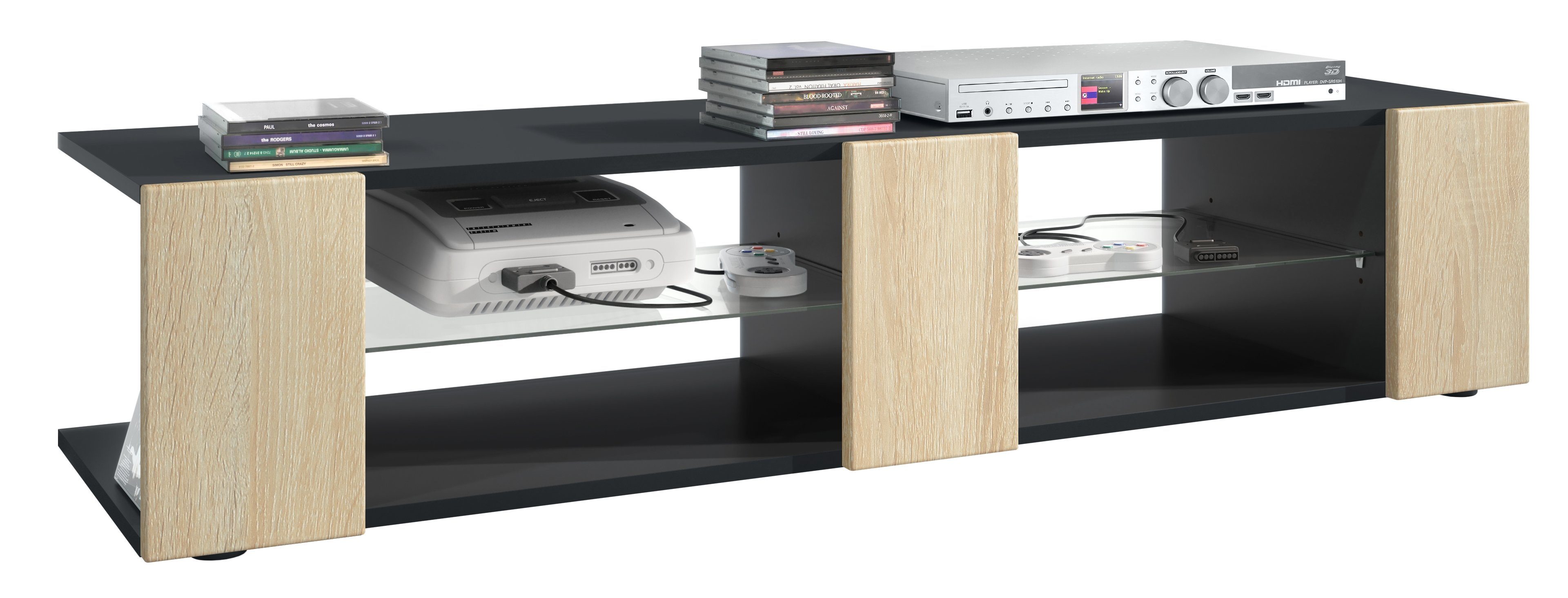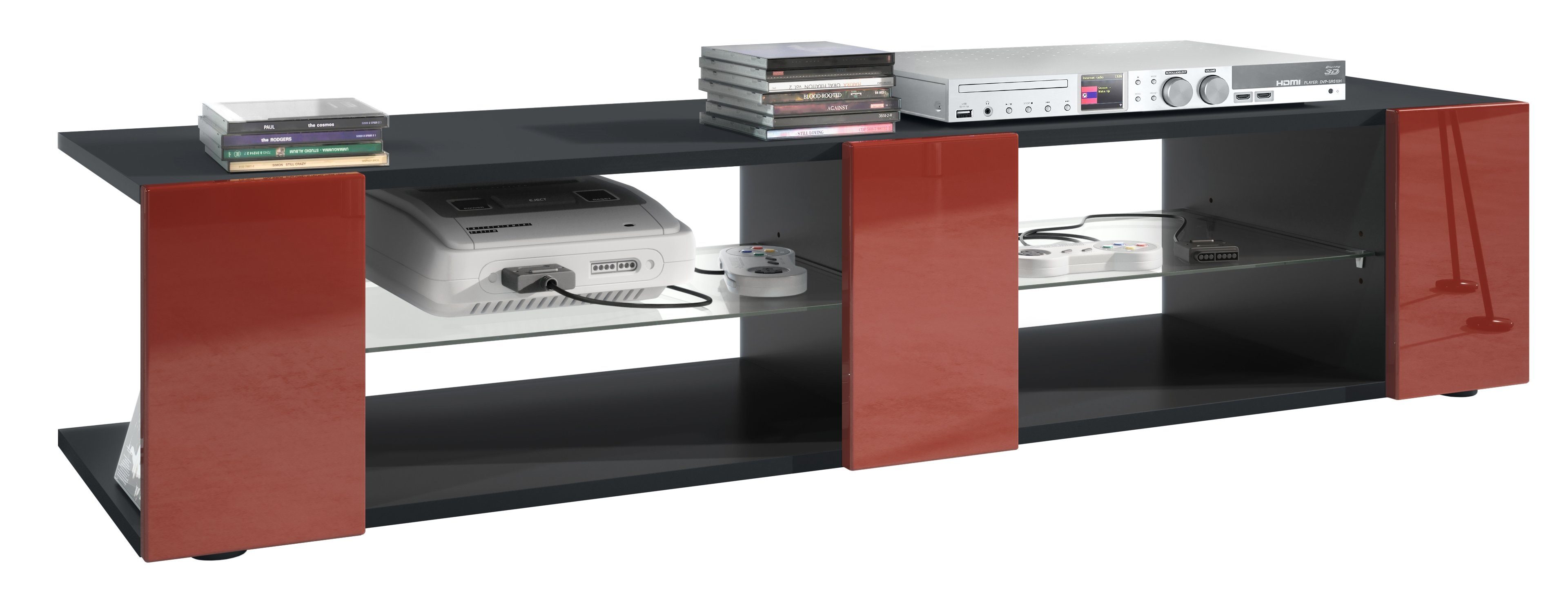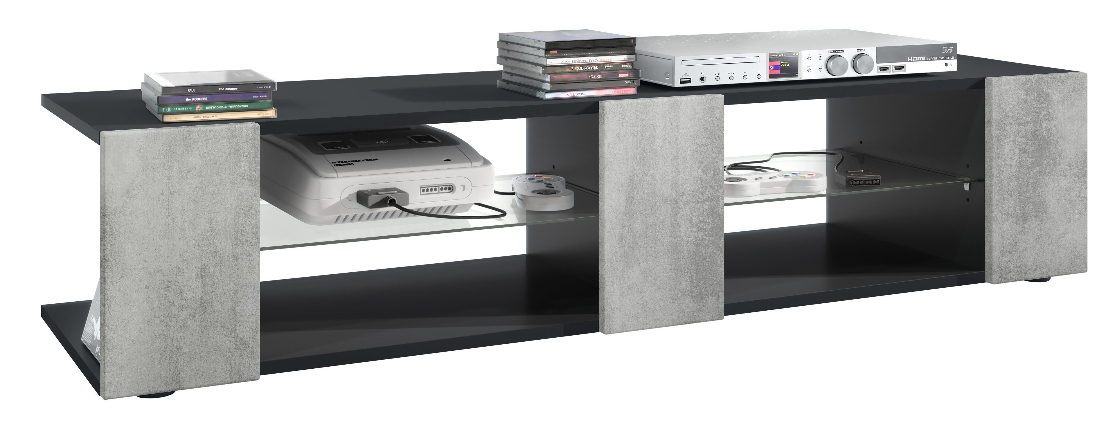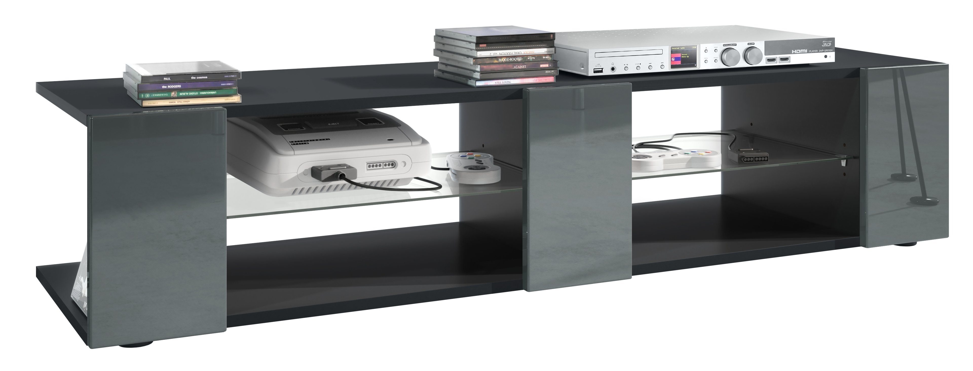 Das TV-Lowboard Movie V2 eignet sich als TV-Regal für jeden Wohnraum. Die geräumige TV-Kommode präsentiert sich als praktisches Möbelstück mit modernem Design, hergestellt in Deutschland. Das Fernsehboard ist mit vier offenen Fächern, davon zwei mit Glasboden und zwei seitlich versteckten Fächern, ausgerüstet. Der große Oberboden bietet auch für größere Fernseher ausreichend Platz. Die Glasböden des TV-Unterschranks können optional mit einer LED-Beleuchtung versehen werden. Damit alle Elektrogeräte problemlos angeschlossen werden können, wurde bei diesem Lowboard komplett auf eine Rückwand verzichtet.