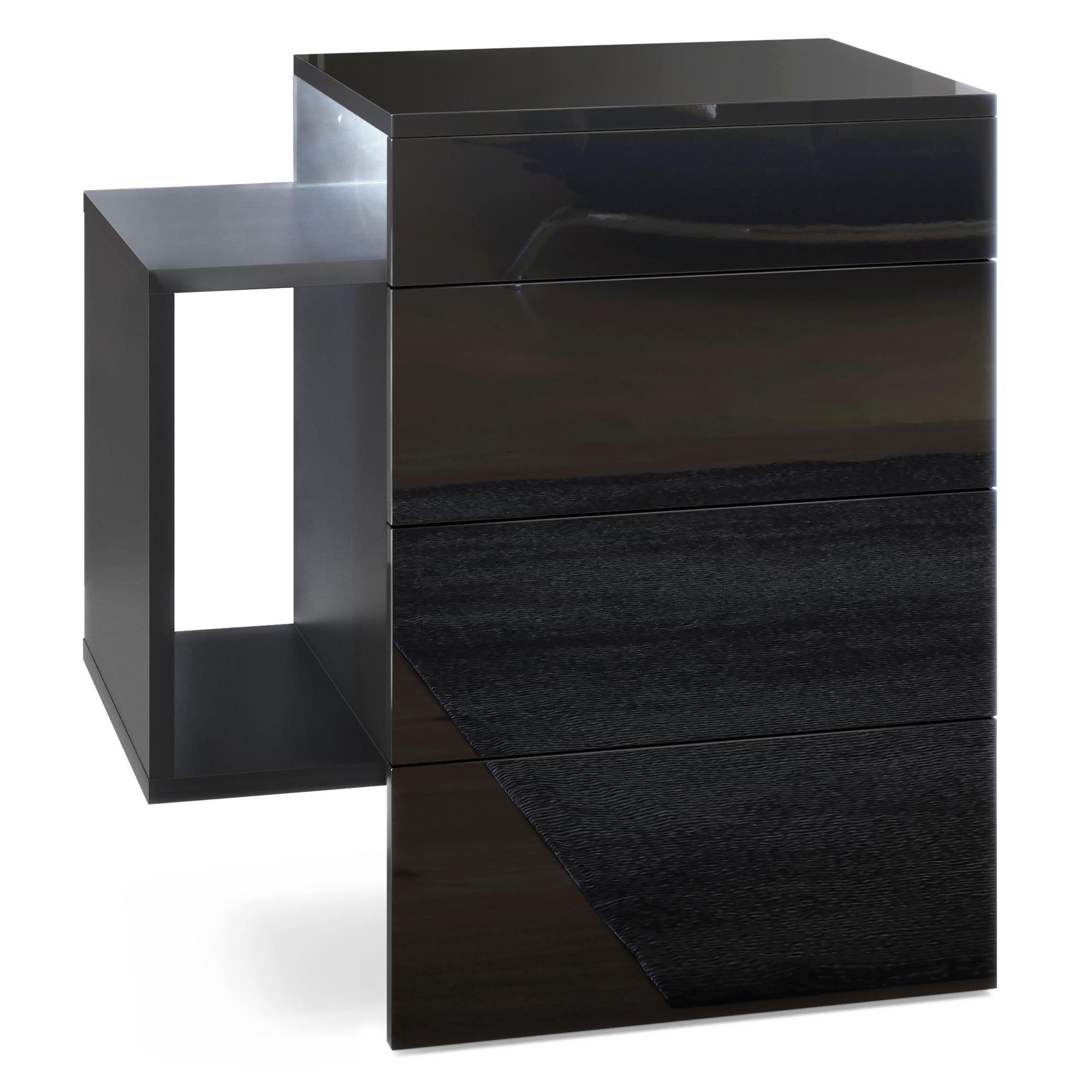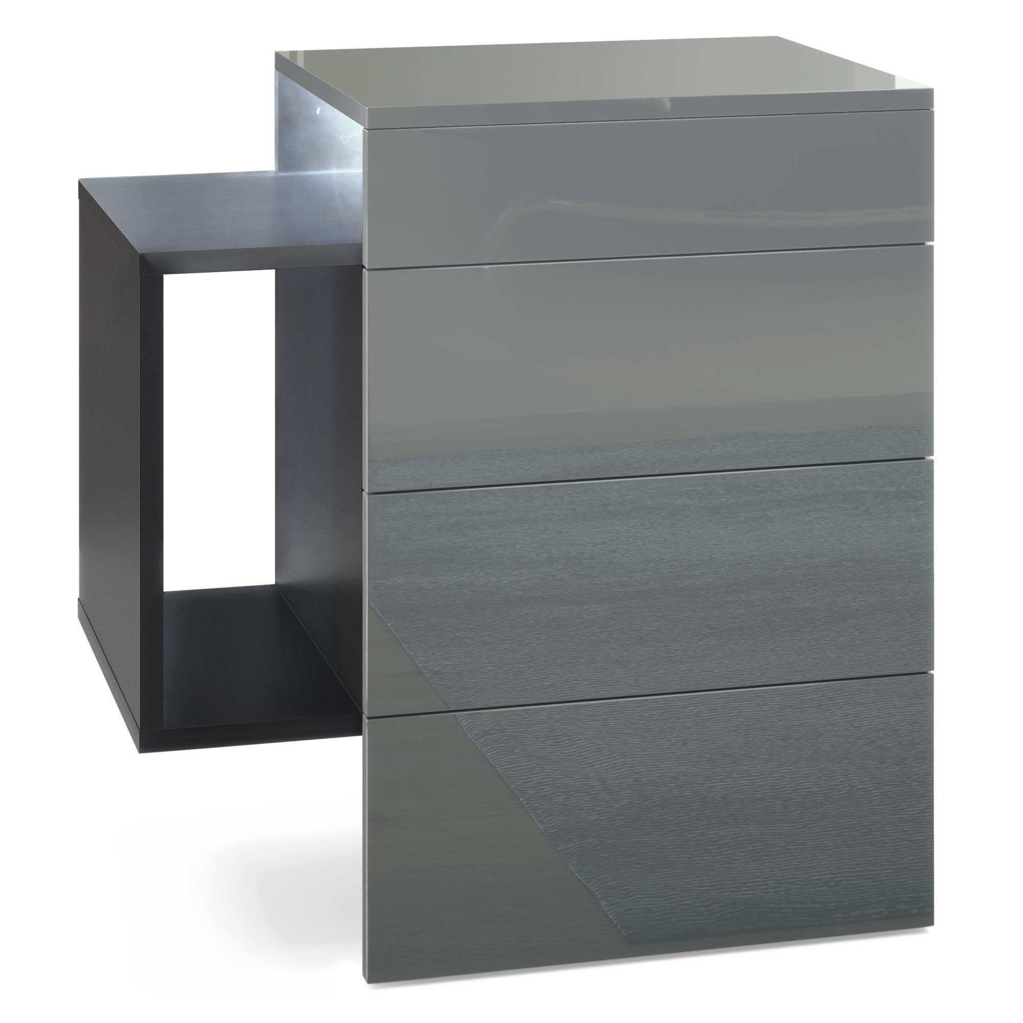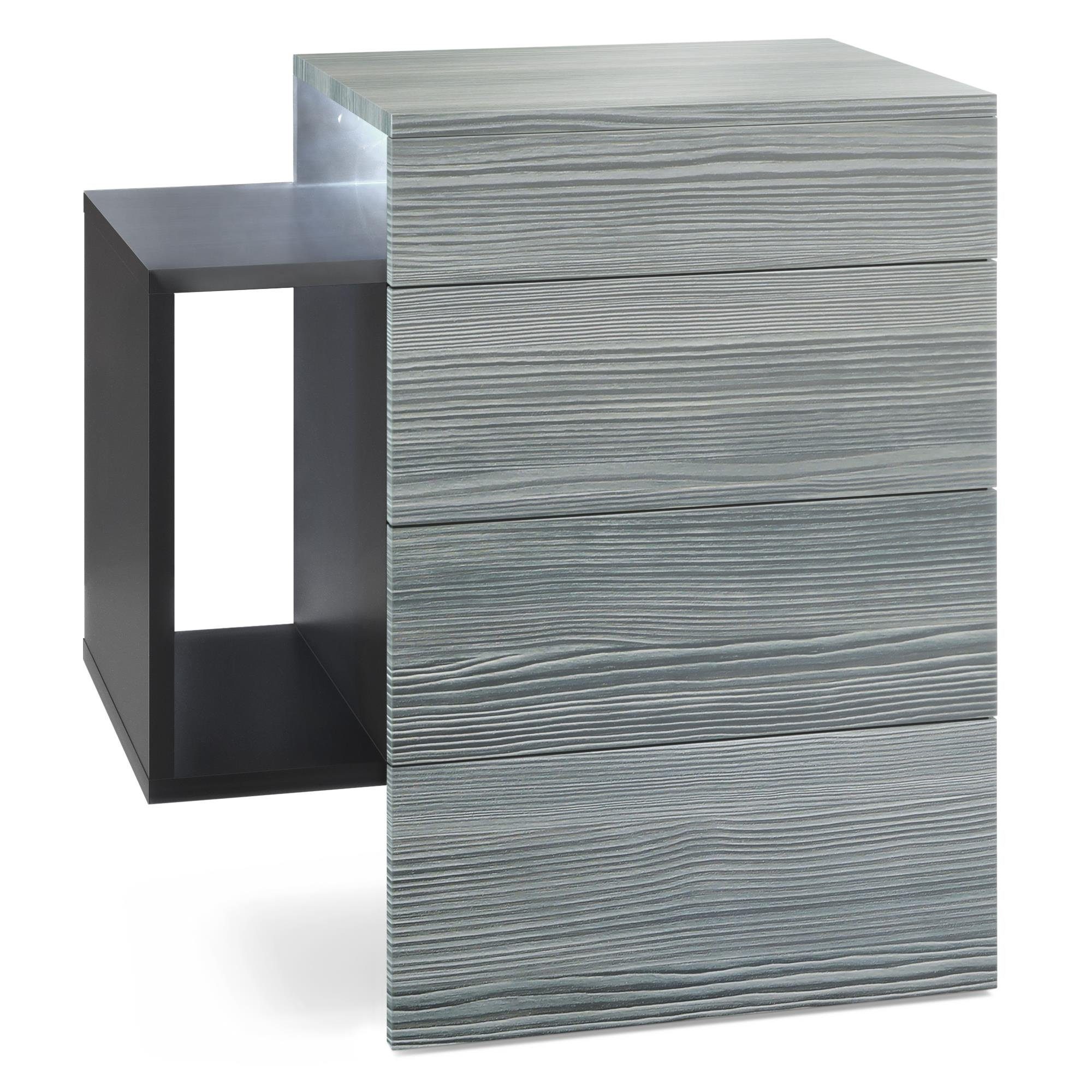 Der moderne Nachttisch Queens eignet sich perfekt für jedes Schlafzimmer. Dabei präsentiert sich der geräumige Beistelltisch mit Stauraum als praktisches Möbelstück mit modernem Design, hergestellt in Deutschland. Die schwebende Nachtkommode ist mit zwei Schubladen und einem seitlichen Ablagefach ausgerüstet. Das seitliche Fach ist beidseitig montierbar und die Schubladen sind mit unserem Push-to-Open System ausgestattet. Das Montagematerial für die Wandmontage ist im Lieferumfang enthalten. Eine Rückwand enthält die Nachtkonsole nicht.