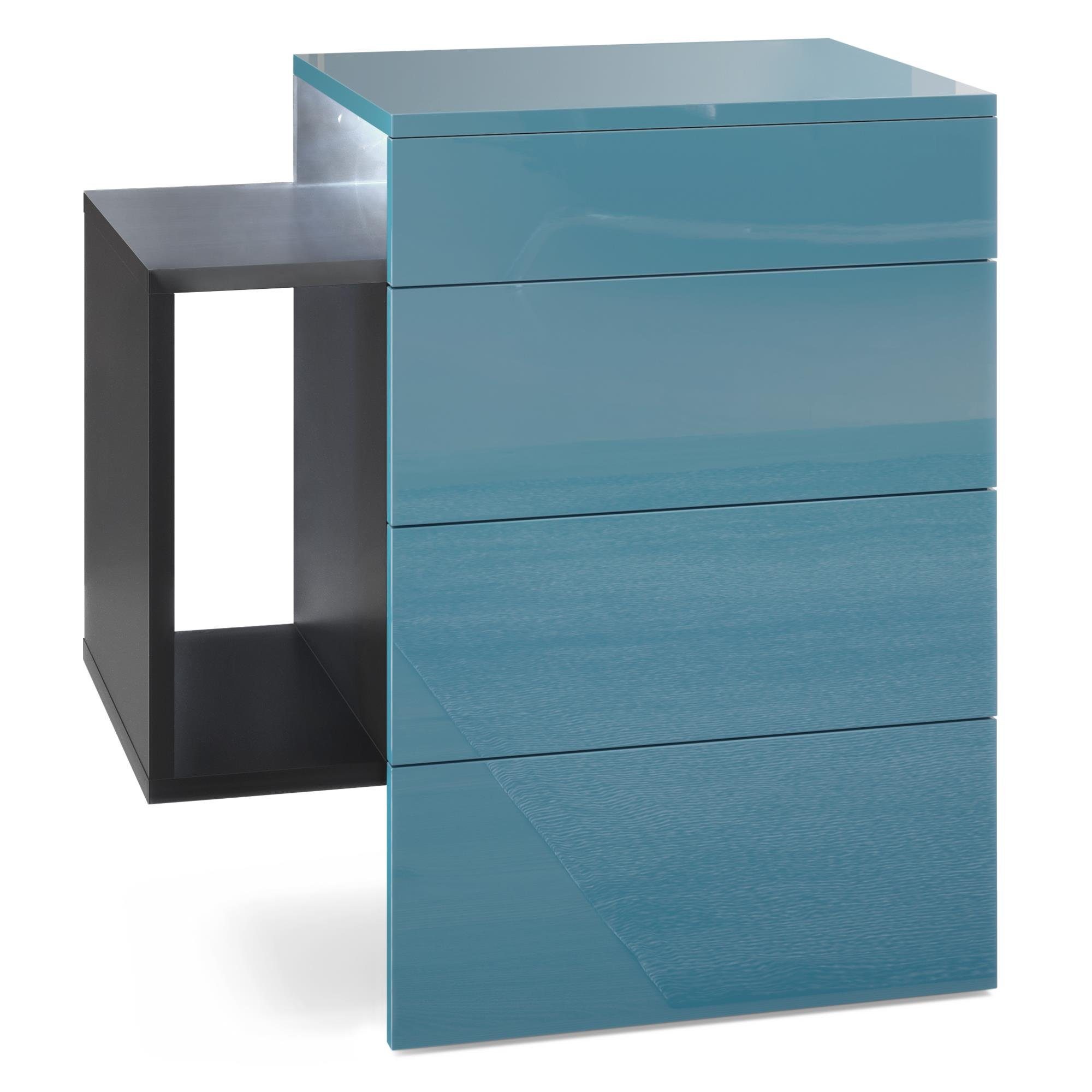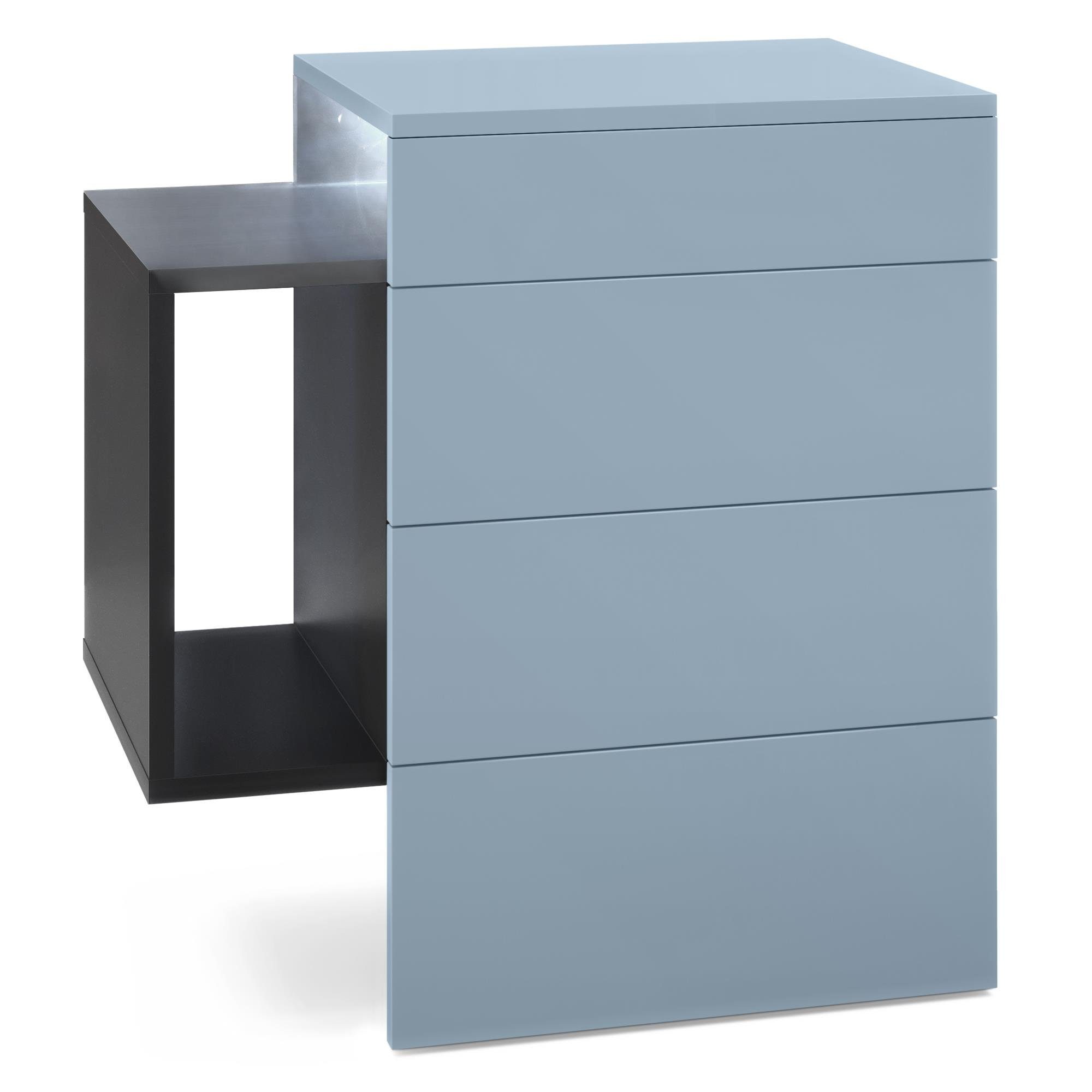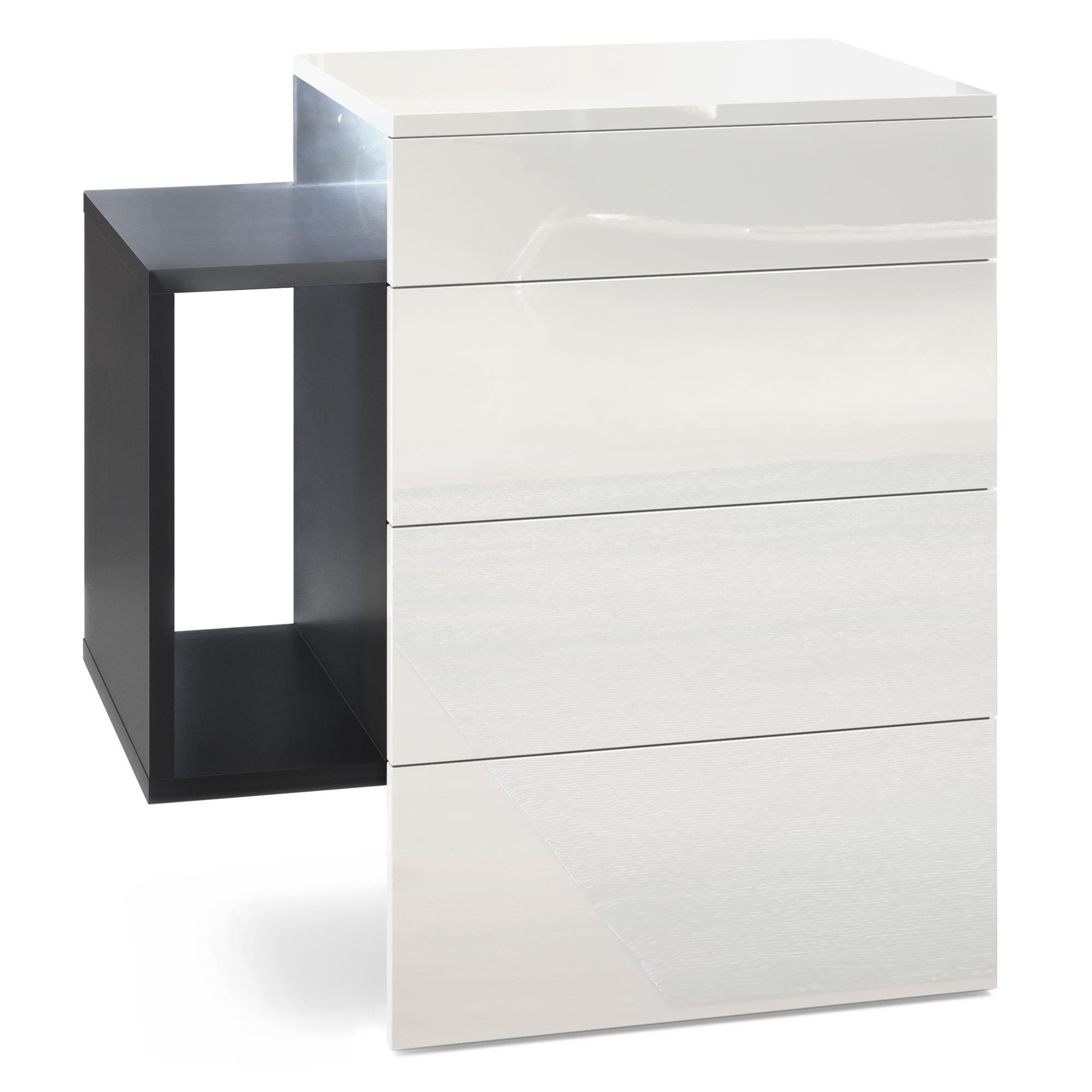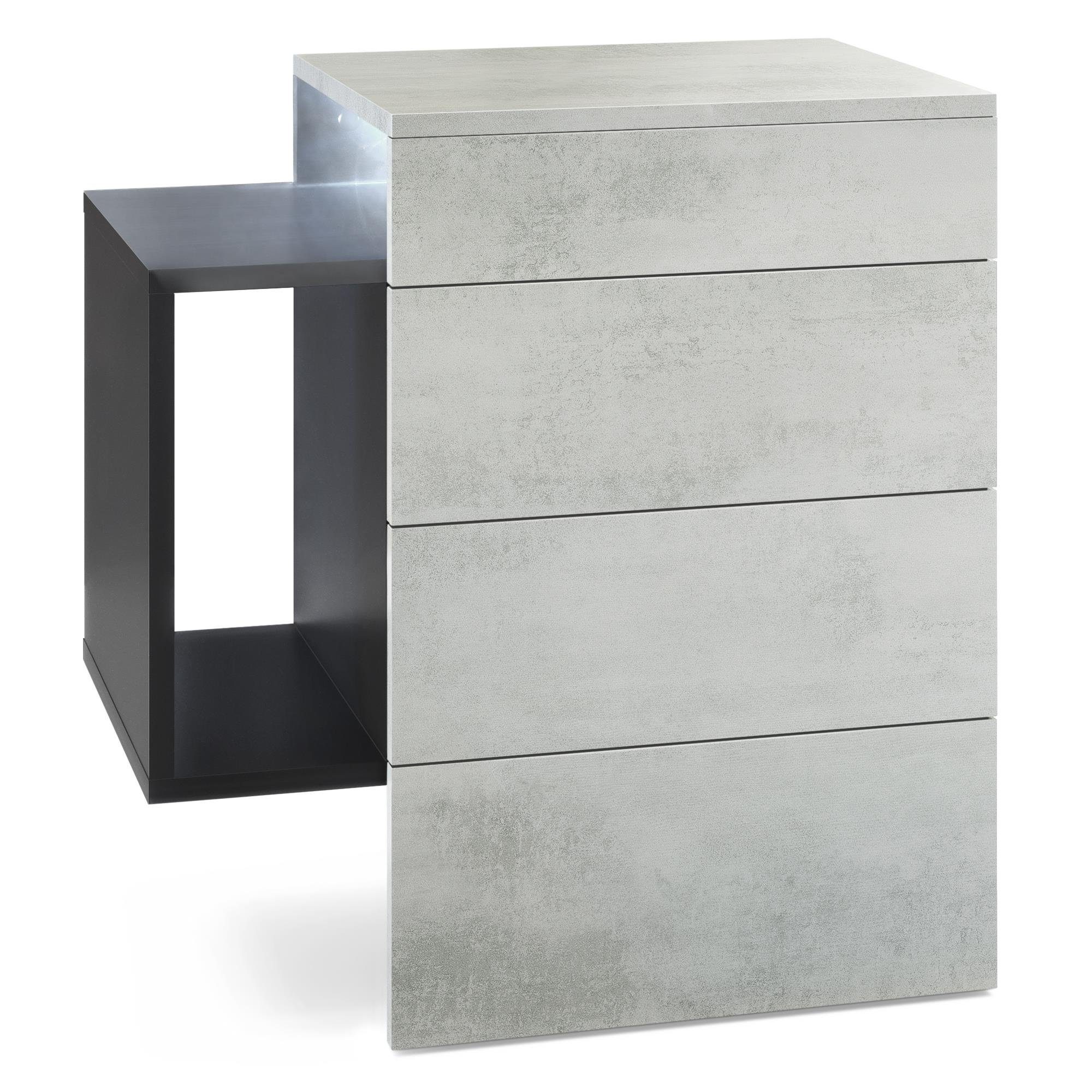Der moderne Nachttisch Queens eignet sich perfekt für jedes Schlafzimmer. Dabei präsentiert sich der geräumige Beistelltisch mit Stauraum als praktisches Möbelstück mit modernem Design, hergestellt in Deutschland. Die schwebende Nachtkommode ist mit zwei Schubladen und einem seitlichen Ablagefach ausgerüstet. Das seitliche Fach ist beidseitig montierbar und die Schubladen sind mit unserem Push-to-Open System ausgestattet. Das Montagematerial für die Wandmontage ist im Lieferumfang enthalten. Eine Rückwand enthält die Nachtkonsole nicht.