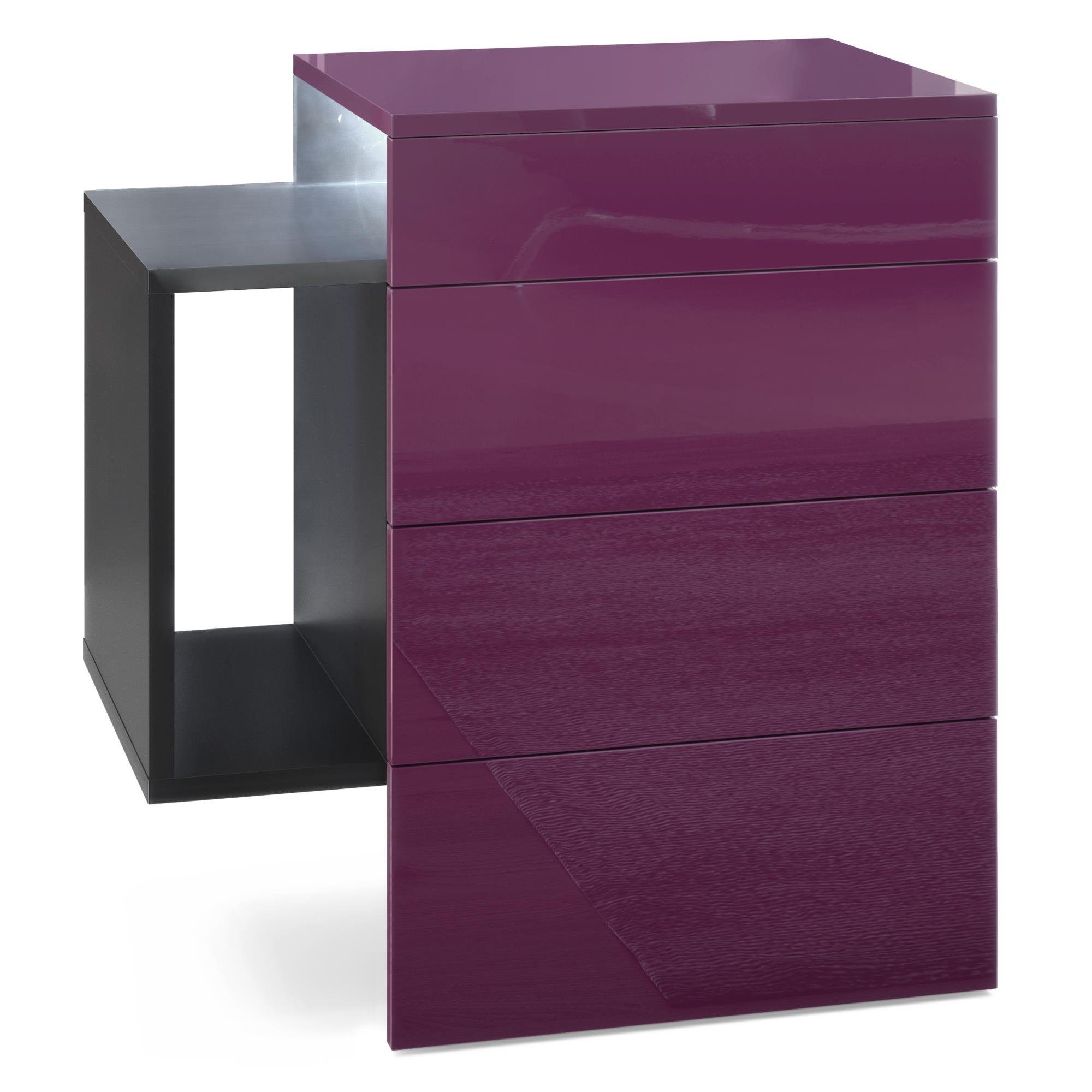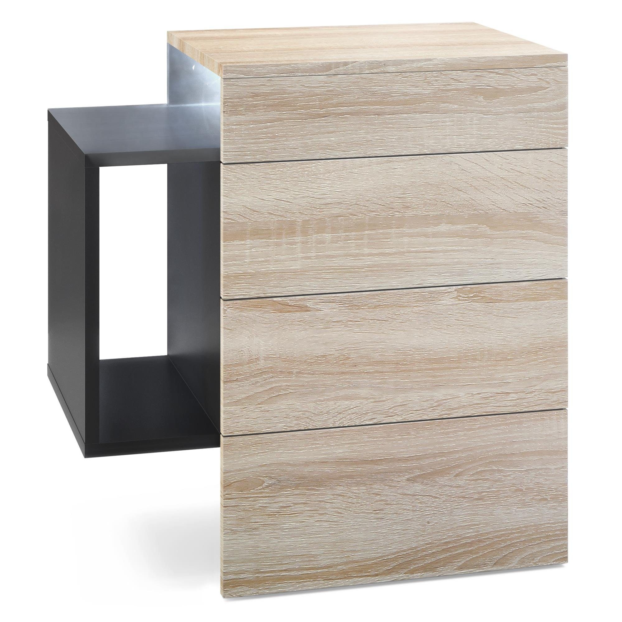 Durch das schlichte, moderne Design lässt sich das Nachtschränkchen mit vielen verschiedenen Einrichtungsstilen kombinieren und sowohl im Schlafzimmer beispielsweise als Nachtkästchen neben dem Boxspringbett, als auch in anderen Wohnräumen, z.B. als Beistelltisch oder Telefontisch, einsetzen. Für eine besondere Eleganz sorgen die Fronten des Nachtkastens, erhältlich in vielen verschiedenen Farbvarianten, die Ihnen eine Vielzahl an Kombinationsmöglichkeiten bieten. Durch die Oberflächenbeschichtung erhalten Sie ein besonders pflegeleichtes Produkt. Für die Reinigung können Sie auf Chemie verzichten - es reicht ein leicht angefeuchtetes Tuch, um die wasserfeste Oberfläche angemessen zu reinigen.