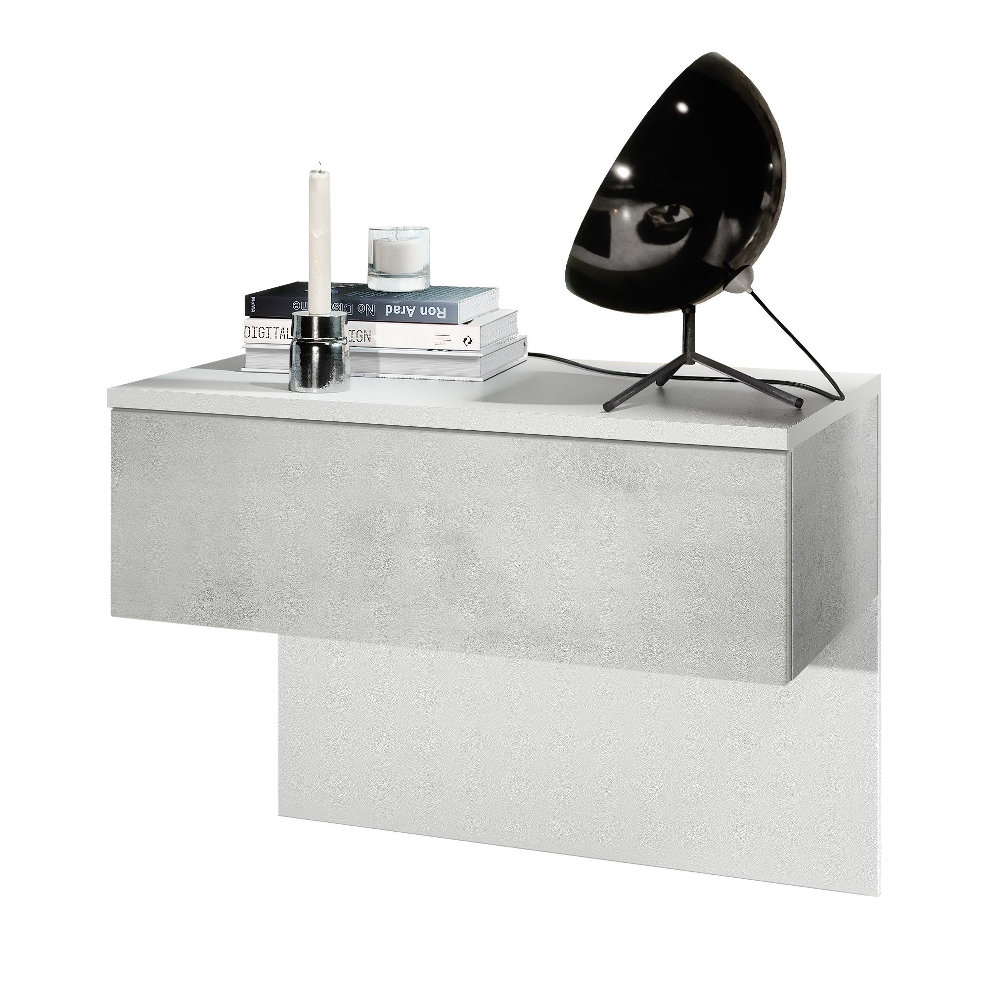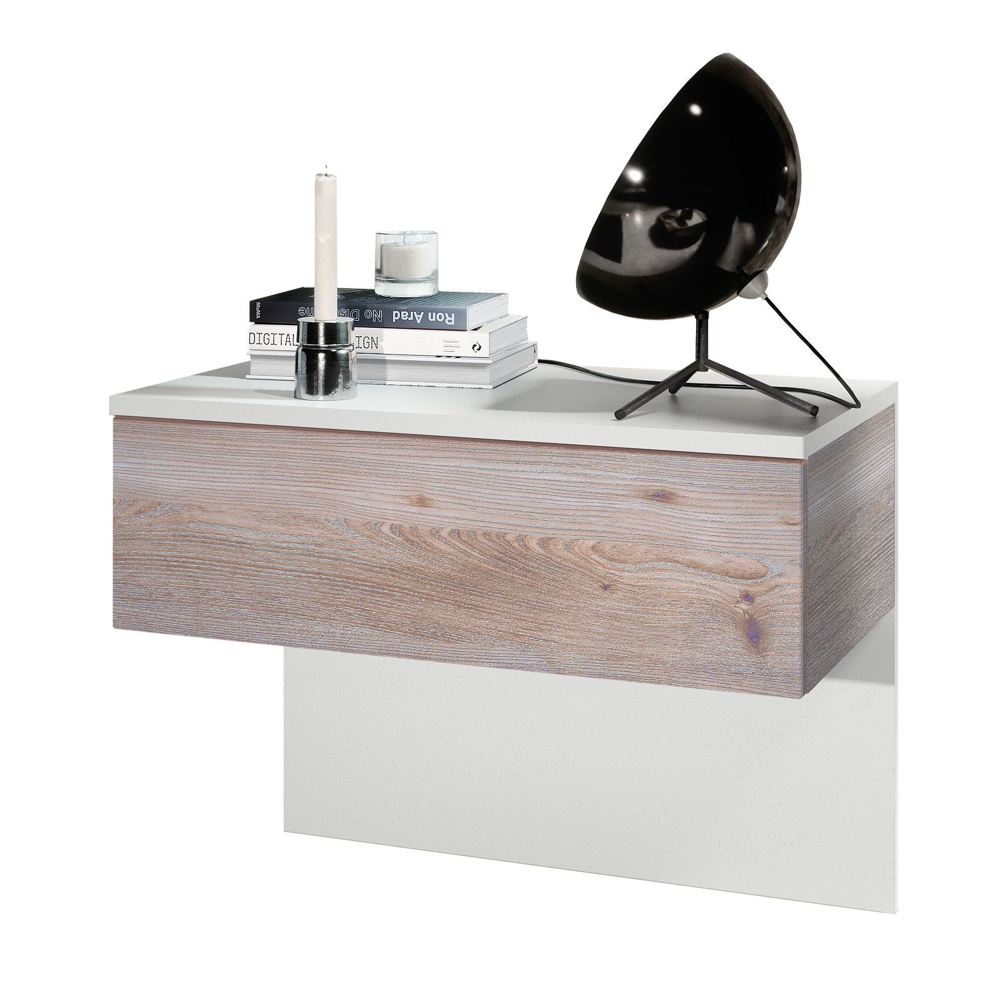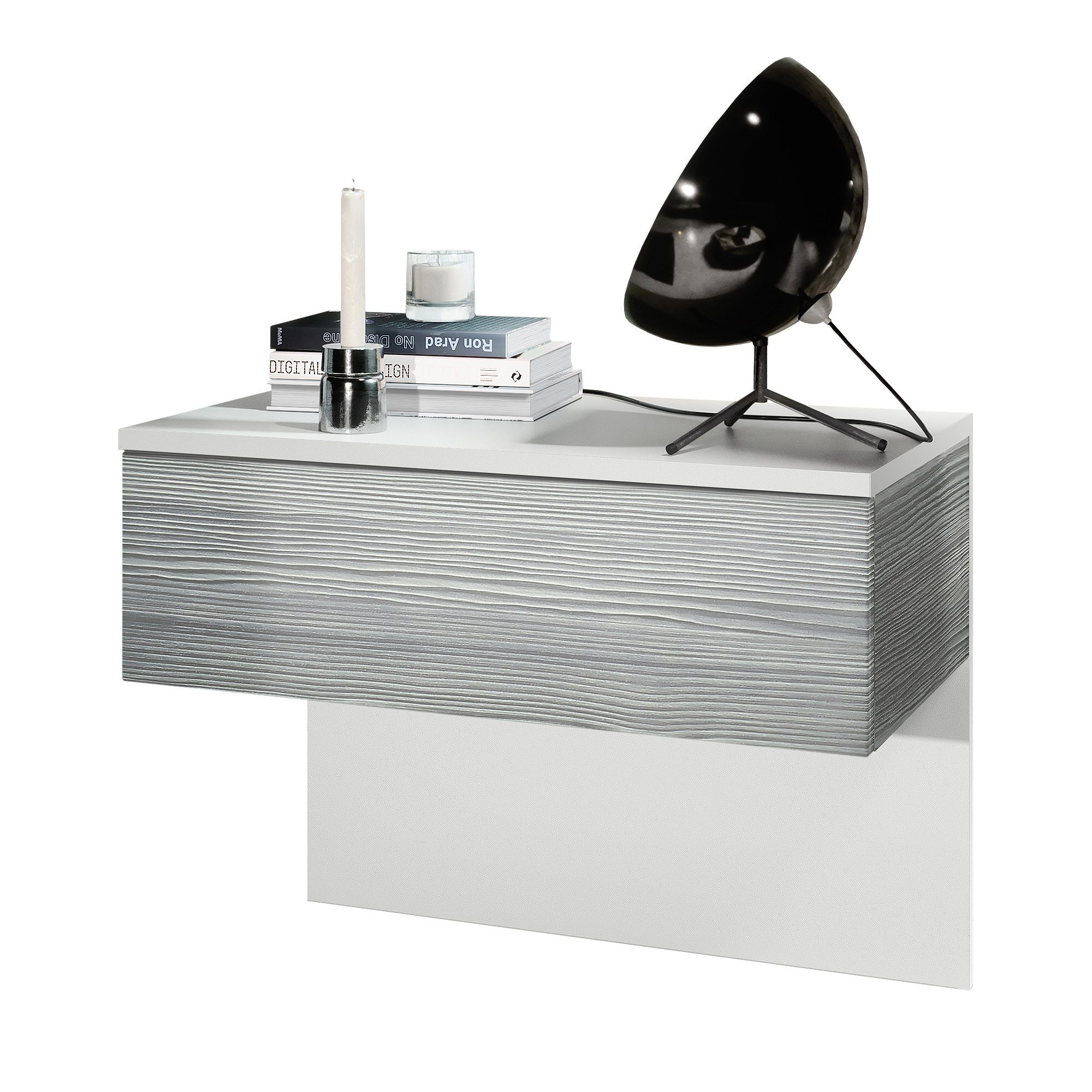 Der moderne Nachttisch Sleep eignet sich perfekt für jedes Schlafzimmer. Dabei präsentiert sich der geräumige Beistelltisch mit Stauraum als praktisches Möbelstück mit modernem Design, hergestellt in Deutschland. Der schwebende Nachttisch ist mit einer Schublade ausgerüstet und optional mit einem LED-Unterbaustrahler erhältlich. Das Montagematerial für die Wandmontage, sowie die hintere Blende aus Pressspan in Holzoptik, die gleichzeitig als Rückwand dient, sind im Lieferumfang enthalten.