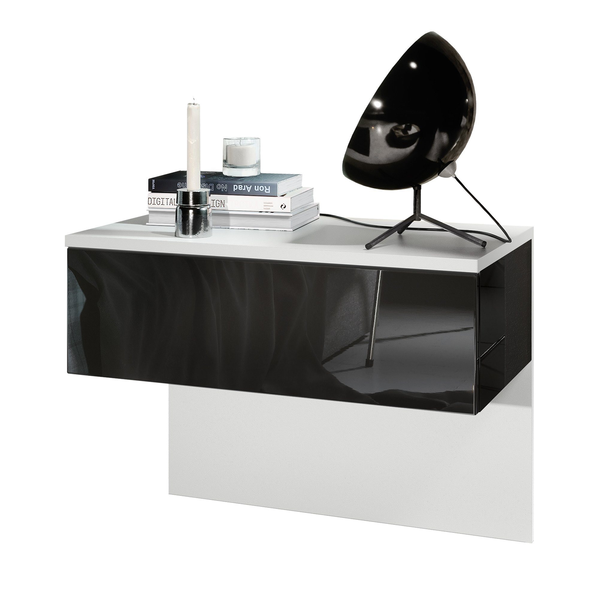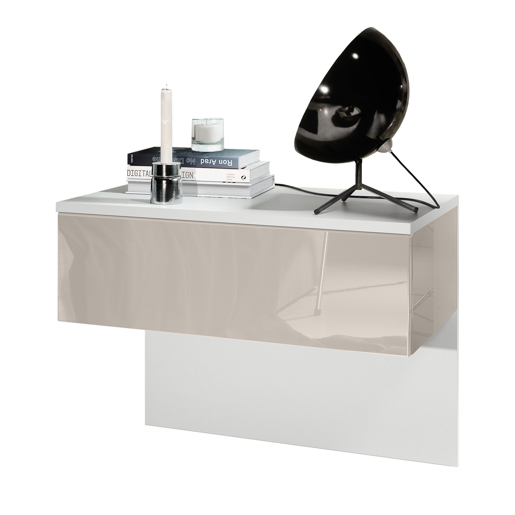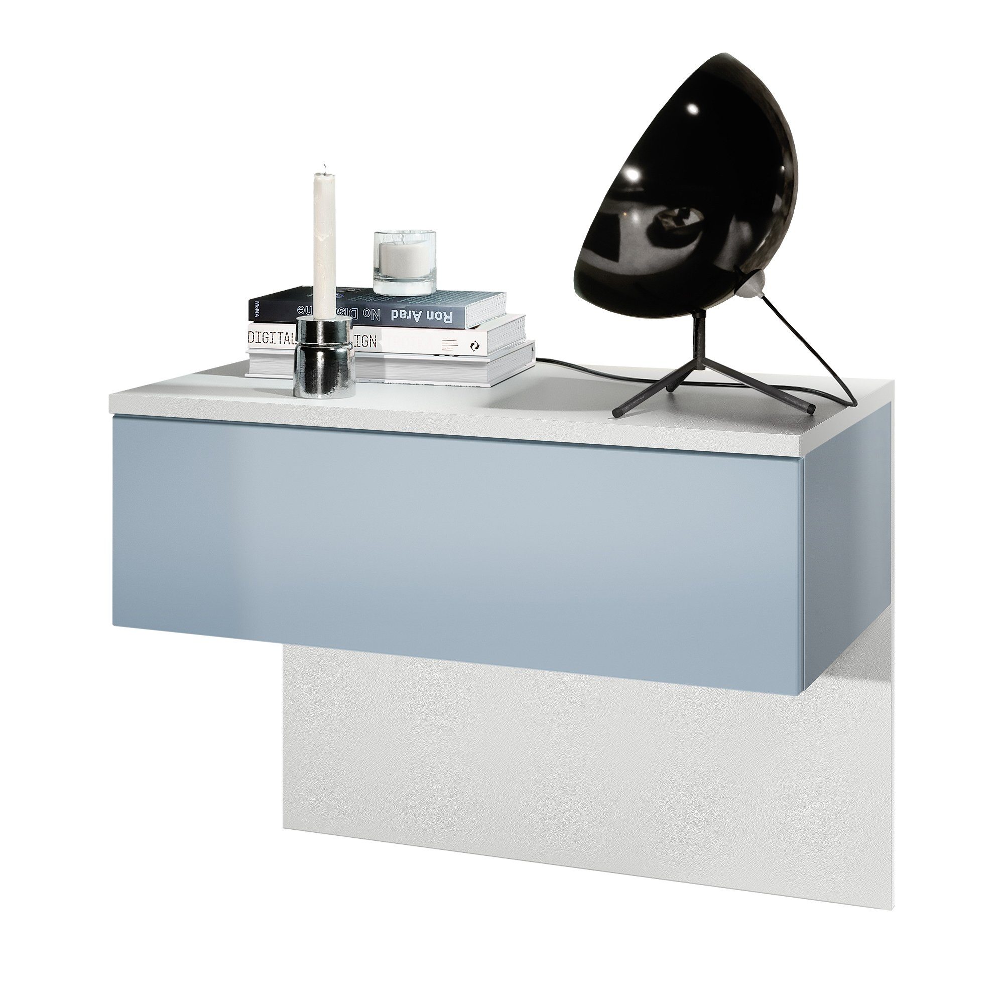 Der moderne Nachttisch Sleep eignet sich perfekt für jedes Schlafzimmer. Dabei präsentiert sich der geräumige Beistelltisch mit Stauraum als praktisches Möbelstück mit modernem Design, hergestellt in Deutschland. Der schwebende Nachttisch ist mit einer Schublade ausgerüstet und optional mit einem LED-Unterbaustrahler erhältlich. Das Montagematerial für die Wandmontage, sowie die hintere Blende aus Pressspan in Holzoptik, die gleichzeitig als Rückwand dient, sind im Lieferumfang enthalten.